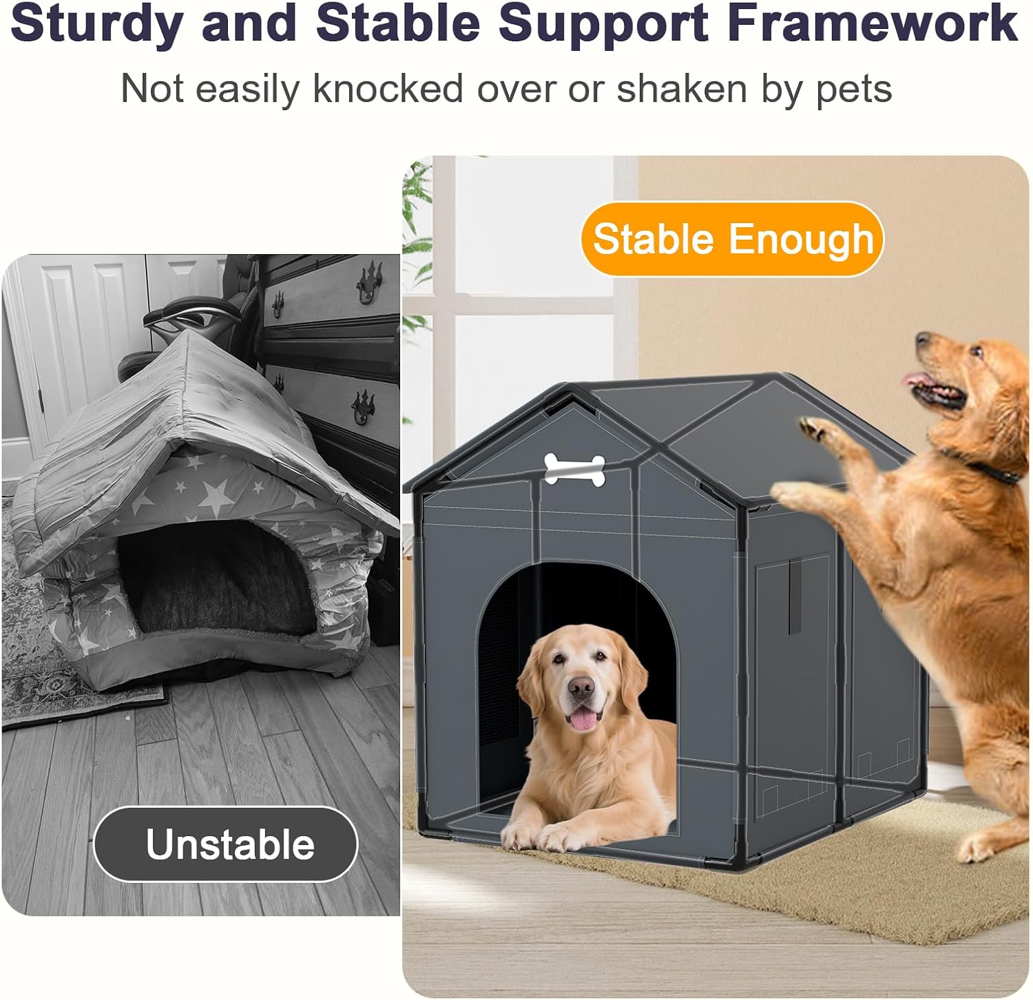 About this item Extra Large Indoor Dog House: The size of our extra large dog house is 33.9”L x 26.8”W x 33.9”H, which is suitable for large dogs (such as Labrador Retrievers, Golden Retrievers, German Huskies, Dobermann Dogs, Boxer Dogs, Rowena Dogs, etc.) Durable and Sturdy Frame: Our frame is made of PVC reinforced hard pipes, which are more stable and durable compared to traditional frames, and are less prone to collapse Internal Waterproof Fabric: The surface is made of thickened high elasticity Oxford fabric, and the interior of the fabric is coated with PU waterproof coating, which can be wiped clean even if your pet gets wet inside Double Sided Dog Bed: We provide a soft cushion inside that is suitable for all seasons. The plush side can keep your pet warm in autumn and winter, while the Oxford cloth side can keep your pet cool in spring and summer Ventilation Windows on Both Sides: When you want ventilation, you can roll up the curtains on both sides of the dog house. When thunderstorms or fireworks are set off outside, your dog may feel scared. You can lower the curtains on both sides of the dog house to give your dog a safe and private environment › See more product details