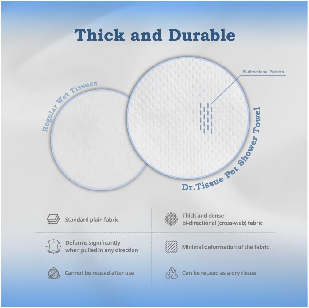 Maywell's Dr.Tissue's Bathing Towels for pets are the safe, hygienic and convenient solution to your daily bath routine of your pets. Not only are our individually pacakged towels convenient and hygienic especially for outdoor activities, but our hypoallergenic, EWG-green certified ingredients such as soap aloe and hyaluronic acid go beyond the purpose of a regular bath to nourish your beloved pets. 20.5" x 12.6" towels are big and thick enough to cleanse all sizes of pets and are permanently recyclable for various purposes.