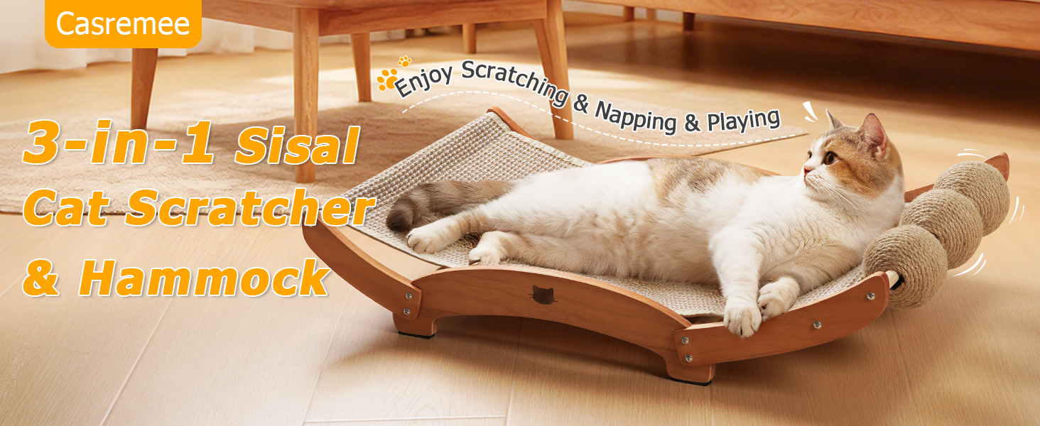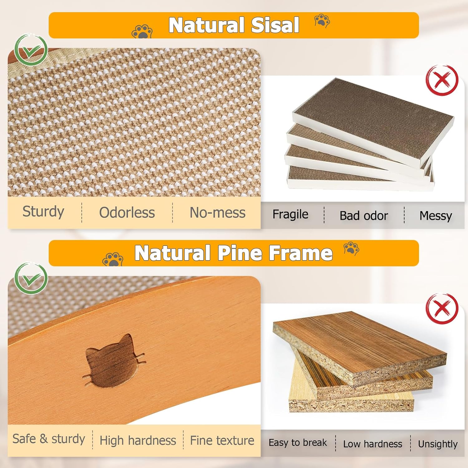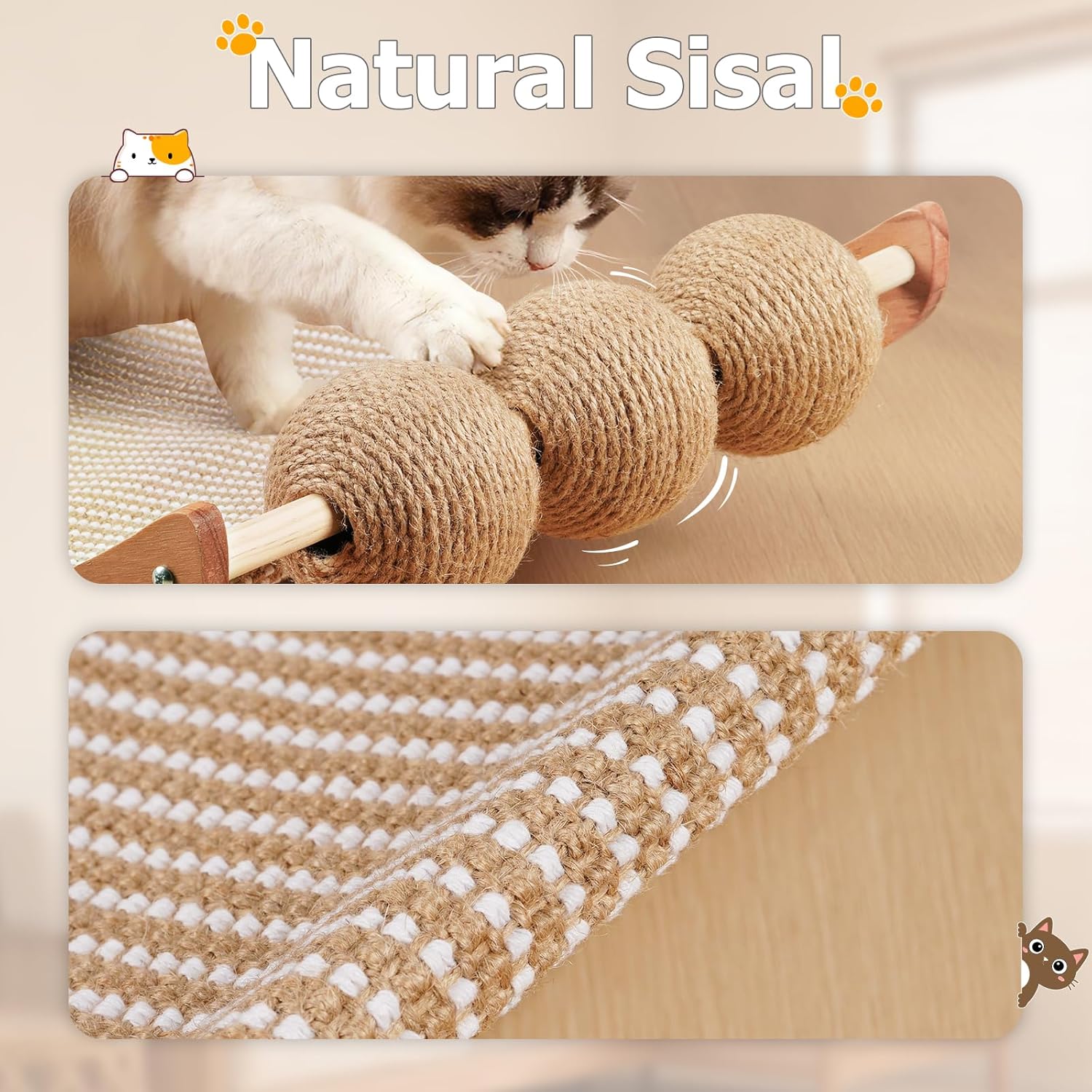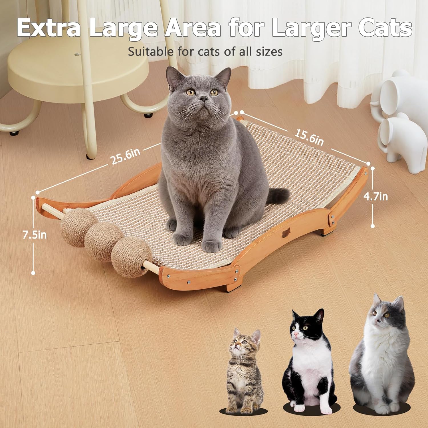About this item Extra Large for Spacious Comfort: Upgraded & extended cat scratcher bed measures 25.6"(L)x15.5(W)x7.5"(H), specially designed for large cats or multi-cat households, allowing your cat to have a dedicated resting and scratching area while protecting your furniture from scratching. Say goodbye to scratched furniture! 3-in-1 Cat Scratcher Bed: Our 3-in-1 cat scratcher bed serves as a cat bed, scratch pad, and hammock all in one. It offers a cozy space for indoor cats to scratch, stretch, nap, and play. Additionally, the modern cat scratcher complements any home décor, whether in the living room, bedroom, or even on the garden patio. Solid Pine Wood Frame: Crafted from premium solid pine wood frame, this cat scratching bed is built to last and friendly for cats. With reinforced double-layer sticks support, it can withstand the frequent jumping of cats without breaking and supports weights of 45 lbs, blending both comfort and durability. Natural Sisal Scratching Pad: The scratching pad is made of all natural sisal, not only satisfying cats' innate scratching instinct but also helping keep their claws sharp and healthy by removing the outer layer of dead claws. Unlike cardboard or fabric, sisal is less likely to shed or fray, ensuring long-term use. Sisal Cat Ball Toys for Added Fun: This cat scratching bed comes with 3 sisal cat ball toys, cats can enjoy interactive play with balls while they're lying on it. Easy to install with all tools needed, simply follow the clear step-by-step instructions to install the cat scratcher within 10 minutes. › See more product details