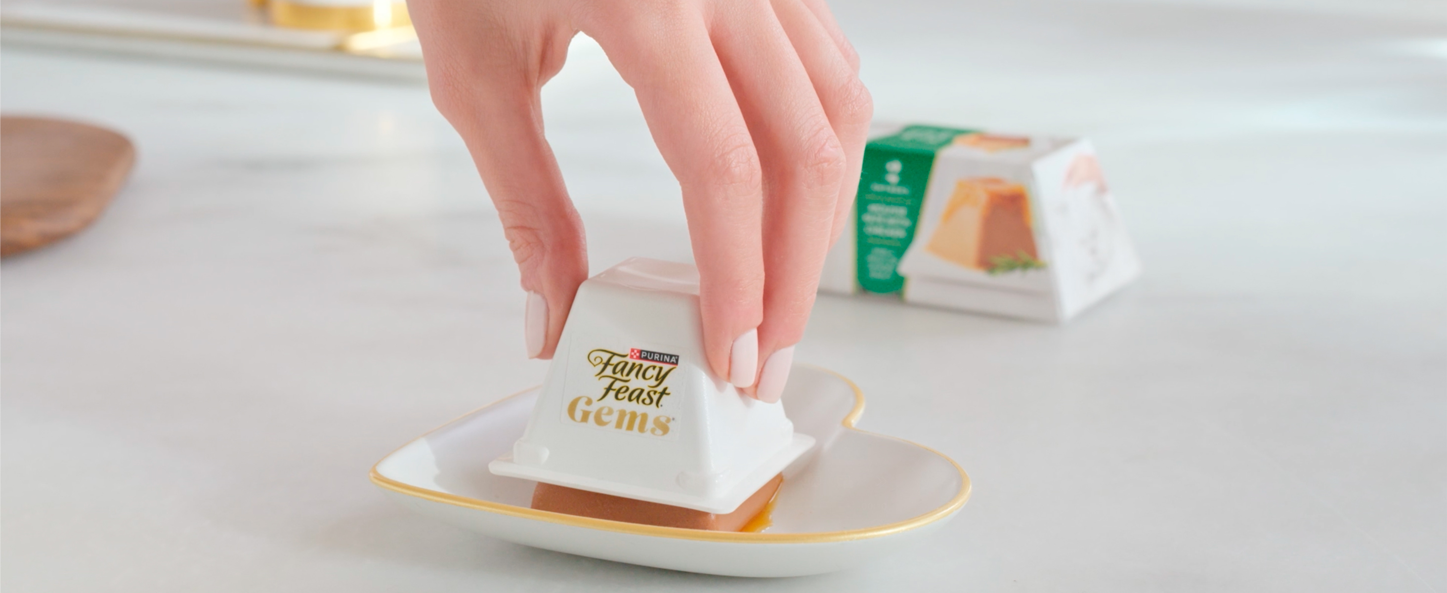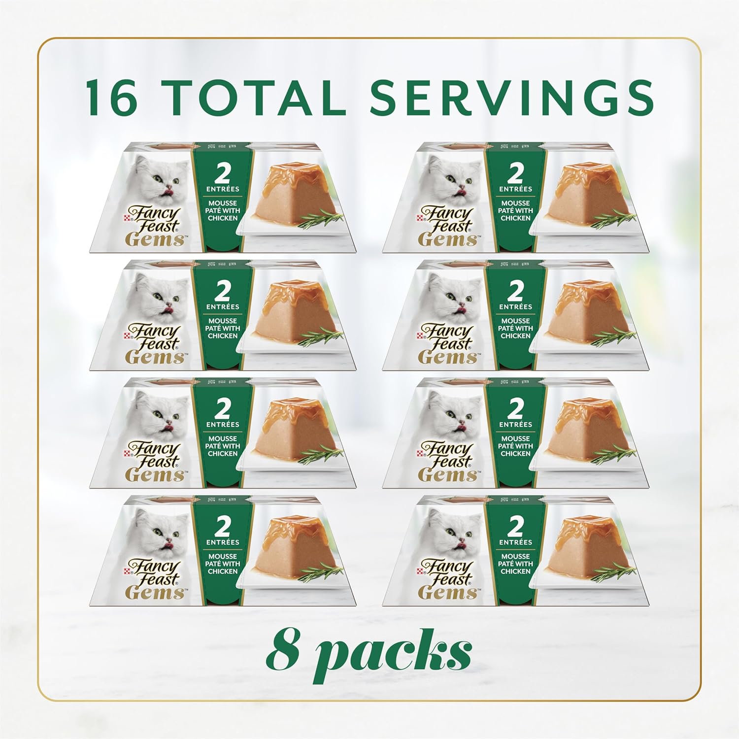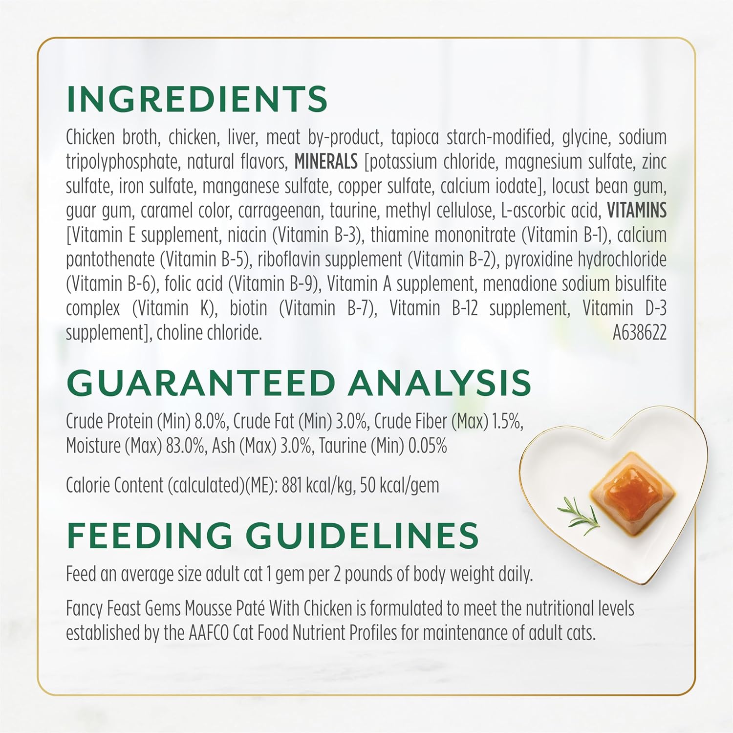 Introducing our most elevated mealtime experience yet: Fancy Feast Gems Mousse with Chicken Wet Cat Food Pate With a Halo of Savory Gravy. This mouthwatering mousse cat food is topped with wet cat food gravy, creating a cascade of savory cat gravy that transforms mealtime into marvelous. Crafted with high-quality chicken, this pate wet cat food in a pyramid-shaped cat pate that makes eating delightful for cats. Each serving peels and plates easily with two servings in every pack to turn everyday into the extraordinary with our most exquisite eating experience yet. Your cat deserves a meal as unique as they are, so serve them a Fancy Feast Gems Pate today. Every Fancy Feast Wet Cat Food meal is thoughtfully crafted and tested for quality and safety in Purina-owned facilities. Feeding your cat is an opportunity to bring you and your cat closer together, which is why Fancy Feast has dedicated more than 30 years to developing gourmet recipes for cats and their owners to explore together.