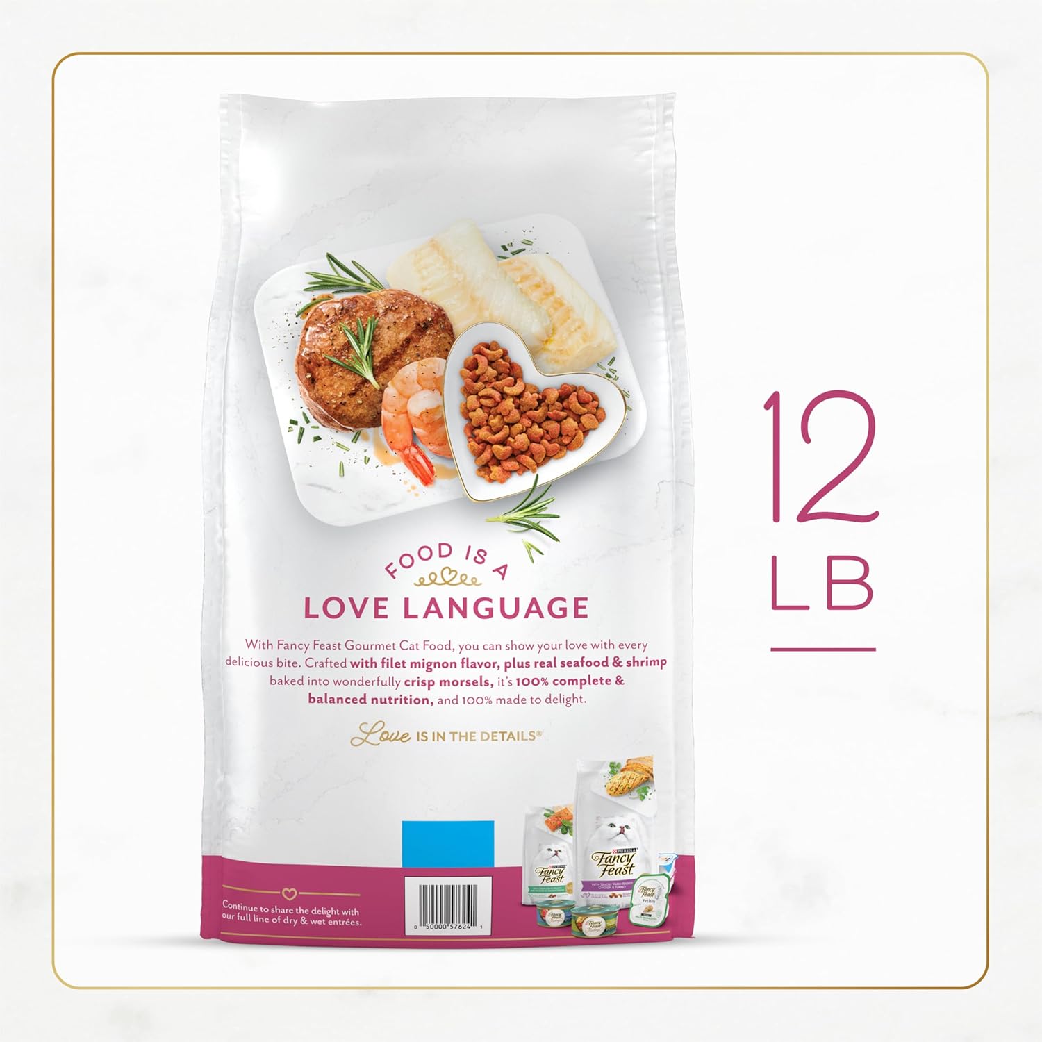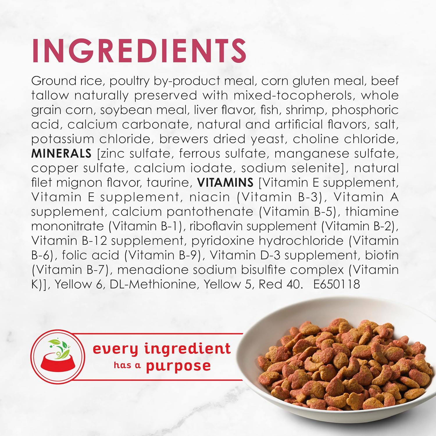 Delight your cat with the flavored cat kibble morsels lightly cooked and basted into a delicate, crunchy finish in each serving of Fancy Feast Dry Cat Food Filet Mignon Flavor with Salmon and Shrimp. A deliciously savory premium dry cat food, this recipe is 100 percent nutritionally complete and balanced while offering a deliciously savory gourmet filet mignon flavor with salmon and shrimp for cats. Each delectable bite of this soft dry cat food provides essential vitamins for cats, plus minerals to help support feline health so your cat can flourish. Watch as your cat enthusiastically scampers over every time these Fancy Feast dry tender cat food morsels hit her dish and know you’re giving your lovable feline the nutrition she needs to be her best. To ensure the highest quality standards, Fancy Feast dry cat food is produced using sustainable ingredients in Purina-owned facilities.