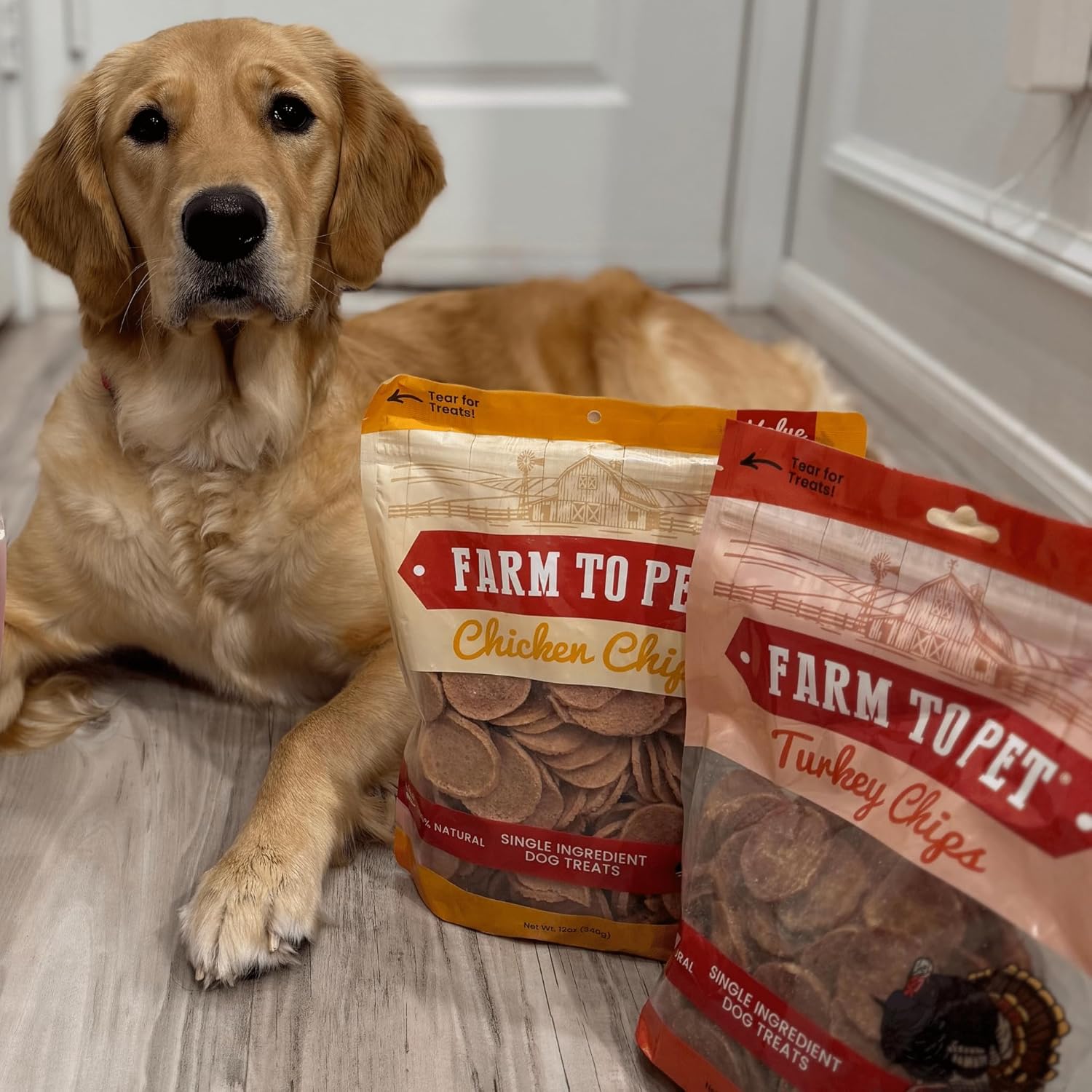 About this item VALUE & VARIETY: Try Farm to Pet's most popular Dog Treats: their Chicken and Turkey Chips. Each are made with ONLY 1 ingredient - so your furry friends can enjoy the healthy treats they deserve without worrying about what’s inside. The low fat dog snacks are made in the USA, & sourced from 100% human-grade chicken or turkey breast meat. They are more nutritious than jerky or baked treats and NEVER contain unhealthy by-products, or fillers. Chicken or turkey, what's your pup's pick? SENSITIVE STOMACH DOG TREATS: Do you have a picky eater who has a sensitive stomach when it comes to most dog food or treats? Not for long! Our organic, healthy dog chew treats are easy on the stomach and heavy on the flavor and nutrients due to their superior absorption rate. With only a single ingredient and no preservatives or additives, your search for doggie treats for sensitive stomachs is over! PUPPY TRAINING TREATS: Our chicken & turkey chips for dogs are ideal as dog obedience training treats as they break apart easily into smaller pieces. Dogs & puppies crave protein & respond enthusiastically to it, so we made our training treats for your puppy high in protein & low in calories to encourage healthy training sessions. Whether you need puppy treats for training or reinforcement treats for older dogs our natural puppy treats are the perfect portable, travel ready training dog treats! TREATS FOR ALL BREEDS & SIZES: Searching for the ideal puppy training treats? Or dog treats for small to medium dogs? Or do you need a treat that is great for overweight or large dogs?? Don’t worry! Our irresistibly crunchy Chicken and Turkey chips are healthy and loved by all breeds and sizes! Your four-legged friends won’t be able to keep their paws off - thousands of other dogs agree! FARM TO PET: It starts with free range, certified humane & responsibly sourced poultry from farms in the USA. From there, 100% of our natural, human grade, dog treats are produced using our signature preparation, dehydration & inspection processes to create the perfect aroma & texture we know dogs love. Farm to Pet makes 100% of their products in their owned facility to ensure the highest quality standards for your dog. › See more product details