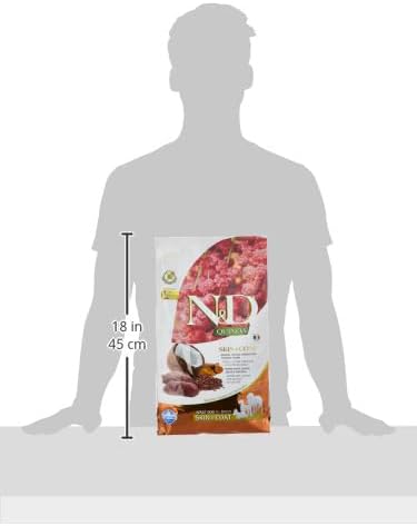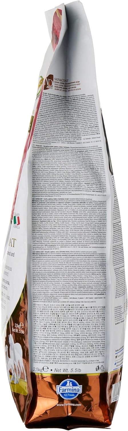 N&D Quinoa SKIN&COAT - Venison, quinoa, coconut and turmeric recipe for adult dogs is formulated to meet the nutritional levels established by the AAFCO Dog Food Nutrient Profiles for maintenance. ingredients venison, dehydrated venison, pea starch, herring oil, quinoa seed, linseed, dried coconut, turmeric, inulin, fructooligosaccharide, yeast extract, calcium carbonate, dicalcium phosphate, psyllium seed husk, potassium chloride, salt, brewers dried yeast, glucosamine hydrochloride, chondroitin sulfate, vitamin A supplement, vitamin D3 supplement, vitamin E supplement, ascorbic acid, niacin, calcium pantothenate, riboflavin, pyridoxine hydrochloride, thiamine mononitrate, biotin, folic acid, vitamin B12 supplement, choline chloride, beta-carotene, zinc methionine hydroxy analogue chelate, manganese methionine hydroxy analogue chelate, ferrous glycine, copper methionine hydroxy analogue chelate, selenium yeast, DL-Methionine, taurine, L-Carnitine, aloe vera gel concentrate, green tea extract, rosemary extract, mixed tocopherols (a preservative). ingredients and nutrition Supplemental information Nutritional additives: Vitamin A 15000IU; Vitamin D3 1500IU; Vitamin E 600mg; Vitamin C 150mg; Niacin 37.5mg; pantotenic acid 15mg; Vitamin B2 7.5mg; Vitamin B6 6mg; Vitamin B1 4.5mg; Vitamin H 0.38mg; folic acid 0.45mg; Vitamin B12 0.1mg; choline chloride 2500mg; Beta-carotene 1.5mg; zinc chelate of the analogous methionine hydroxylase 910mg; manganese chelate of the analogous methionine hydroxylase 380mg; ferrous chelate of glycine hydrate 250mg; copper chelate of the analogous methionine hydroxylase 15.8mg; selenised yeast inactivated 0.40mg; DL-methionine 4000mg; taurine 1000mg; L-carnitine 300mg. Organoleptic additives: aloe vera extract 1000mg; green tea extract 100mg; rosemary extract. Antioxidants: tocopherol-rich extracts of natural origin. guaranteed analysis crude protein (min): 23.00%; crude fat (min): 12.00%; crude fiber (max): 2.80%; moisture (max): 9.00%; ash (max): 7.90%; Docosahexaenoic Acid (DHA) (min): 0.20%; Eicosapentaenoic Acid (EPA) (min): 0.10%; calcium (min): 1.10%; phosphorus (min): 0.90%; Omega-6 Fatty Acids* (min): 2.20%; Omega-3 Fatty Acids* (min): 0.40%; Glucosamine hydrochloride* (min): 1200mg/kg; Chondroitin sulfate* 900mg/kg. *Not recognized as an essential nutrient by the AAFCO Dog Food Nutrient Profiles. energy value EM Kcal/lb 1662 - Mj/lb 6.95 367 Kcal/cup KIBBLE COLOR DISCLAIMER Sometimes, the external appearance of the food may change in the different production batches since we only use natural ingredients, sometimes there may be variability in their color that is reflected also in the kibbles. Same animal species could have different meat colors, darker or lighter, and this is reflected in the kibbles color. Farmina does not use any artificial color to uniform different batches. Therefore, the occurrence of different shades of color in the kibbles is normal and does not affect the quality of the food, or its nutritional characteristics. For any further clarification don't hesitate and get in touch with your Genius Consultant. KIBBLE SIZE All the kibbles have a range for size, to ensure a correct fragmentation of the food. Although it is a rare occurrence, sometimes minimal variations inside the same bag are possible. As far as the kibbles are within the control range, everything is normal and as it should be. If you notice some kibbles out of the below ranges, please get in touch with your Genius Consultant because you could be eligible for the 100% Guarantee policy. KIBBLES SIZES: STARTER: Diameter 5-7 mm - Thickness: 4-5 mm PUPPY MINI: Diameter 8-10 mm - Thickness 4-6 mm PUPPY MEDIUM-MAXI: Diameter 12-14 mm - Thickness 5-7 mm ADULT MINI: Diameter 8-10 mm - Thickness 4-6 mm ADULT MEDIUM-MAXI: Diameter 14-17 mm - Thickness 8-10 mm ADULT MAXI-GIANT: Diameter 19-21 mm - Thickness 11-13 mm QUINOA MINI: Diameter 8-10 mm - Thickness 4-6 mm QUINOA MEDIUM-MAXI & UNIVERSAL KIBBLE: Diameter 12-14 mm - Thickness 5-7 mm KITTEN: Diameter 5-7 mm - Thickness: 4-5 mm FELINE ADULT: Diameter 8-10 mm - Thickness 3.5-5.5 mm Bag 5.5lb 15.4lb