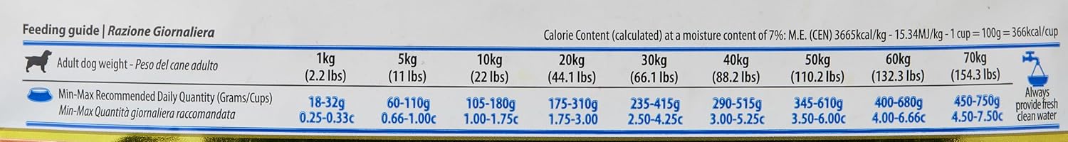 - Directions: Measure appropriate amount based on dog's weight and divide into two meals per day.
