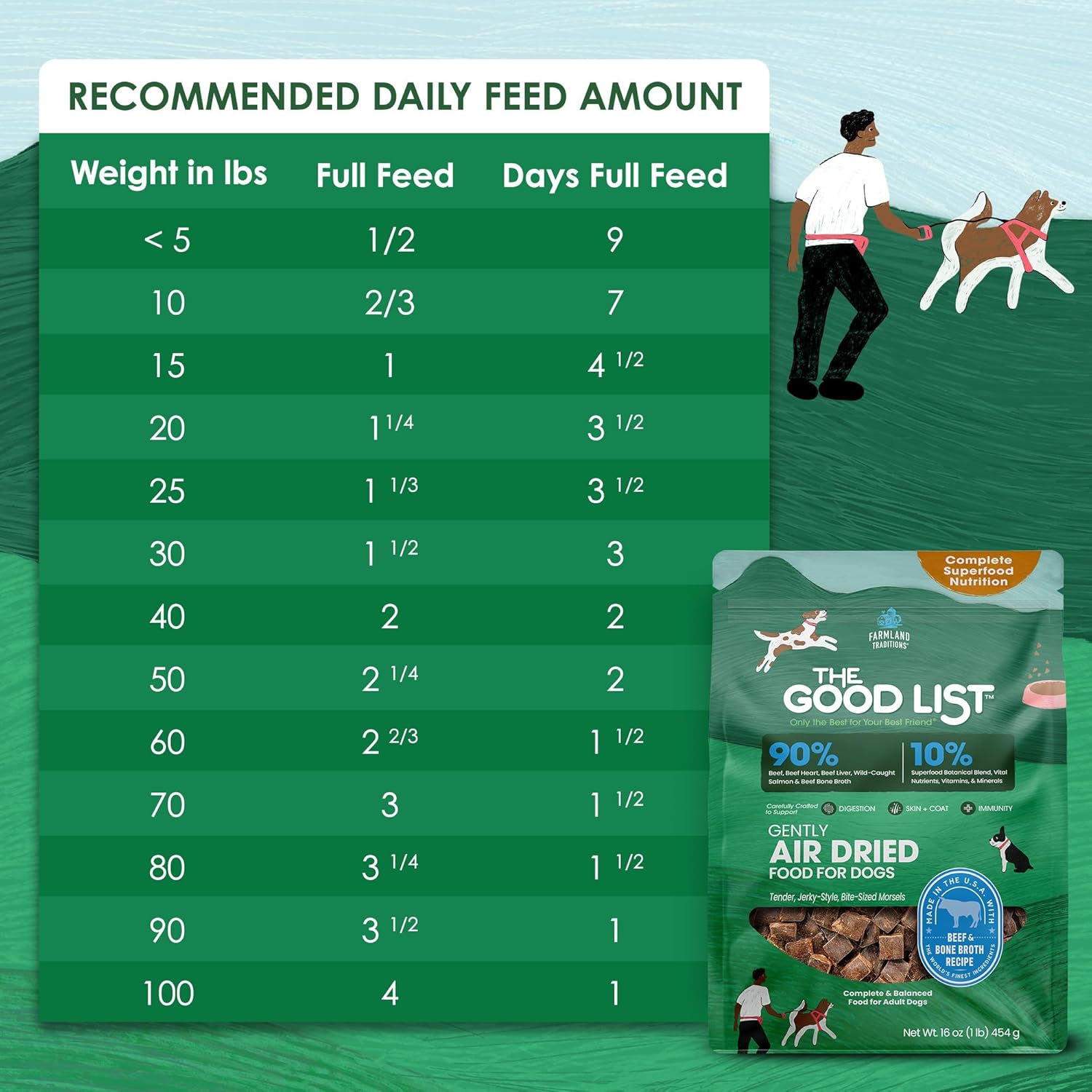 About this item Premium High-Protein Nutrition: Made with real beef, beef heart, beef liver, and wild-caught salmon, this air-dried dog food delivers a protein-rich diet to support vibrant skin and a shiny coat for adult dogs of all sizes Maximum Flavor: Our unique and gentle air-drying process locks in essential nutrients and enhances natural flavors, creating a tender, jerky-style texture that even the pickiest eaters will love Bone Broth Infused: Crafted with rich beef bone broth, our recipe includes 90% animal protein and a 10% superfood botanical blend to support a normally functioning digestive system Grain-Free Dog Food: A great alternative to traditional wet or dry dog food, this grain-free formula is free from corn, soy, wheat, and artificial preservatives, ensuring your dog receives optimal nutrition without common allergens Crafted in the USA: Produced in our Southern California kitchen, with the highest quality standards and using only the finest, wholesome ingredients to ensure your dog receives vital nutrients and a balanced meal every day › See more product details