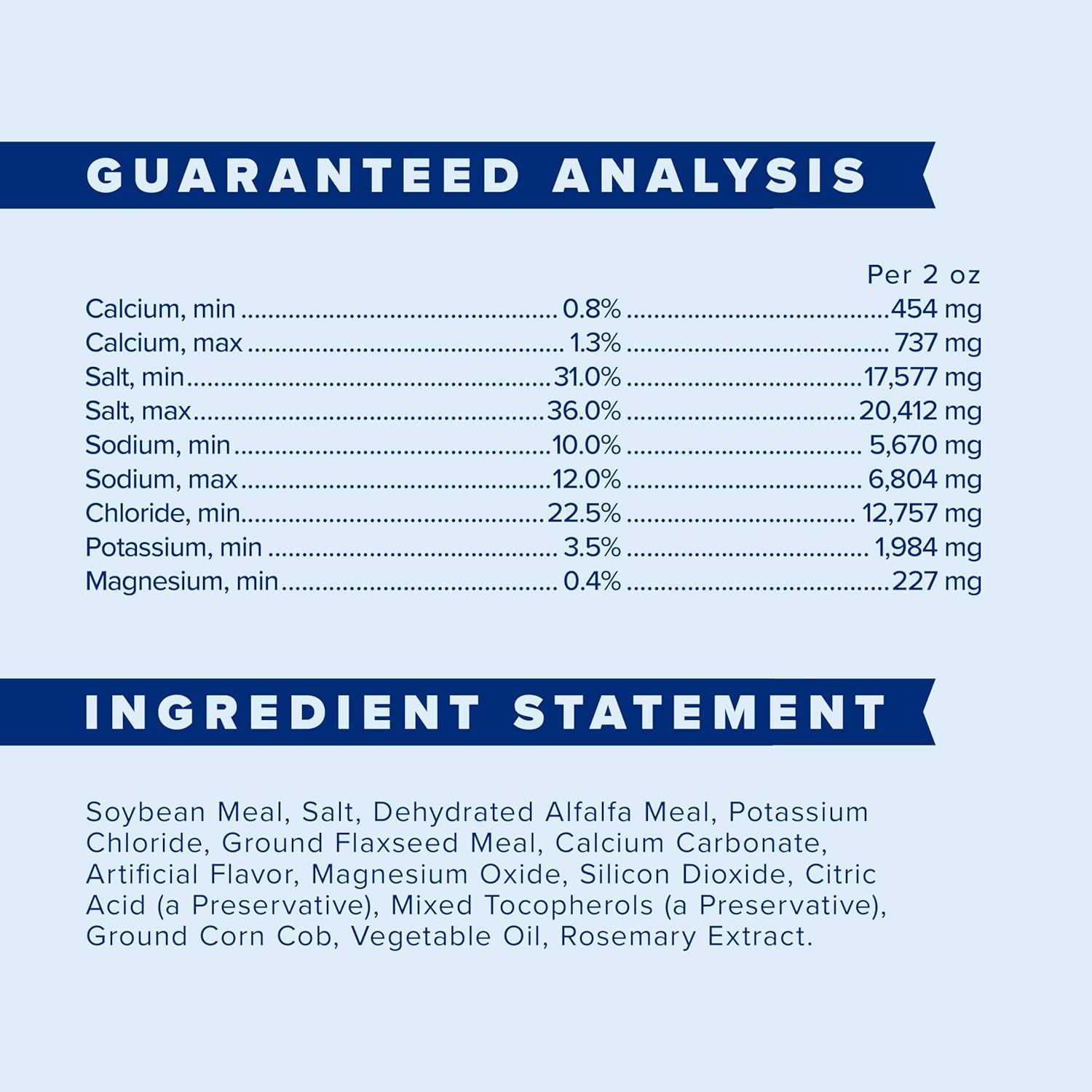 - Active Ingredients: GUARANTEED ANALYSIS PER 2 oz. Calcium (min) 454 mg; Calcium (max) 737 mg; Salt (min) 17,577 mg; Salt (max) 20,412 mg; Sodium (min) 5,670 mg; Sodium (max) 6,804 mg; Chloride (min) 12,757 mg; Potassium (min) 1,984 mg; Magnesium (min) 227 mg.See more