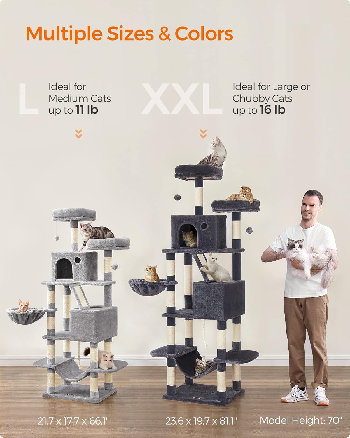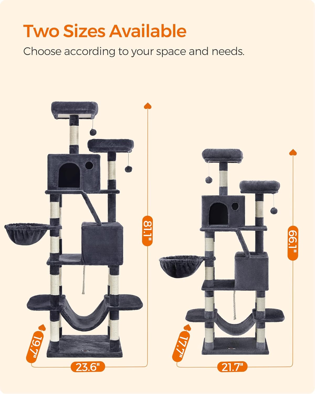 About this item 81.1" tall. 5 levels. Short 12"-16" distance between levels. This plush cat tree is perfect for cats who love climbing and high places, but it’s also easy to climb up and down With 2 padded cat perches, 2 cozy caves, 1 fluffy basket, 2 pompoms, and 1 hammock, cats of different characters can all find their fave spot on this multi-level cat villa covered with plush all over—perfect for multi-cat households Sturdy particleboard for durability, a large, reinforced base for extra stability, and an anti-tip kit for security—it’s stable and safe for up to 6 cats (max. 15.4 lb each) to play Cats love to scratch. With scratching areas on each level, they can scratch to their hearts' content and let your sofa go! Plus, the scratch ramp doubles as a ladder to help kittens and elderly cats climb up easily With a simple structure, step-by-step instructions, and labeled parts, assembling this tall cat tree is as easy as building blocks Fur, dirt, and crumbs...no worries. Just a lint roller or vacuum cleaner can easily wipe them away Whether your cat had a little too much fun with a pompom and damaged it or you’re not a fan of bells, this cat tower for indoor cats comes with a spare pompom without a bell so you can replace it as needed › See more product details