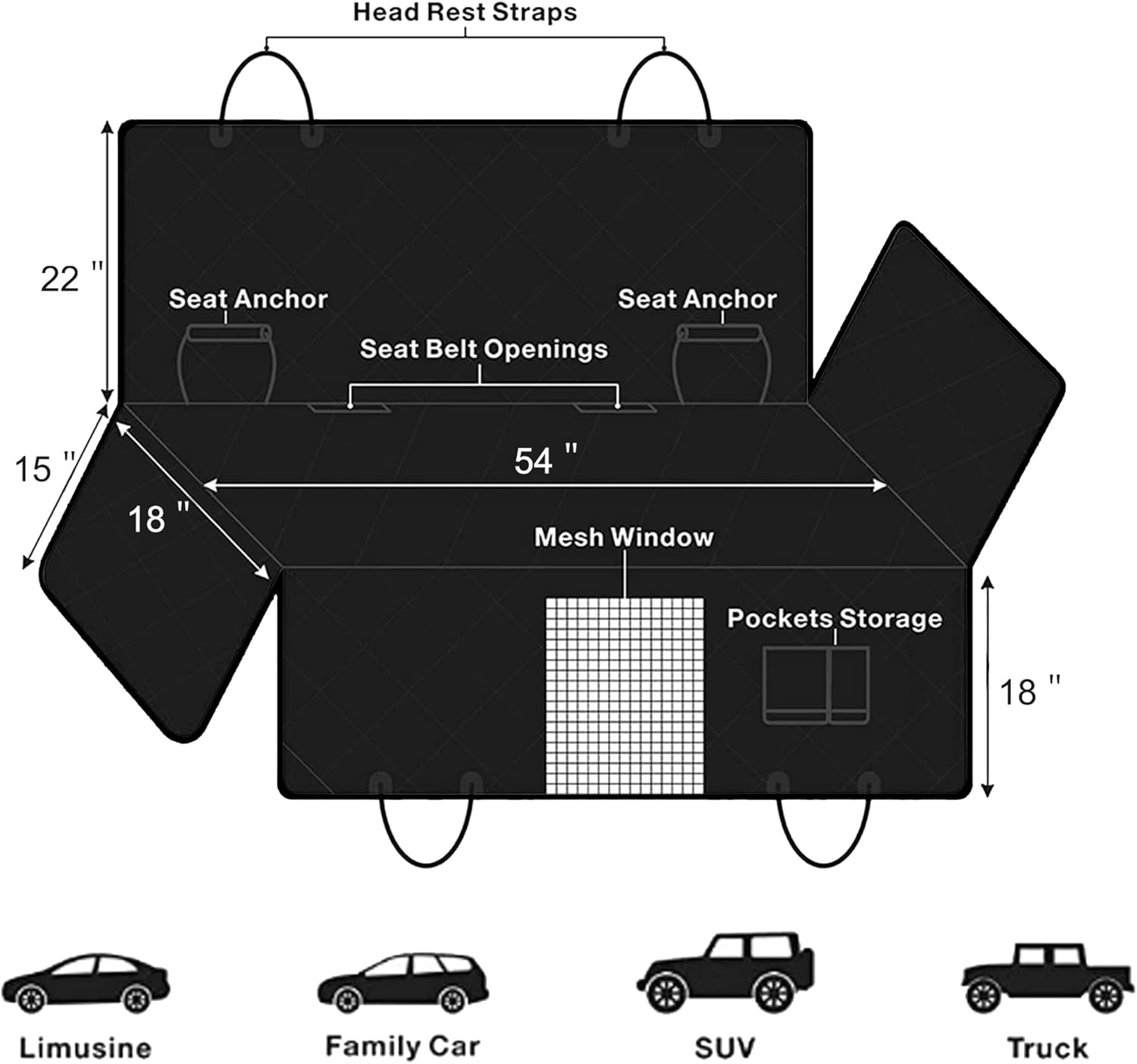 About this item đSIZE & MATERIAL - Maximum open size (54"W x58"L) dog car seat cover fits to different vehicles like STANDARD cars, trucks, SUVs, including baby car seats. Heavy-duty material with 600D oxford & NEW PU material is tough as nails, scratch resistant and 100% waterproof. đUPGRADED DESIGN - There are 2 Velcro Openings allowing your seatbelts. This bench dog seat cover for back seat backing designed with upgraded anti-slip mesh, more durable and soft. Side flaps plus front flap seat cover for dogs makes your car seat end from muddy paws, dirty debris, dog hairs and scratches. And our dog's backseat cover is a unique quilted without any holes. đVISUAL MESH WINDOW & POCKETS - Our pet seat cover with a mesh visual & breathable window in the center. It helps your dog get better air circulation. Not only that, you and your dog can always see each other and reduce their anxiety. The extra storage pockets can store your petsâ food and toys. đNONSLIP & SAFE - PVC non-slip soft rubber backing and seat anchors prevent seat cover from sliding around, ensure the security of dogs. The extra dog seatbelt can prevent your dog jumping off the backseat distracting drivers' attention. đEASY TO INSTALL & EASY TO CLEAN - Just snap the buckle straps around your carâs headrests and tuck in the seat anchors and zipper up the side flaps. It will last a longer time and can be washed over and over. Machine Washable: Use Gentle Cycle. âș See more product details