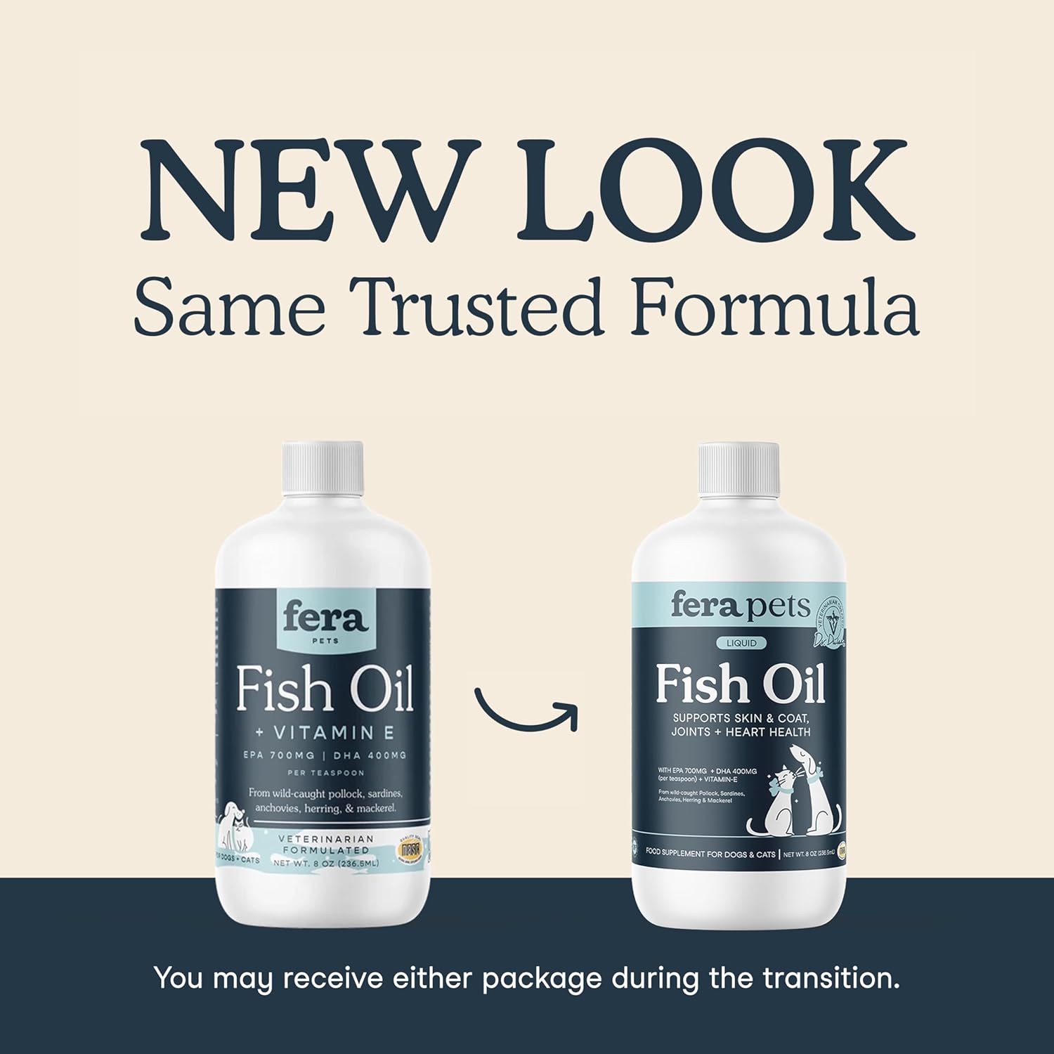 About this item Powerful omega 3 fish oil: Fera’s fish oil supplements help with your pet’s dry, itchy skin, and enhance their coat; this cat and dog fish oil also helps maintain your pet’s immune and brain function Updated formula: Omega 3 fish oil for dogs and cats now with wild-caught pollock, as well as Icelandic sardines, anchovies, herring and mackerel; this fish oil omega 3 complex has 700mg of EPA, 400mg of DHA and sunflower-derived vitamin E (antioxidant) Veterinarian formulated: Fish oil for cats and dogs crafted by our Co-Founder, Veterinarian Dr. Dulake; our fish oil omega 3 supplements bear the NASC quality seal, are made in the USA, GMP-compliant, and are molecularly distilled to remove all impurities Feeding guide: Feed this fish oil liquid as cat or dog food toppers by adding the recommended amount to dog food or cat food; 48 teaspoons per 8-ounce bottle; under 25lbs, give ½tsp; 25-50lbs, give 1tsp; 51-75lbs, give 2tsp; use within 3 months once open Care from head to tail: Dog and cat supplements crafted from our commitment to creating effective, honest and delicious cat and dog vitamins and supplements, while combining Eastern and Western ingredients for a holistic approach to your pet’s wellbeing › See more product details
