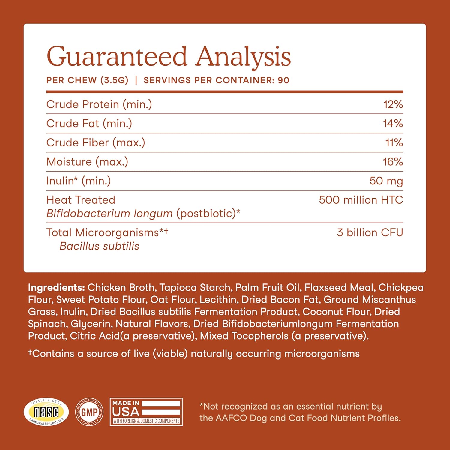 About this item Vet-Founded and Formulated Dog Vitamins and Supplements: Crafted by vet Dr. Dulake, our NASC-certified dog probiotics are made in the USA and support gut balance, regularity, and whole-body health from the inside out Premium Traceable Ingredients That Go Beyond the Basics: Our dog chews are formulated with inulin from chicory root, sustainable miscanthus grass, and clinically studied Bacillus subtilis for effective, daily gut support; no fillers or artificial preservatives Clinically Studied Postbiotics in Every Dog Chew: Features PRIOME Gut Health Postbiotic, a heat-treated Bifidobacterium longum strain that promotes digestion, nutrient absorption, and microbiome resilience Visible Results With Consistent Use: Our probiotic chews for dogs support digestive balance, and help reduce coprophagia, gas, bloating, or loose stools with noticeable results within 30 days; ideal for daily use or extra support during travel, stress, or diet changes Satisfaction Guaranteed: We stand behind every chew; If you're not completely satisfied, contact us for a full refund, no questions asked › See more product details