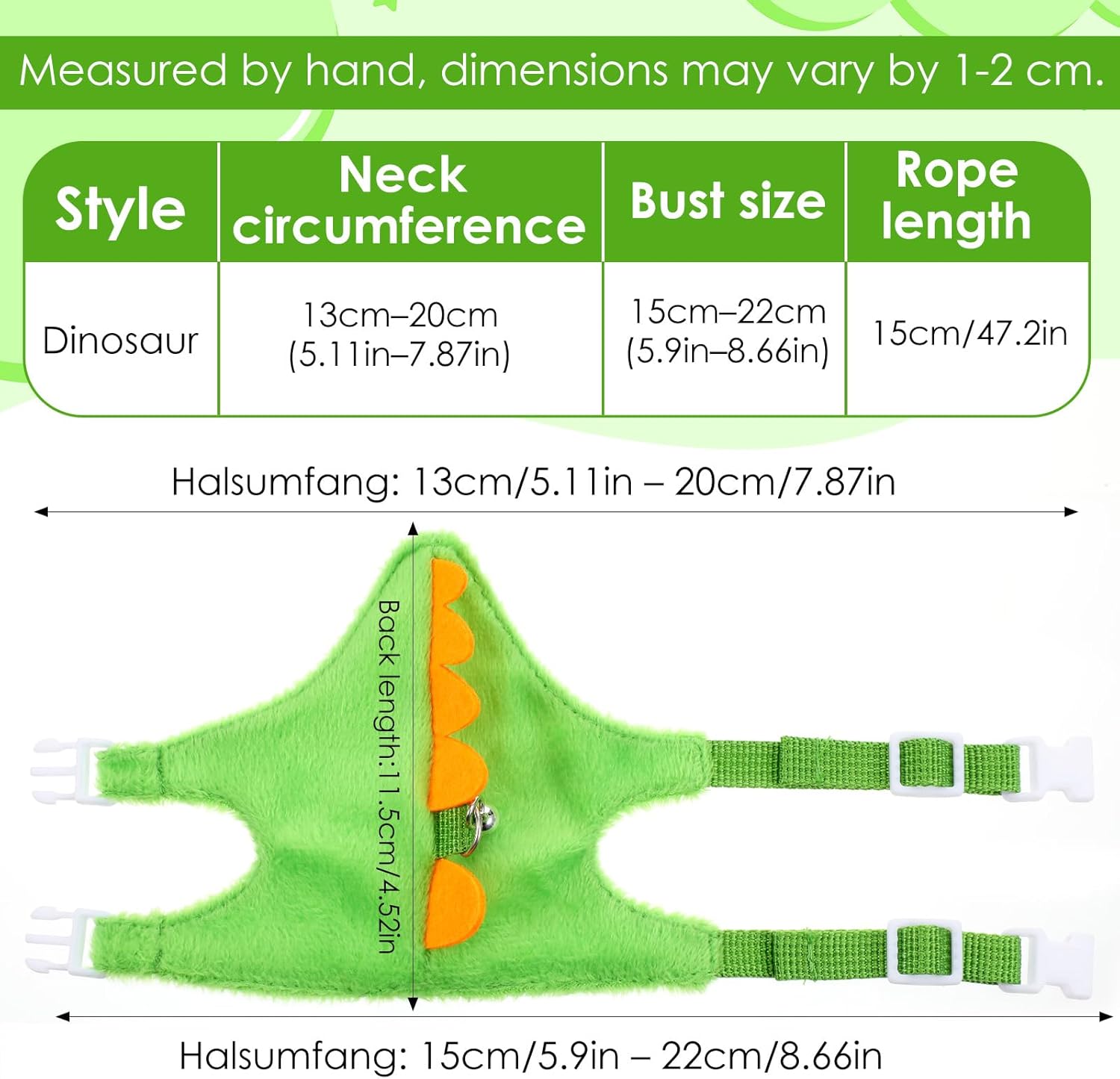 YBEATY Ferret Harness and Leash Set Small Animals Vest Harness with Safe Bell Dinosaur Shaped Harness Leash Set for Baby Rabbit Guinea Pig Teacup Chihuahua Mouse and Other Small PetSpecifications:Category: Small Animal Vest HarnessColor: GreenStyle: GeometricMaterial: ClothFunction: Leading rope vest style, adjustable small pet rope, mouse walking rope for going outProduct size: 4.25 × 4.17 × 0.06 inches/10.8 × 10.6 × 0.15 cmPacking list: 1pcs × Small Animal Vest Harness1. The unique dinosaur shape design not only adds to the fun of the harness, but also highlights the cuteness and personality of your pet.2. You can easily adjust the harness size according to the size of your pet without complicated operations3. Rabbit leash is lightweight and portable, making hamster leash an ideal choice for your pet's daily travel