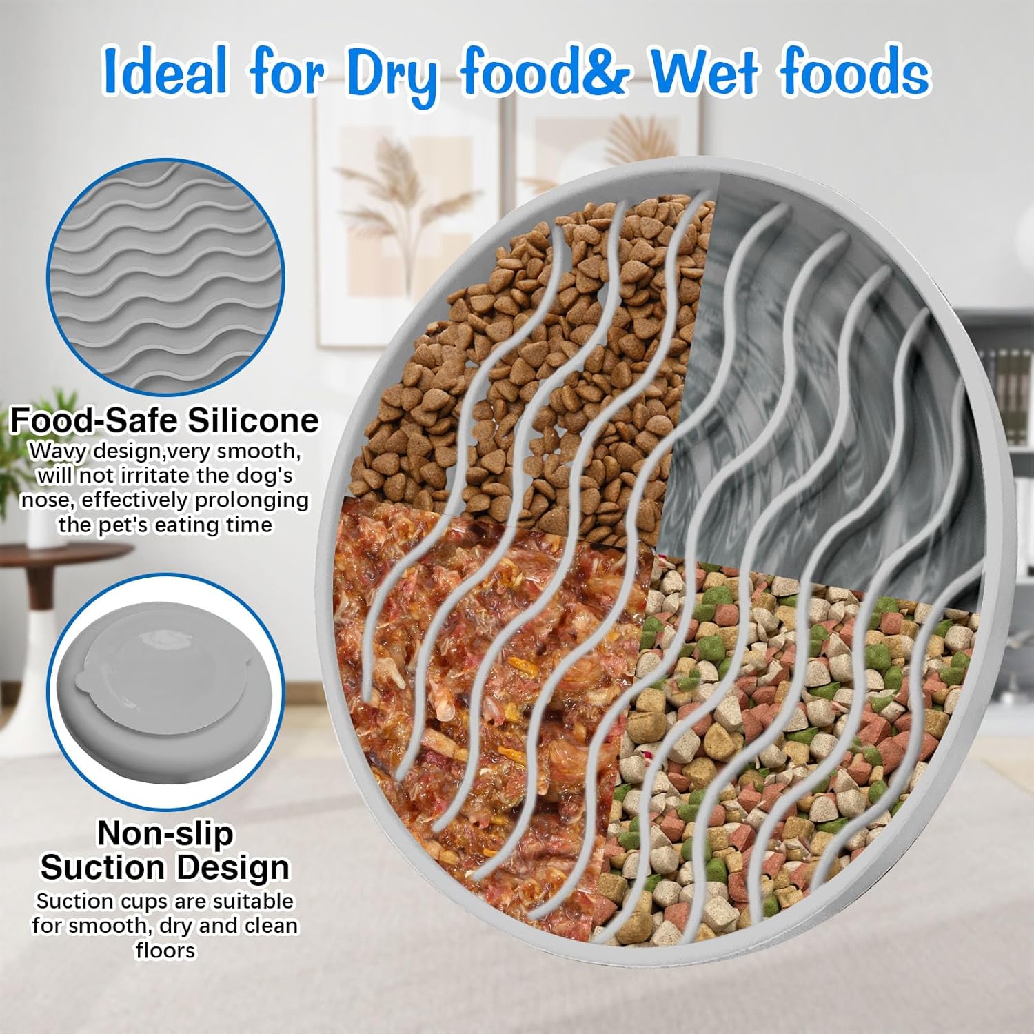 About this item High Quality Silicone Material: Made from food-grade silicone, this dog slow feeder bowl is safe to use for dry or wet food; note: When using the silicone dog bowl, it is not a chew toy, so please keep an eye on your pet Slow Feeding: The silicone slow feeder features a unique wavy design; the raised portion separates the food and adds an element of challenge to meal times, allowing dogs to chew their food more slowly; effectively extends your pet's mealtime for dogs Slow Feeding: The silicone slow feeder features a unique wavy design; the raised portion separates the food and adds an element of challenge to meal times, allowing dogs to chew their food more slowly; effectively extends your pet's mealtime for dogs Smooth Surface: This dog bowl slow feeder is easy to clean, can be rinsed with water or put in the dishwasher, and can even be heated in the microwave Multifunctional Slow Food Bowl: This slow eating dog bowl can also be used as a dog puzzle lick mat, dog lick bowl, slow eating cat bowl; when used as a licking mat, calm them down by sprinkling food on the bowl and letting them lick the bowl › See more product details