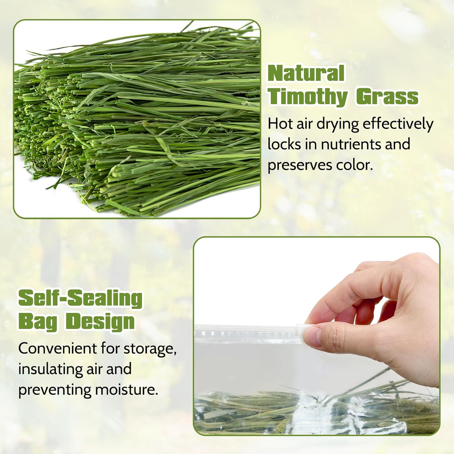 About this item : Guinea pig hay is free of additives and colors, organic timothy hay is grown in the highlands and hand-selected at each process to remove weeds, dirt and other debris : Rabbit hay is rich in protein, crude fiber and vitamins, making it the ideal hay for rabbits, guinea pigs, chinchillas and hamsters. The natural fresh aroma of the hay attracts small animals to chew it : Timothy hay for rabbit is dried in hot air for 10 hours, effectively retaining the fresh green color and nutrients of timothy hay, with soft leaves and long, crisp stems, making it very friendly to small pets : Rodents need to constantly chew their food to sharpen their teeth. Timothy hay for guinea pig is rich in crude fiber to help pets sharpen their teeth and promote digestion : Hay for guinea pigs can be used as an all-day snack for adult pets to satisfy your rabbit's desire to chew, keep busy and reduce chewing on furniture and cages. It is recommended to mix with other staple foods to maintain a balanced nutrition › See more product details