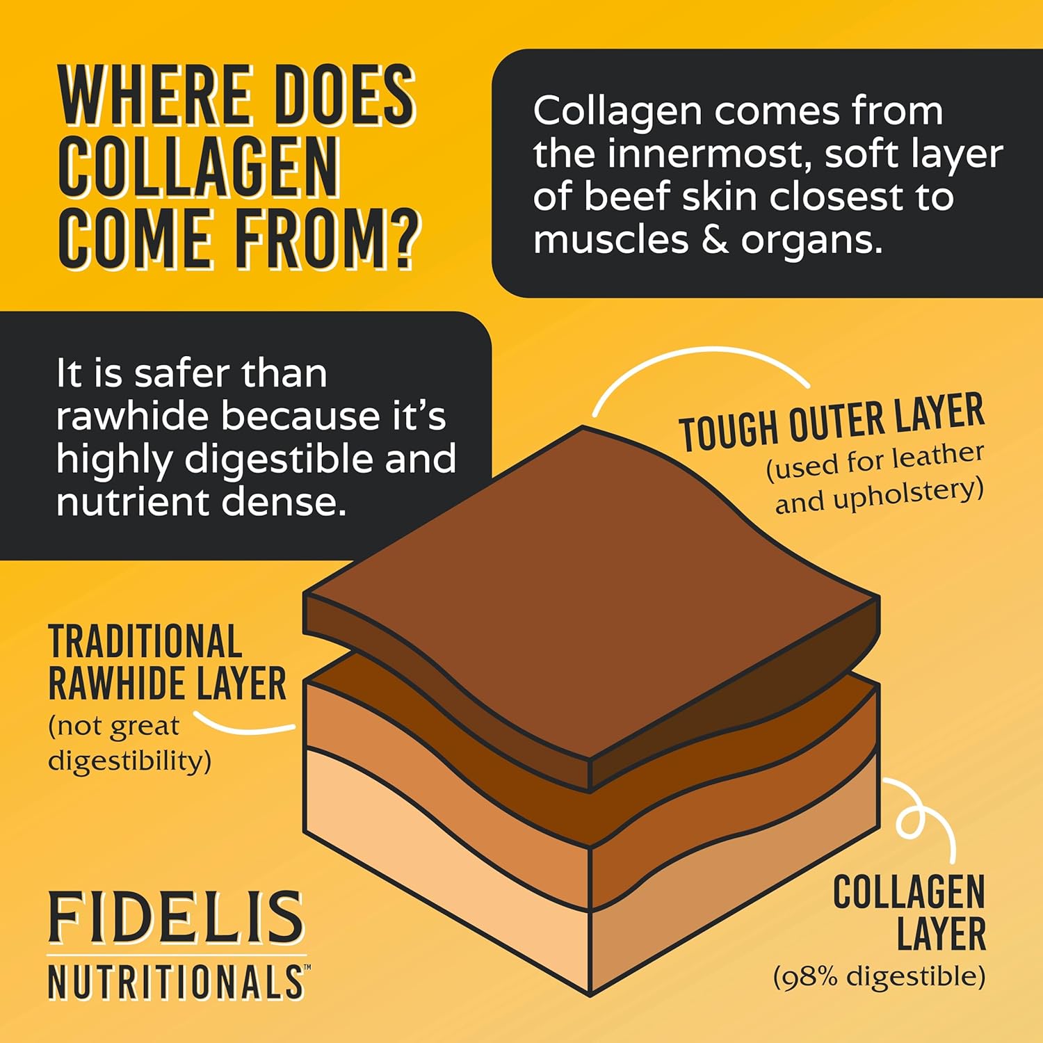 About this item FREE RANGE BEEF COLLAGEN: FIDELIS Collagen Chews are 100% rawhide free chew sticks are a bone-alternative made with 100% free range beef collagen, making it a much healthier and safer option for small dogs or large dogs. Available in tasty beef, chicken, or peanut butter flavors in both 7inch and 10inch sizes, collagen is a key component of cartilage to cushion and support joints and provides essential amino acids for a glossy coat. NUTRIENT DENSE, GLUTEN FREE & GRAIN FREE: Collagen is highly digestible (unlike traditional rawhide) and nutrient dense, 85% protein and low fat and naturally rich in glucosamine and chondroitin. FIDELIS Collagen Chews are naturally grain free and gluten free without preservatives or additives and help support a healthy gut for your pet. DENTAL HEALTH SUPPORT: FIDELIS Collagen Chews for dogs are designed to relieve stress, boredom, and clean your dog’s teeth. These chew stick treats are a healthy treat and rawhide alternative and are great for reducing plaque and tartar build up. They are long lasting and much gentler on than plastic, dog bones, or antlers. LONG-LASTING ENJOYMENT: Keep your furry friend entertained for hours with healthy, all natural collagen dog chews. FIDELIS long lasting rawhide free collagen dog chew treats are designed for durability to satisfy even the most persistent and aggressive large breed chewers, reducing destructive behavior. They are the perfect alternative to traditional dog bones and are ideal for training and promoting dental health. MADE IN THE USA: FIDELIS is a family-owned operation and proudly sourced and made in the USA. Our dog food, dog treats, dog chews sticks, and dog supplements are USDA inspected. Whether you own a small pup or a large breed, our full line of dog products offers something for every dog size. Enjoy peace of mind with healthy, long-lasting chews that cater to all dietary needs, making treat time something special for your beloved pet. › See more product details