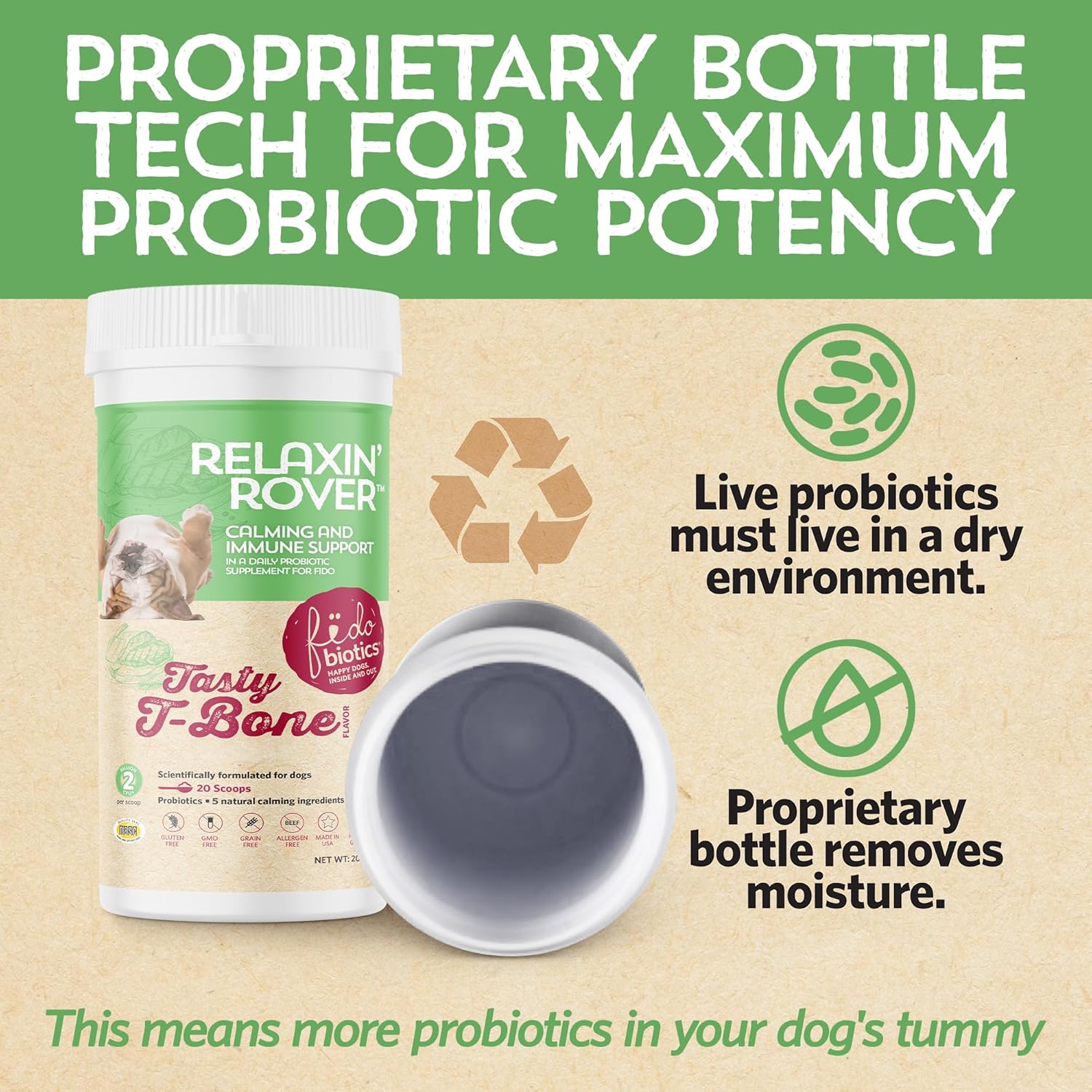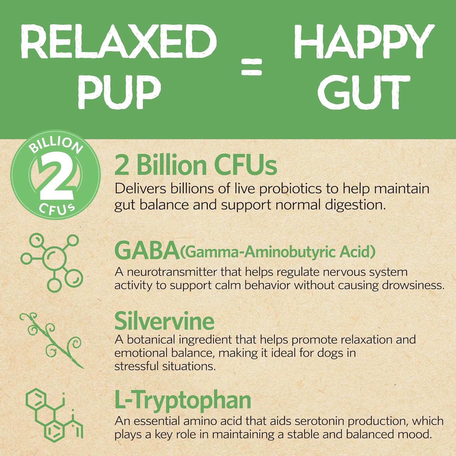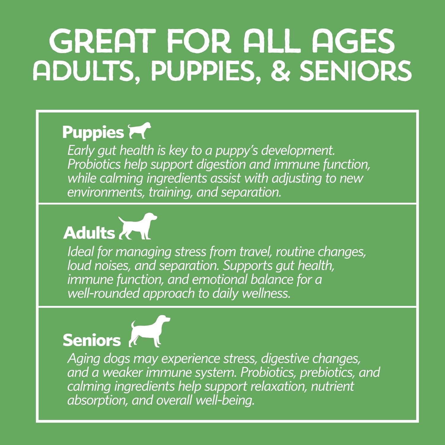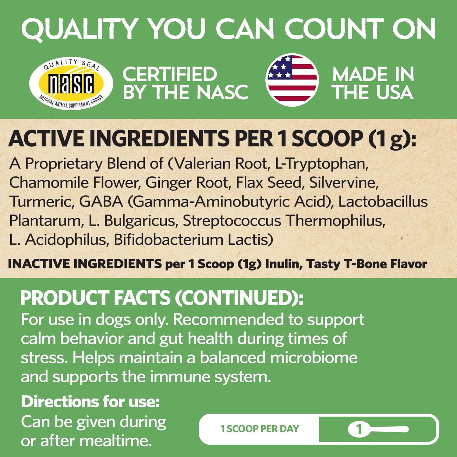 About this item CALMING AND IMMUNE SUPPORT – Help your pup stay relaxed during thunderstorms, travel, and separation. Formulated with Valerian Root, Chamomile, and GABA to support a calm, balanced mood—no drowsiness, just serenity. DAILY PROBIOTIC FORMULA – A happy gut makes for a happy pup! With 2 billion CFUs per scoop, these probiotics for dogs support digestion, nutrient absorption, and immune health, keeping their belly and mind in sync. NATURAL STRESS RELIEF INGREDIENTS – L-Tryptophan, Silvervine, and Ginger work together to help ease nervous energy and promote relaxation. Perfect for anxious pups who need a little extra support. TASTY & EASY TO USE – No messy pills or chews—just a Tasty T-Bone flavor dogs love! Sprinkle over food once a day for effortless stress relief and digestive support. QUALITY YOU CAN TRUST – Made in the USA with human-grade, NASC-certified ingredients. This grain-free formula is vet-trusted and carefully crafted for safety, effectiveness, and happy, stress-free pups. › See more product details