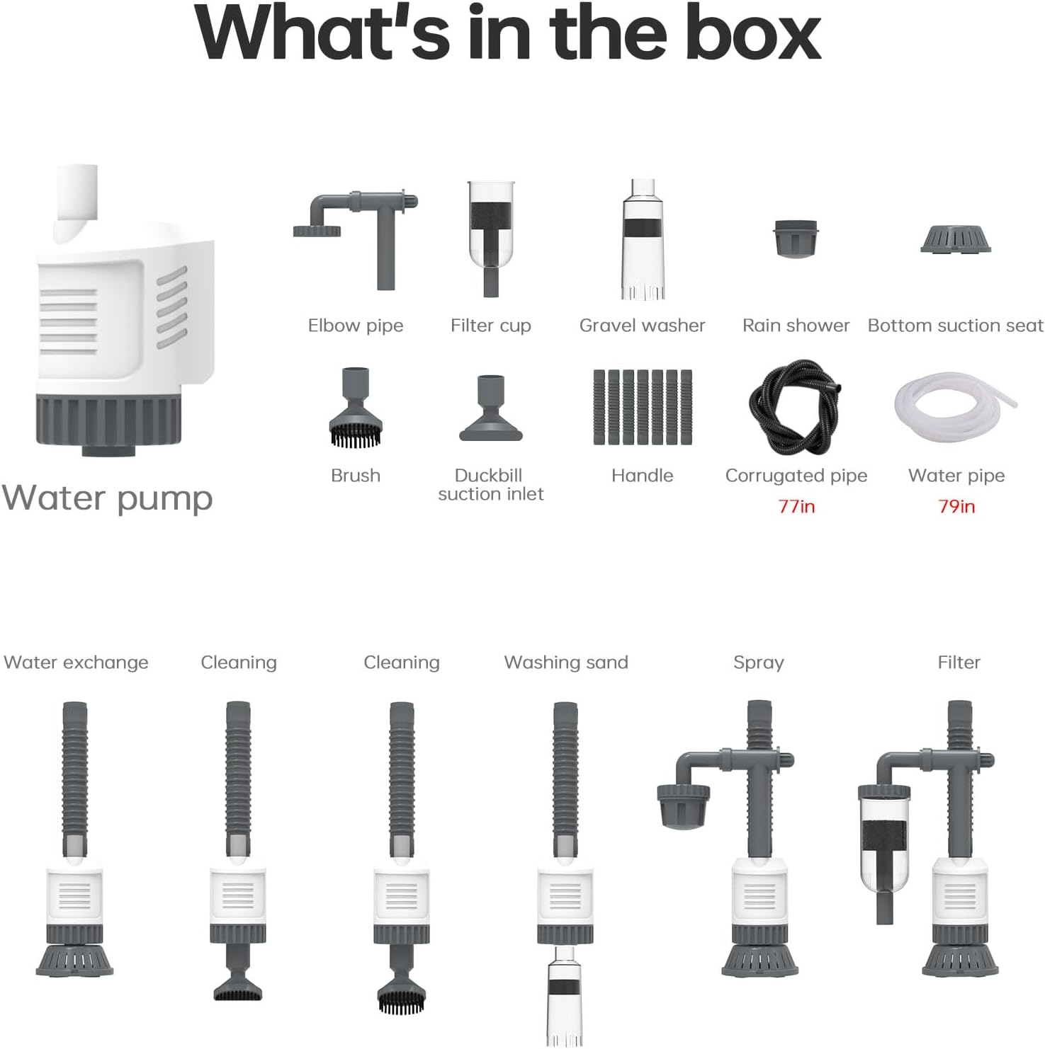 : Six cleaning modes are available with this multipurpose aquarium gravel vacuum: water changing,thorough sand washing, cleaning turtle tanks, filtering soiled water, , and vacuuming sand and stones. It also features active water circulation. For simple, hands-free fish tank cleaning, simply press the button. The electric suction mechanism operates 90% faster than manual siphoning : Bid farewell to bothersome, noisy cleaning!30W high power electric fish tank cleaner is specially designed for 5-200 gallon aquariums, with innovative silent technology running late at night without disturbing the fish, allowing fish and nocturnal pets to sleep soundly all night : More robust than filter bags and finer than conventional nets, the aquarium sand vacuum's sophisticated sponge filter cup captures 99 percent of contaminants. A real multipurpose instrument for circulation, suction, and crystal-clear water : This fish tank vacuum cleaner, which fits tanks 10 to 60 inches tall, is made for both aquariums. It comes with a flexible line that measures 15 cm to 1.5 meters. The waterproof body and safe materials provide safe, leak-proof operation. (Note: Keep the control switch dry.) : Includes an ergonomic handle, a multipurpose suction head, an extension pipe, and a 1.5-meter soft tube. Without the need for manual pumping, the aquarium vacuum cleaner starts in just three seconds! Stylish, effective, and long-lasting for a consistently clean tank › See more product details