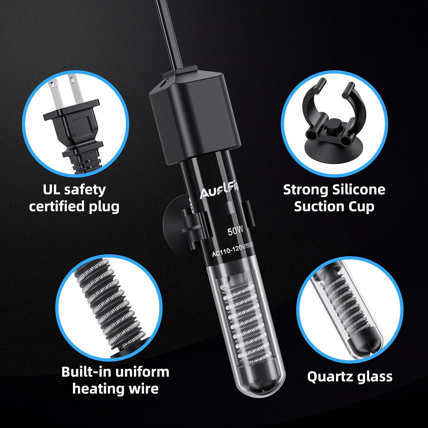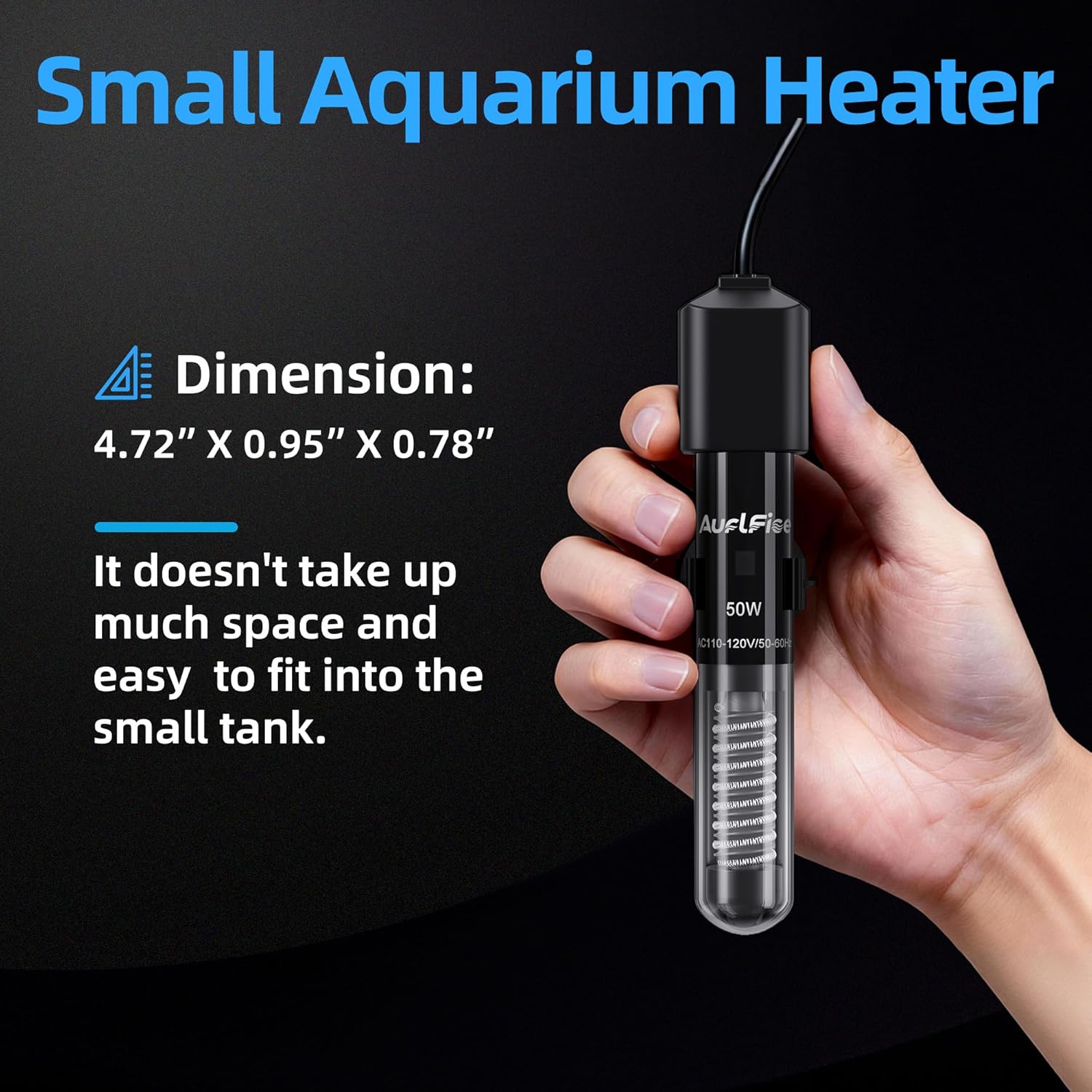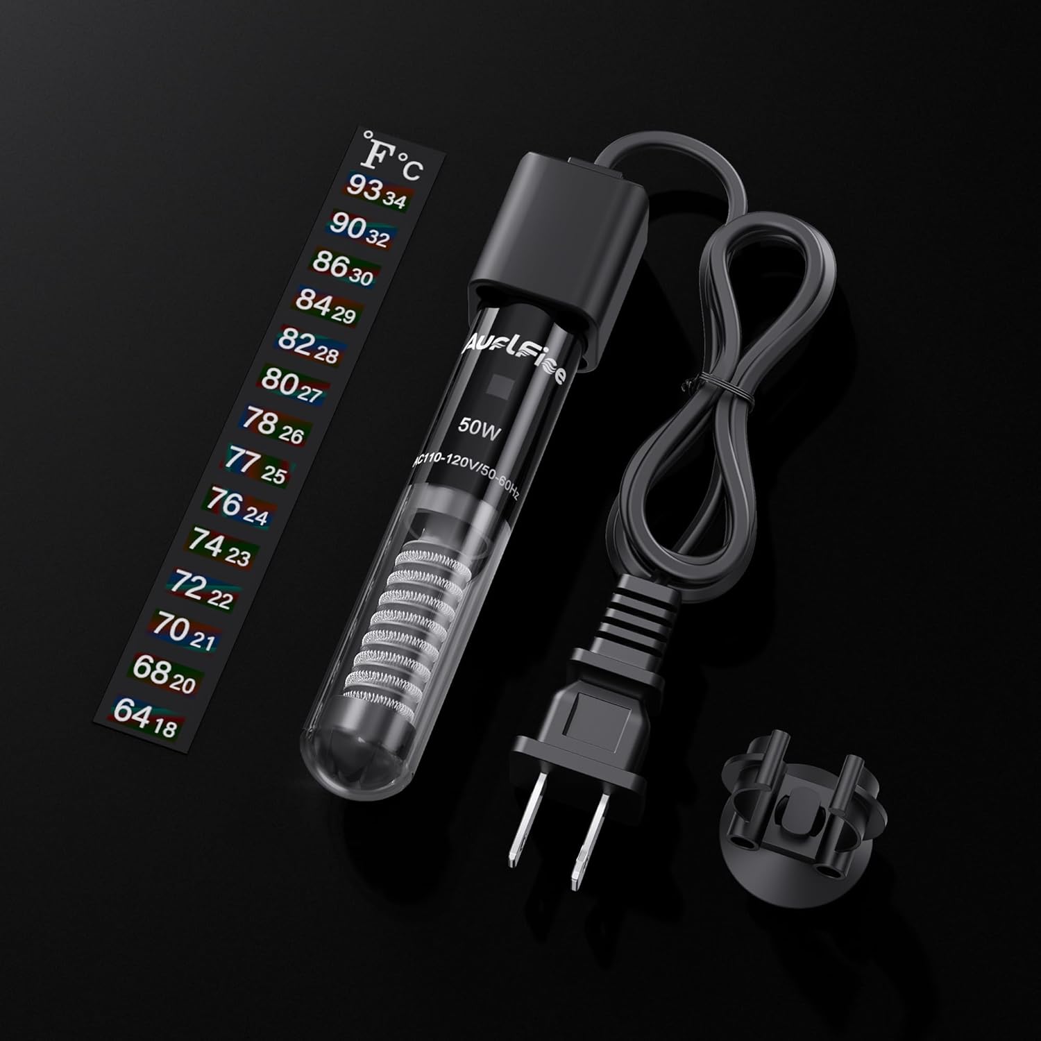【Preset 78°F Aquarium Heater】 Keep your tank at the perfect warmth with our 50W submersible heater. Designed for 5-10 gallon tanks, it automatically maintains a consistent 78°F (25.5°C), ideal for Bettas and tropical fish. The plug-and-play design eliminates the hassle of complicated settings, providing peace of mind for both beginners and pros. 【Perfect for 5-10 Gallon Small Tanks】 Compact and powerful, this small fish tank heater is specifically engineered for 1-10 gallon glass or acrylic tanks. Its mini size allows it to be easily hidden in nano tanks, turtle tanks, or shrimp habitats, ensuring efficient heat distribution. 【Fully Submersible & Safe Material】 Built with durable, heat-resistant glass and a waterproof seal, this submersible water heater must be fully submerged underwater to work. It is safe for both freshwater and saltwater aquariums, providing a reliable heating environment for your aquatic pets. 【Bonus Mini Thermometer Included】 Each package comes with a free high-accuracy aquarium thermometer, allowing you to monitor the water temperature in real-time. This helps you double-check that your heater for fish tank is performing perfectly for your peace of mind. 【Easy to Use & Important Note】 Simply plug and play with no complex setup. Note: This is a preset heater and does NOT have an auto shut-off when out of water. Please unplug it 10 minutes before water changes to protect the heating rod and your safety. › See more product details