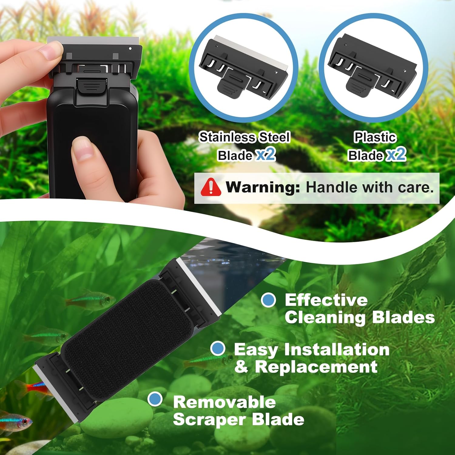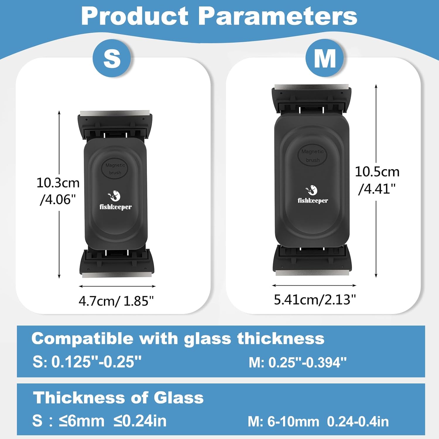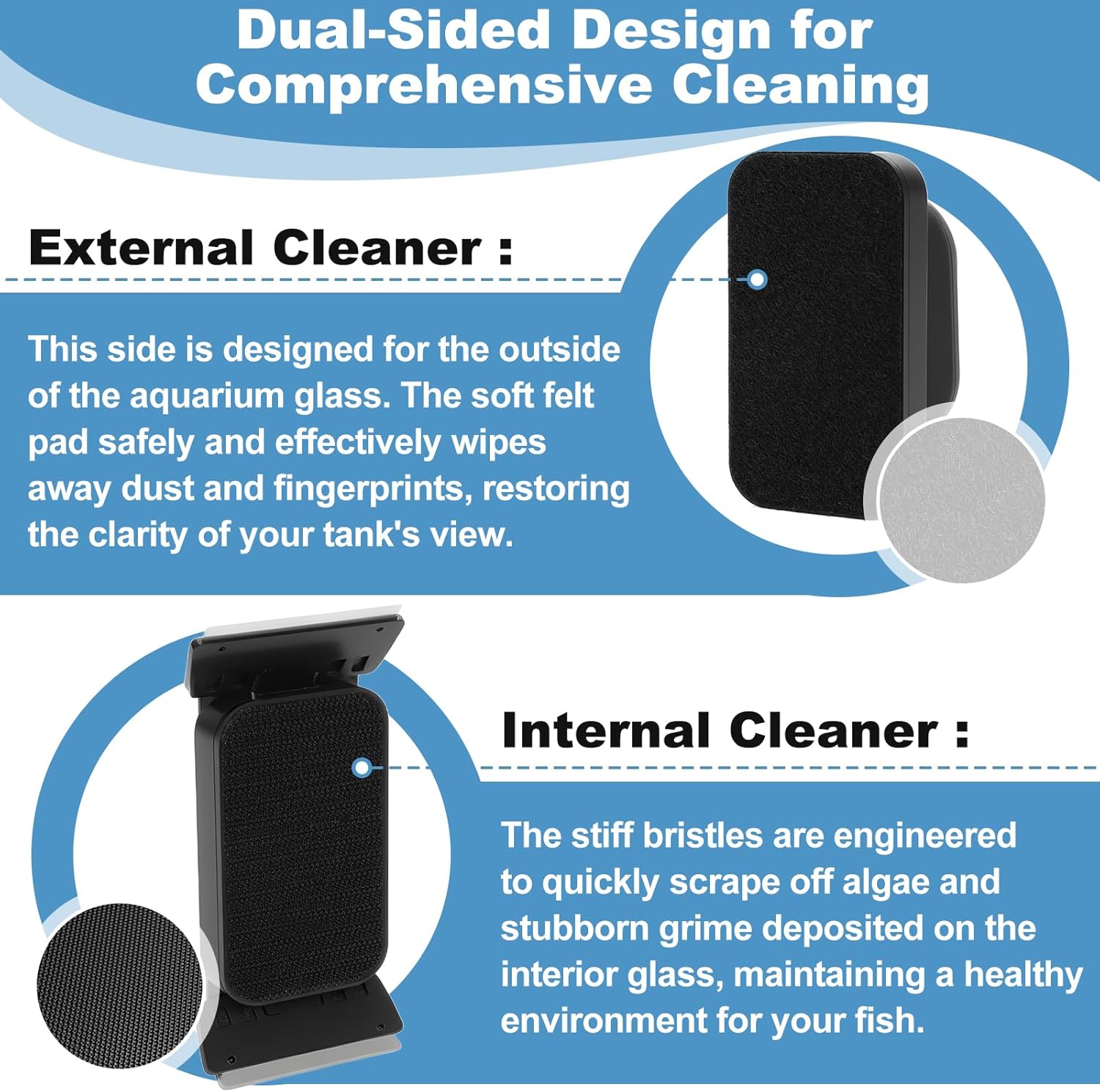 About this item Upgraded Powerful Magnetism:The magnetic fish tank cleaner crafted with robust rare-earth magnets,ensures exceptional durability and effortless operation.Simply guide the external magnet along the outside glass, and the internal unit follows seamlessly,Size S-Compatible with aquariums up to 1/4" (6mm) in glass thickness.When not in use, the aquarium glass cleaner can be securely parked in any corner of your aquarium,occupying no extra space. Dual-Blade Scraper Design:When one blade of the magnetic aquarium algae scrapers away stubborn algae, the other follows to catch any missed spots. This design doesn't just save time compared to single-blade cleaners—it doubles the efficiency. The wider magnetic base prevents slipping, providing exceptional stability. With half the effort, you achieve a crystal-clear view. From start to finish, experience a faster, smoother, and more productive clean. Dual-Sided Scrubbing Cleaner: This magnetic glass cleaner operates on both sides of the aquarium simultaneously. The inner scrubber features a hook-and-loop surface that effectively tackles stubborn stains and algae inside the tank. Meanwhile, the outer magnetic brush with its soft felt pad effortlessly wipes away dust, fingerprints, and water spots from the exterior glass. This dual-action system ensures a crystal-clear view for unparalleled fish watching. 4 Removable Scraper Blade:This fish tank magnetic glass cleaner set includes 2 x stainless steel blades for glass tanks and 2 x plastic blades for acrylic tanks. Attention: Always maintain the same blade orientation and move the scraper in a straight, linear motion. Avoid any sideways or curved movements to prevent scratching your aquarium. Special Suspension Design: When you remove one side of the magnetic brush from the outside of the aquarium, the corresponding inner half automatically suspends itself in the water. Simply bring the outer unit close to the floating inner brush, and the powerful aquarium glass cleaner magnets will seamlessly reconnect. This allows for effortless retrieval without wetting your hands or causing any disturbance to your fish and aquatic plants. › See more product details