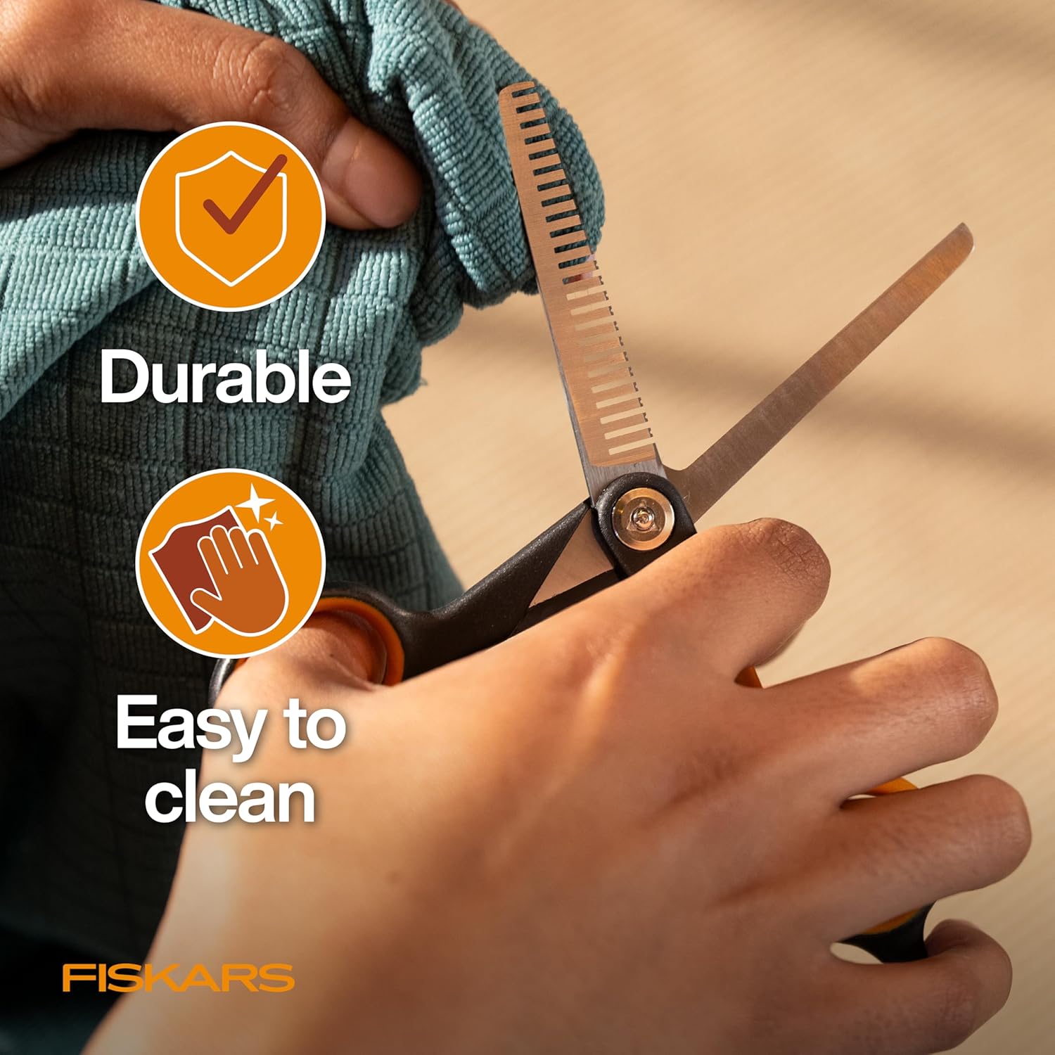 Achieve a natural, professional finish when grooming your pet. Fiskars Blending Scissors bring the cutting expertise and thoughtful design of Fiskars to pet care. Crafted for gentle and precise blending, the serrated teeth are designed to texture fur, remove excess bulk, and blend cut lines seamlessly. The 5-point grip offers excellent control for shaping and blending. Durable, beveled-edge stainless steel blades provide long-lasting sharpness for smooth and efficient cutting. Because every pet deserves Fiskars.