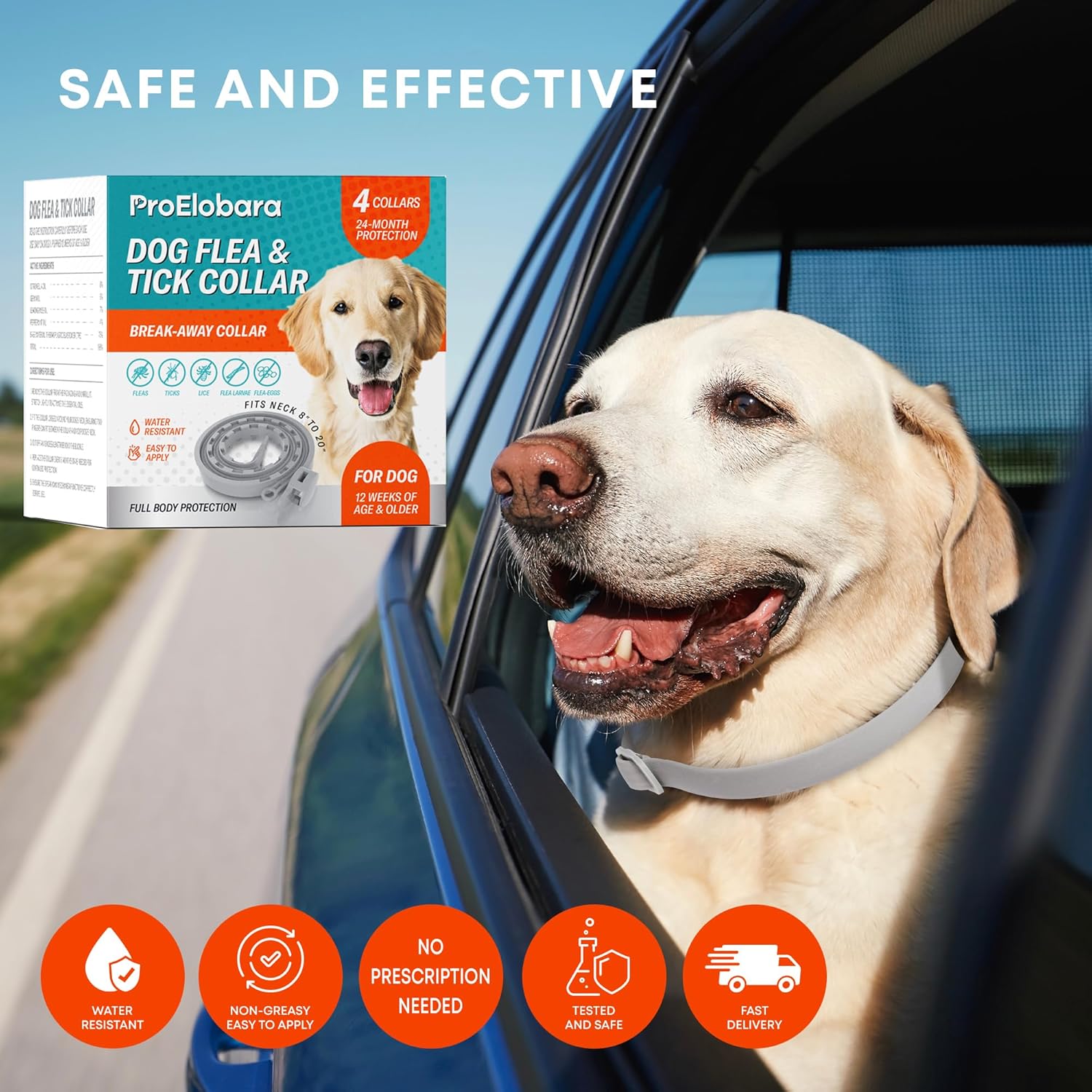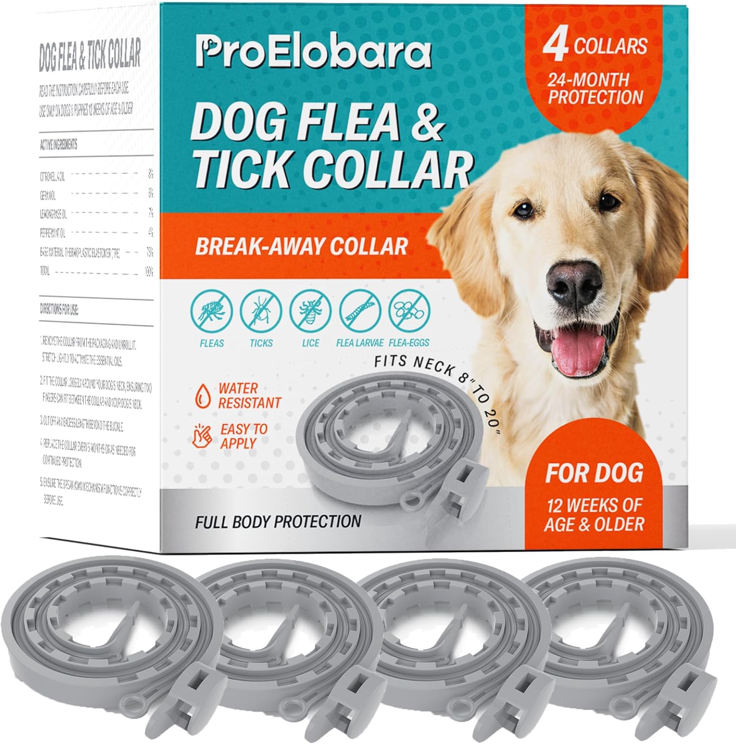 About this item 4-Pack Flea Collar for Dogs – Fits Small, Medium & Large Dogs (Up to 22" Neck): Each package includes 4 flea collars for dogs (25 inches long), adjustable to fit small, medium, and large dogs. This dog flea collar provides effective flea and tick prevention for dogs with protection against fleas, ticks, and larvae. Long-Lasting Dog Flea & Tick Treatment – Up to 24 Months of Protection: Our flea and tick collar for dogs ensures powerful, long-lasting flea and tick prevention for dogs, providing up to 24 months of protection with 2 collars, each offering 6 months of flea treatment dogs need. Waterproof Dog Flea Collar – Durable, Non-Greasy Protection: This dog flea collar is made from non-greasy materials that are odorless, ensuring your dog stays protected without mess. Its waterproof design allows your dog to enjoy outdoor adventures and water play while maintaining flea and tick control. Comfortable, Adjustable Design for Puppies & Pets – Safe & Effective: The dog flea collar is designed with soft, flexible material, ensuring a comfortable fit for puppies, pets, and dogs of all sizes. Perfect for both puppies and adult dogs, providing effective dog flea and tick treatment without discomfort. Non-Greasy, Easy-to-Use Dog Flea & Tick Collar – Perfect for Active Dogs: Our flea collar for dogs is non-greasy, easy to trim, and adjustable to fit dogs with neck sizes up to 22 inches. Ideal for active dogs and outdoor activities, this collar offers reliable flea and tick prevention for dogs without the hassle of frequent treatments. › See more product details