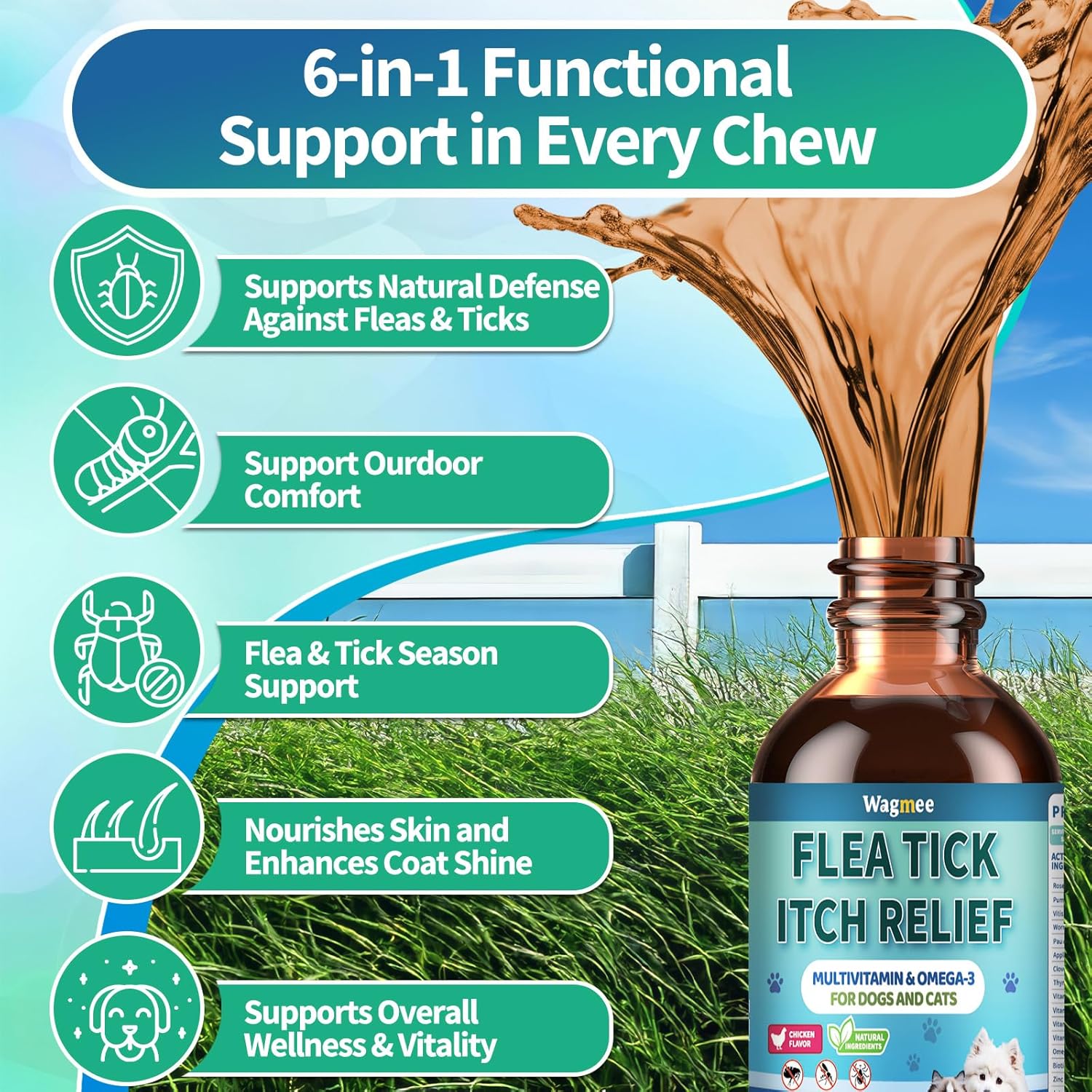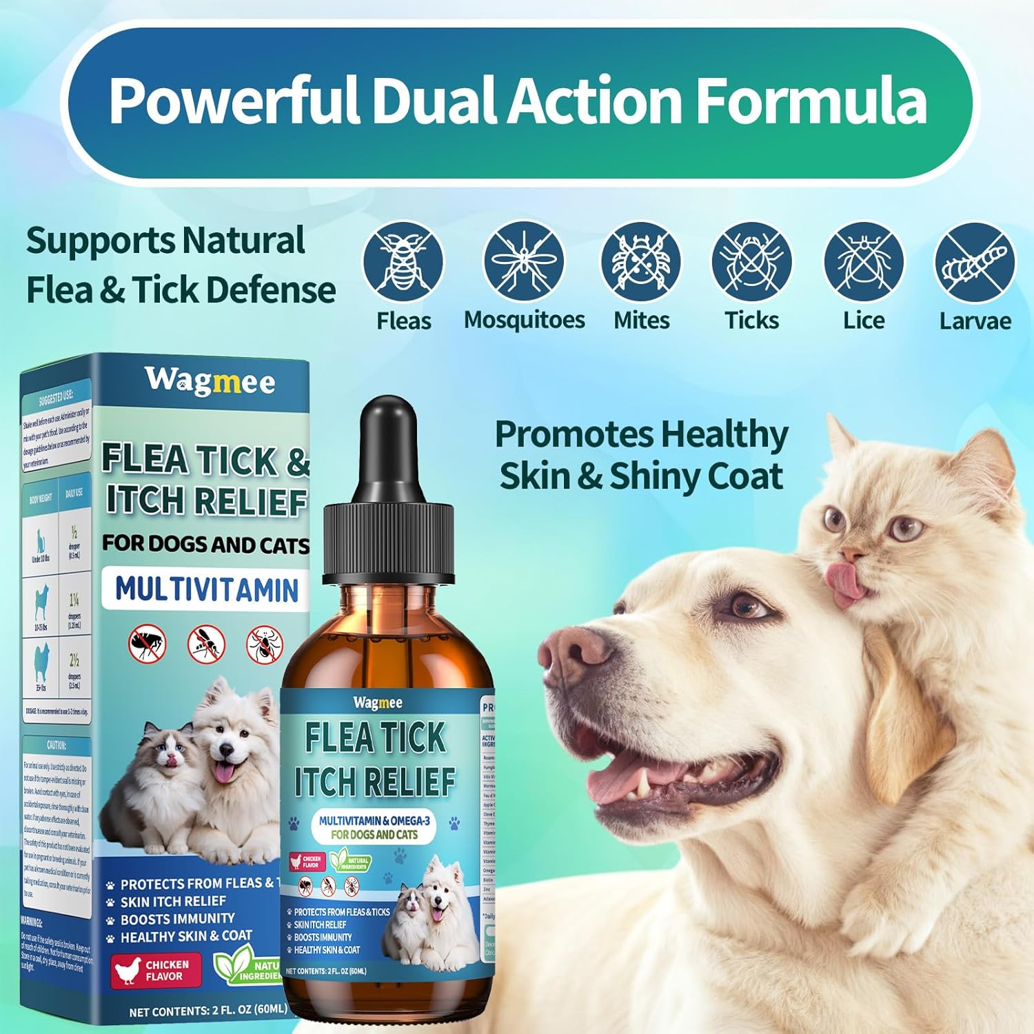 Flea Defense & Itch Comfort: This gentle dual-action formula helps dogs and cats stay comfortable year-round. Designed to support natural defense against fleas while also helping soothe dry or itchy skin—perfect for everyday comfort and coat vitality for pets of all breeds and ages. Natural Care from Within: Crafted with rosemary, pumpkin seed, wormwood, pau d’arco, clove, thyme, and apple cider vinegar, this plant-based blend supports skin balance and a fresh, healthy-looking coat. Enriched with Omega-3, Vitamin E, B-complex, biotin, and zinc, it nourishes from within for visible comfort and shine. For Both Dogs & Cats, All Life Stages: Whether it’s an energetic puppy, a curious kitten, or a wise senior companion, this formula provides gentle daily care that fits every stage of life. Suitable for small, medium, and large pets alike—just follow the easy drop-by-weight guide for consistent use. Savory Chicken Flavor Pets Love: Made with a delicious natural chicken flavor, cats and dogs alike enjoy their daily dose—no resistance, no waste. Turn essential care into a tasty routine that keeps your pets happy, shiny, and comfortable every day. Our Commitment to You and Your Pet: We are wholeheartedly dedicated to improving the quality of life for your pet. If you have any questions or need assistance, our team is always here to help. We want to ensure you and your pet have a positive and wonderful experience. › See more product details