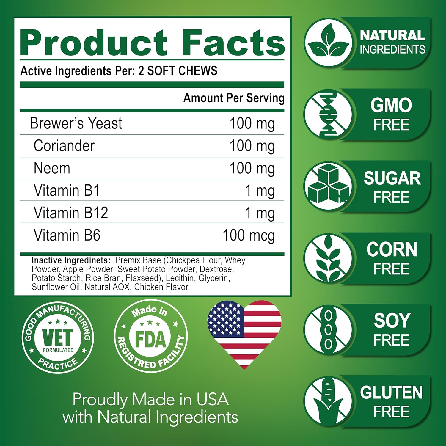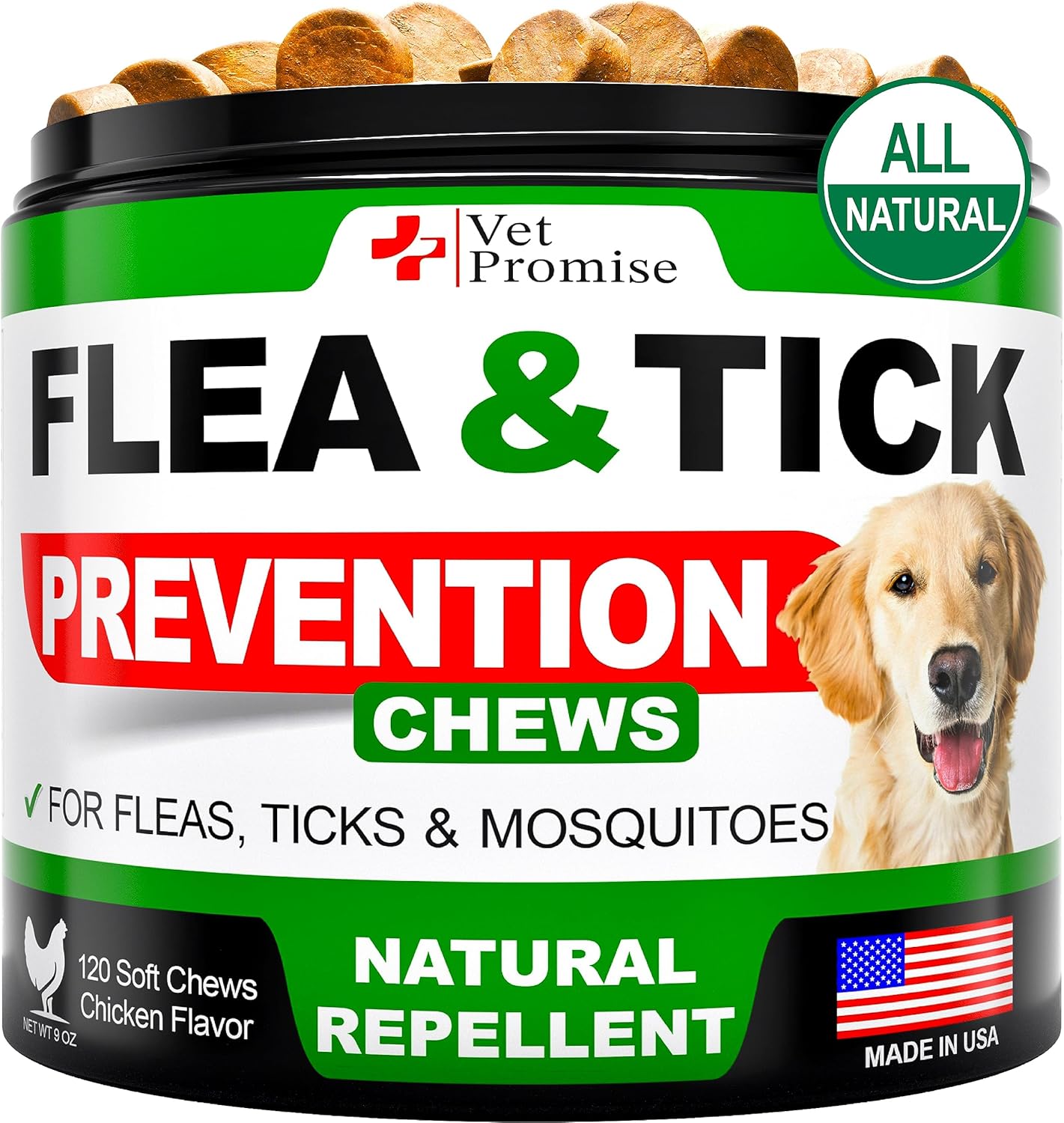 About this item Natural Flea And Tick Prevention For Dogs: Keep your dog safe from fleas and ticks with our supplement. Our formula uses only natural ingredients to help prevent pesky pests from biting your dog Effective Protection: For the best results, give our flea and tick prevention for dogs chewable tablets to your dog every day, this helps build up the appropriate levels in their system Safe And Natural: Our tick and flea control for dogs is made in the USA using only natural ingredients. It's safe for dogs of all breeds and ages, so you can trust that your furry friend is in good hands Made in The U.S.A, Vet Formulated: Our flea and tick prevention for small dogs treats are made in the USA and formulated by Vets in an FDA-registered facility that meets the highest quality standards Premium Natural Ingredients Give Results: No Added Sugar, Wheat, Corn, Gmo or Preservatives. We are committed to using only best ingredients that deliver results in our flea and tick chewables for dogs › See more product details