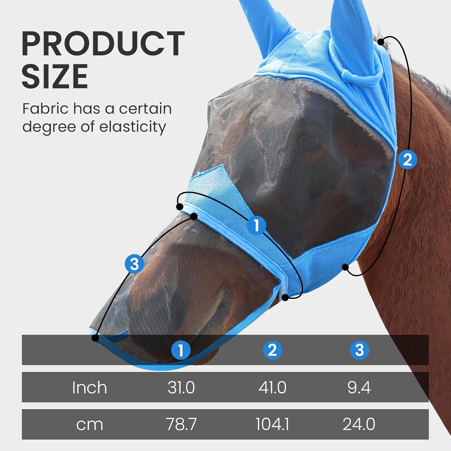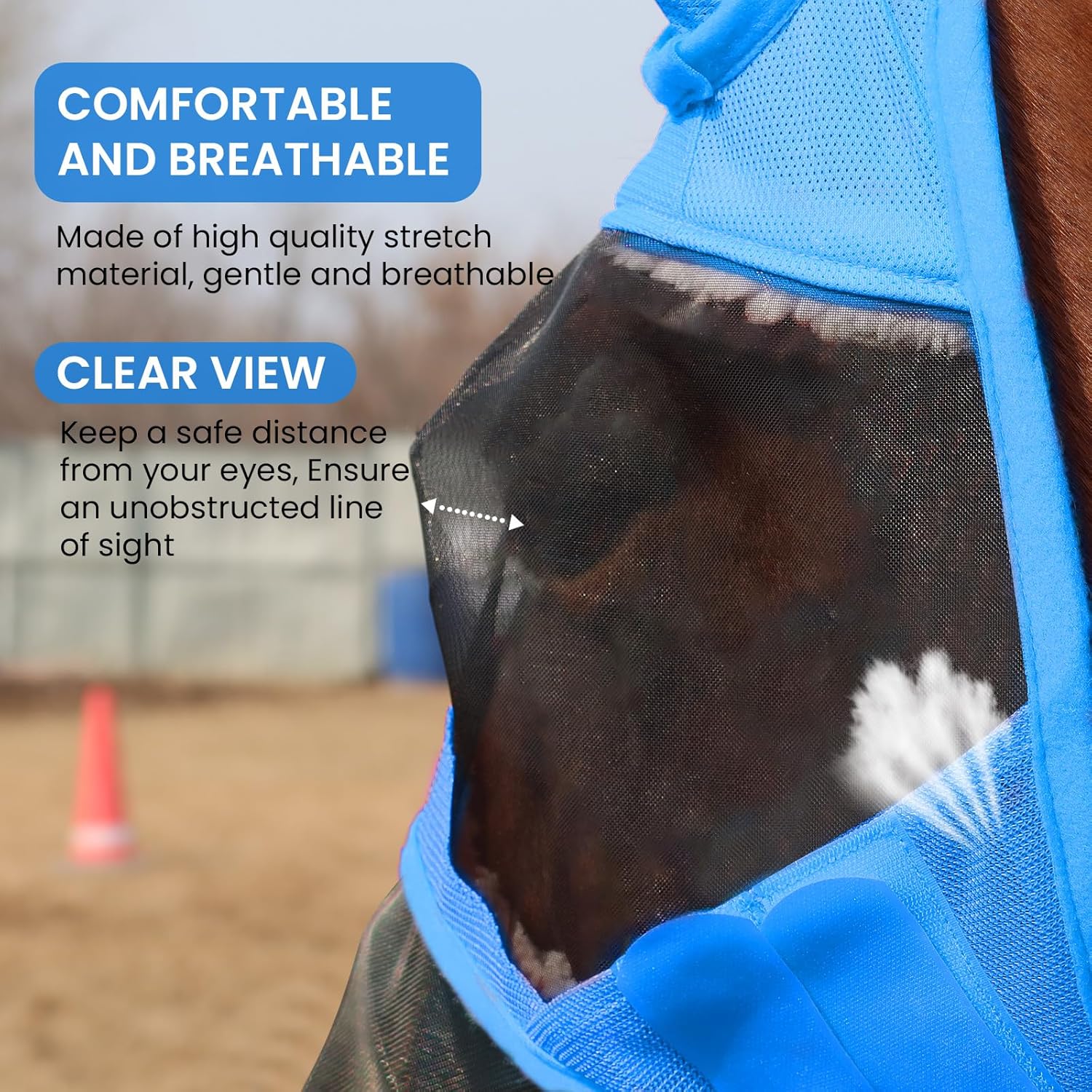 Comprehensive Protection & Breathable: Crafted with precision-woven translucent mesh, our fly masks for horses with nose promotes continuous ventilation while shields your horse from biting insects. The durable fabric structure balances security with unrestricted breathing during active use. UPF 50+ Sun Protection: Transparent UV-resistant mesh blocks 98% of harmful UVA/UVB rays (UPF 50+ rating), significantly reducing risks of equine eye diseases caused by sun exposure. This horse fly mask with nose cover provide cooler eye coverage than ordinary nylon masks. Comfortable Stretch Fitting: The horse fly mask with nose is designed with a roomy eye area and soft polar fleece trim, giving your horse gentle protection. This fly mask is designed for all-day wear without irritation. Broad Vision & Safety: This fly masks for horses can keep the horse's field of view unobstructed for panoramic vision without distortion. Certified impact-resistant for trail riding, jumping, and pasture use - maintains visual acuity even at 36mph gallops. Quick-Dry & Easy to Clean: The fly masks with ears are not only keep horses cool and dry even on hot summer days, but also easy to clean and maintain, making them a convenient option for busy horse owners.