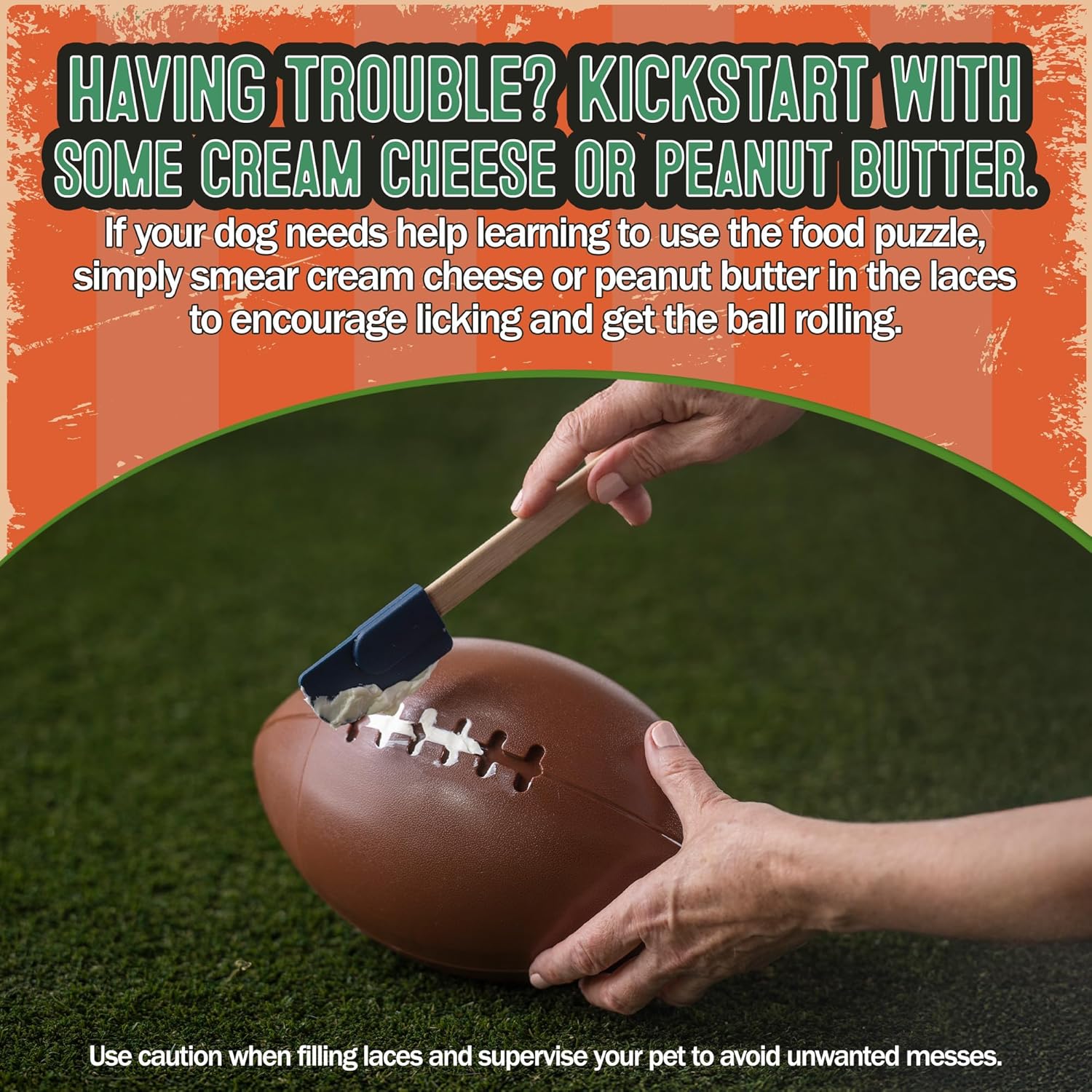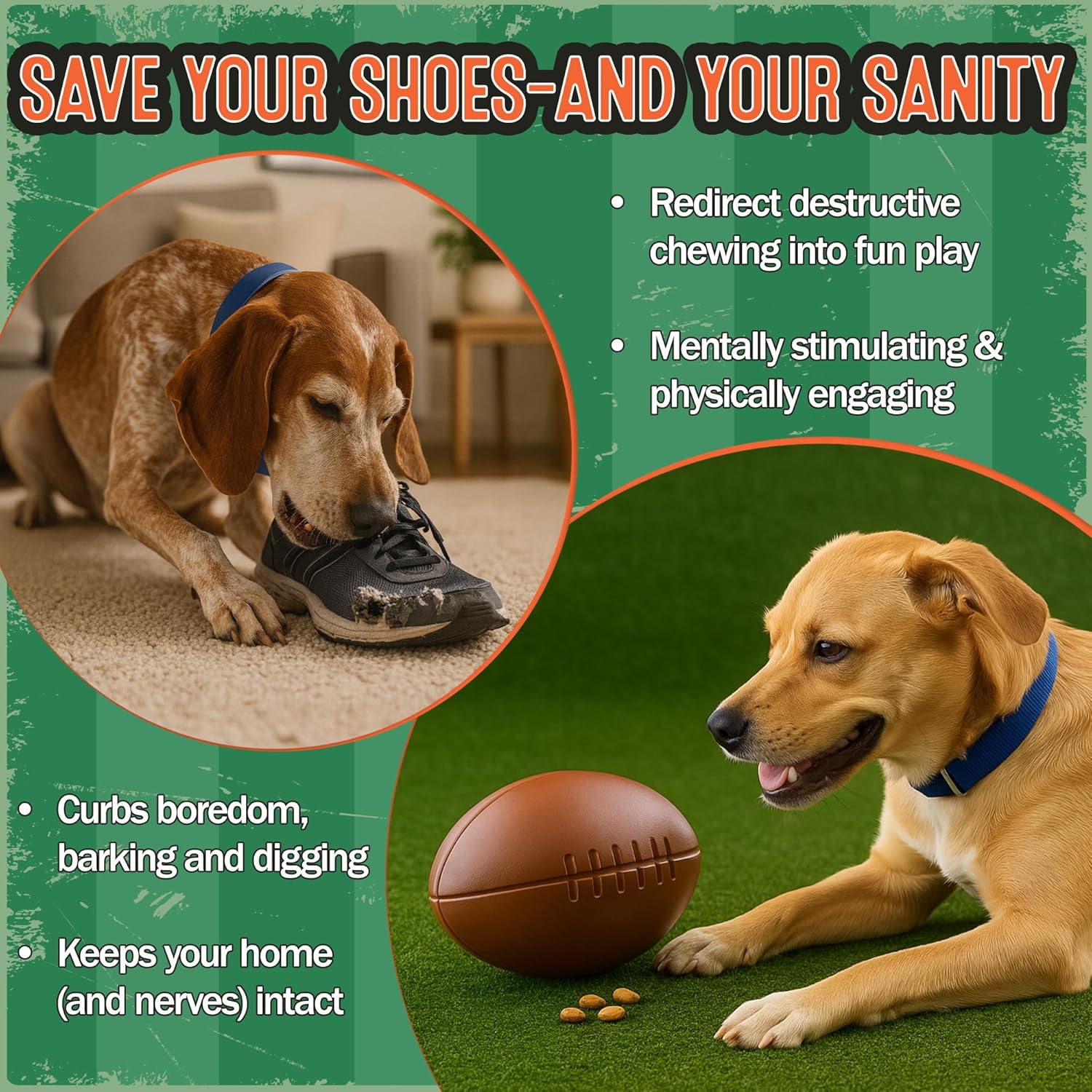 About this item HELP YOUR DOG FEEL SAFE, CALM, AND IN CONTROL. Anxious pups crave purpose—this vet-designed puzzle dog slow feeder satisfies their instinct to hunt and forage, easing nervous energy and promoting relaxed, confident behavior through mentally rewarding, focused play. END MEALTIME MAYHEM. If your dog devours food in seconds, this dog slow feeder bowl slows the pace by encouraging foraging, easing digestion, and helping prevent choking, bloating, and the anxiety that comes with rushed meals. TURNS FEEDING INTO FUN. This football-shaped puzzle transforms mealtime into a rewarding challenge—keeping your dog engaged, mentally stimulated, and emotionally fulfilled while developing focus, confidence, resilience and problem-solving skills. Your pup will love a new dog bowl slow feeder puzzle! SAVE YOUR SHOES—AND YOUR SANITY. Boredom turns dogs into destroyers. This mentally rich, physically engaging puzzle bowl for dogs satisfies their urge to chew, dig, and bark—redirecting wild energy into focused fun that keeps your home (and nerves) intact. SATISFY DOG’S NATURAL INSTINCTS to forage and chew with football interactive dog toy treat dispenser that keeps pups busy and rewarded, encouraging active play while dispensing kibble or treats for hours of fun and mental engagement. BUILT TOUGH FOR ENTHUSIASTIC CHEWERS, these durable treat dispensing dog toys withstand rough play while keeping your dog safely entertained and satisfied. VERSATILE TREAT TOYS FOR DOGS OF ALL SIZES. Perfect as training rewards or daily enrichment, these treat toys for dogs are designed for small breeds to large, keeping every pup challenged and happy. SLOW FEEDER DOG TOYS THAT IMPROVE DIGESTION. Our puzzle-style slow feeder dog toys turn mealtime into a healthier, more rewarding activity—helping prevent gulping, bloat, and indigestion in fast eaters. DOGS NEED A CHALLENGE. Let them find it with slow feeder dog toys and the design doubles as the best slow feeder dog bowl, combining durability with stimulating enrichment. Show more › See more product details