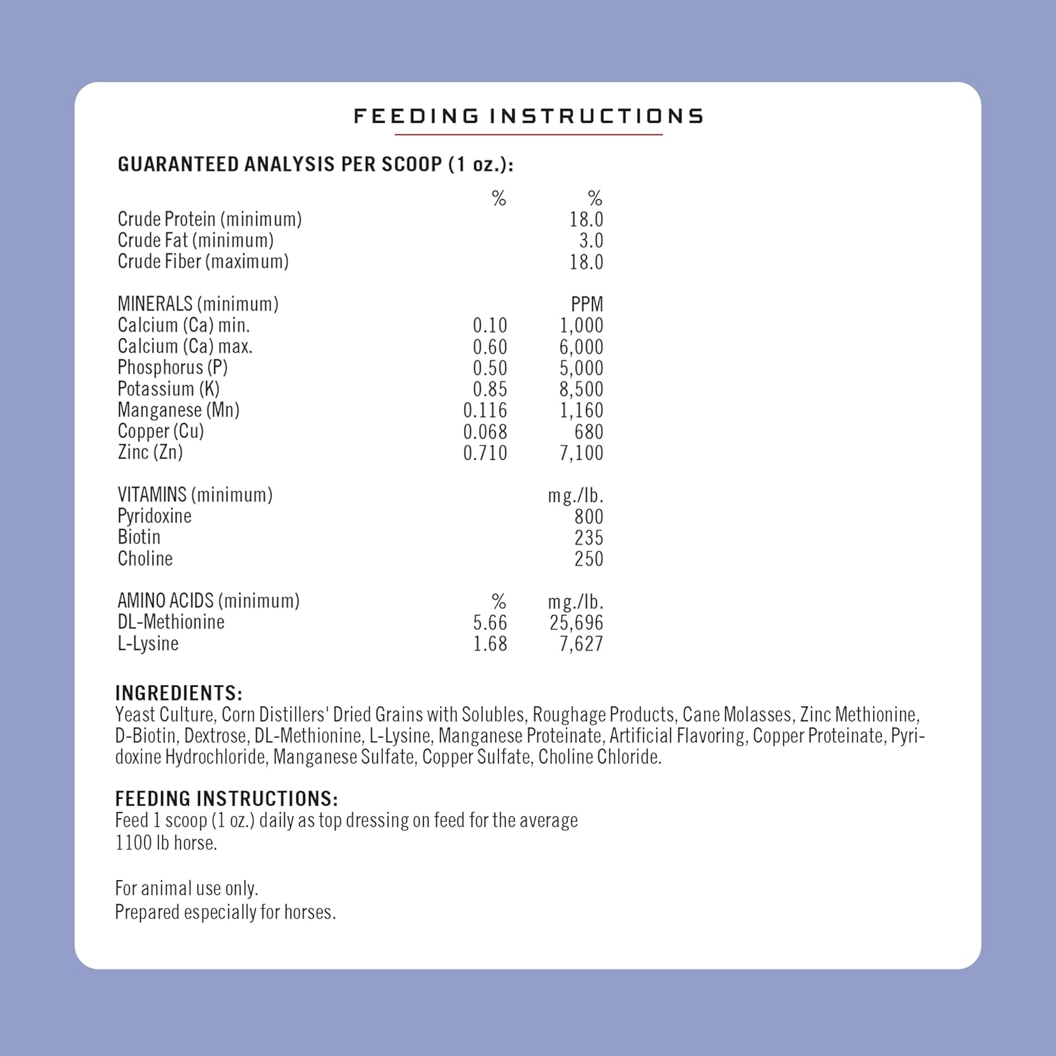 About this item COMPREHENSIVE SUPPORT - Nourish and treat cracking, crumbling, delaminating, or slow growing hooves with our complete formula. FARRIER & VET APPROVED - Our formula is veterinarian-formulated and recommended by farriers. It contains ingredients scientifically proven to help your horse grow and maintain healthy hooves. POWERFUL INGREDIENTS - Containing more ingredients than our competitors, our palatable pelleted formula contains D-Biotin, DL-Methionine, L-Lysine, calcium, and more! HELPS SKIN & COAT - Our recipe is rich in biotin, which also improves horses' skin and gives their coat a bright, natural shine. MADE IN THE USA - All of our products are manufactured in our facility in Colorado, since 1946. › See more product details