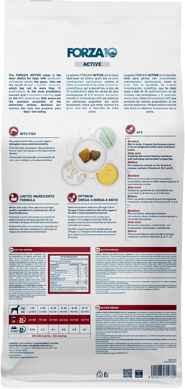 About this item TRUSTED ITALIAN NUTRITION: Pet food brand for dogs and cats, offering a wide range of recipes crafted with high-quality ingredients and veterinary expertise. Forza10 products are designed to support overall health and well-being, helping pets thrive at every stage of life. SUPPORTS SKIN & COAT: Nutritionally formulated pet food helps with allergies, sensitive skin, or sensitive stomach. Supports healthy skin and coat, reduces excessive shedding, and promotes overall immune health. INGREDIENTS: Made with fewer than 10 carefully selected ingredients to minimize food intolerances. Features hydrolyzed fish protein and Omega‑3–rich anchovy oil for a shiny coat, Aloe Vera, Burdock, and Mallow for anti-inflammatory and hydrating benefits, plus prebiotics, yucca schidigera, and antioxidants to support digestion and immunity. WHAT'S INCLUDED: 1 bag of premium dry dog food, 22 pounds, providing complete, high-quality nutrition to support your dog’s daily health and overall well-being. EXPLORE MORE: Discover our full range of premium cat and dog food recipes, crafted with veterinary expertise and high-quality ingredients. Visit the Forza10 store to find the perfect meals to support your pet’s health and well-being › See more product details