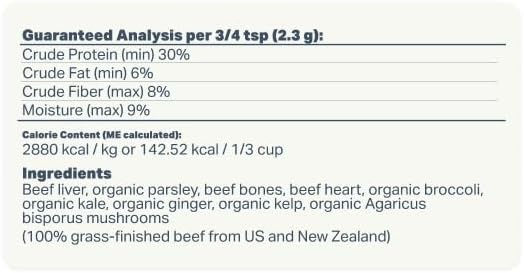 About this item Meat Mixer is a super premium base mix of grass-finished beef and organic veggies, carefully freeze-dried for maximum nutrient retention. Just add ground meats from your local farmer or grocery store for a complete meal that’s ready to serve in seconds. You choose the protein: Variety is the spice of life! Meat Mixer allows you to use beef, turkey, lamb or other proteins. Dogs love the taste: Picky eater? Meat Mixer contains a small amount of powdered veggies that mix with the meat to provide your dog with fiber and antioxidants. Keto-friendly: When mixed as directed, Meat Mixer contains less than 5% carbohydrate. Make ahead or à la cart: Mix a daily meal or mix the entire bag with 10 or 25 pounds of ground protein, freeze thaw and serve. Scientifically formulated: When mixed as directed, Meat Mixer meets or exceeds AAFCO nutritional requirements. 100% Whole Foods. No synthetic vitamins. All breeds, all ages: From puppyhood to seniors, minis to giants, Meat Mixer will support your dog for a lifetime. Over 50% beef inside: Protein is the most important part of your dog's meal. Meat Mixer provides your dog with natural bones and organs from 100% grass-fed beef. Serve cooked or raw: Meat Mixer can be gently cooked for dogs who can't eat raw foods. Show more › See more product details