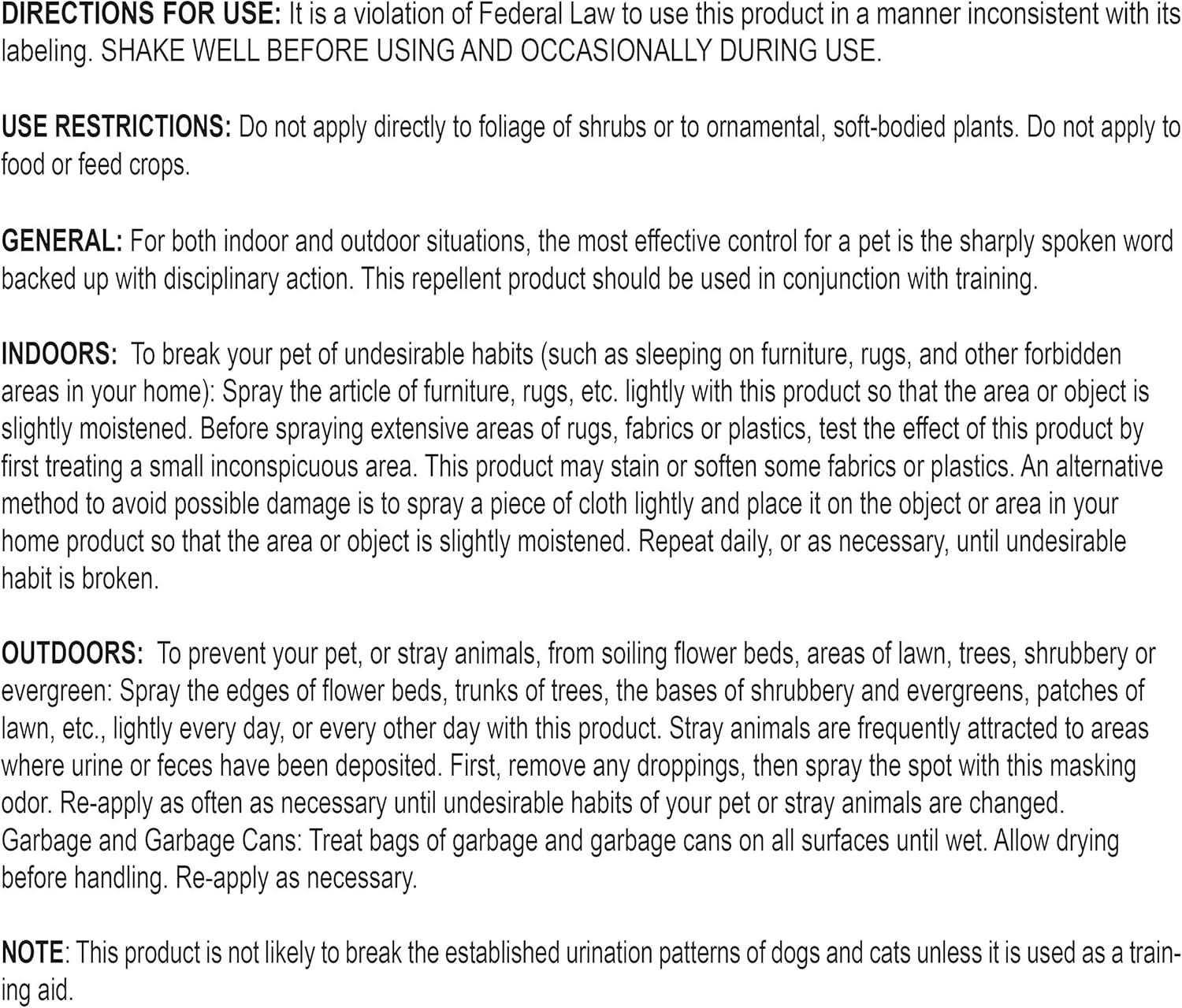 - Directions: It is in violation of Federal Law to use this produt in a manner inconsistent with its labeling. SHAKE WELL BEFORE USING AND OCCASIONALLY DURING USE. Do not apply directly to follage or shrubs or to ornamental, soft-bodied plants. GENERAL for both indoor and outdoor situations, the most effective control for a pet is the sharply spoken work backed up with disciplinary action. This repellent product should be used in conjunction with training. INDOORS To break your pet undesirable habits (such as sleepong on furniture, rugs, and other forbidden area in your home) Spray the article on furniture, rugs, etc. lightly with this product so that the area or object is slightly moistned. Before spraying extensive area of rugs, fabrics or plastics, test the effect of this product by first treating a small inconspicuous area. This product may stain or soften some some fabrics or plasics. An alternative method to avoid possible damage is to spray a piece of cloth lightly and place it on the object or area in your home to be protected. Repeat daily, or as necessary, until undesirable habit is broken. OUTDOORS To prevent your pet, or stray animals, from soiling flower beds, areas of lawn, trees, shrubbery and evergreens, patches of lawn, etc., lightly every day, or every other day with this product. Stray animals are frequently attracted to areas where urine or feces have been deposited. First, remove any droppings, then spray the spot with this masking odor. Re-apply as often as necessary until undesirable habits of your pet or stray animals are changed. Garbage and Garbage Cans Treat bags of garbage and garbage cans on all surfaces until wet. Allow drying before handling. Re-apply as necessary.