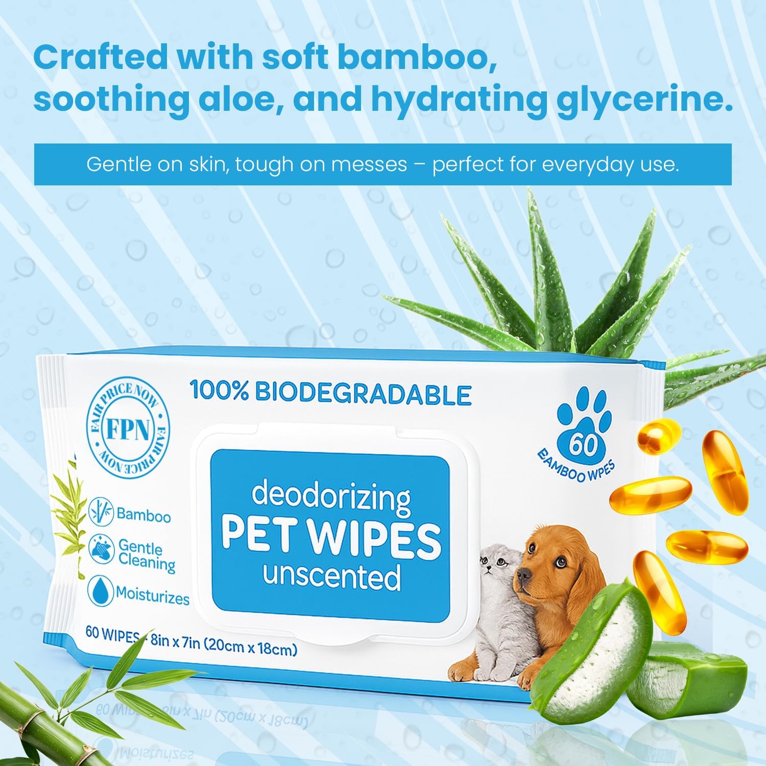 Keep your pet clean, comfortable, and smelling fresh with FPN Pet Wipes—the safe and plant-based grooming solution for daily use. Each wipe is made with soft, natural bamboo fibers and infused with gentle ingredients like aloe vera, glycerine, and plant-based alcohol to remove dirt, dander, and odors. Ideal for wiping muddy paws, freshening up after walks, or post-potty cleanup, these biodegradable wipes are fragrance-free, alcohol-free, and paraben-free, making them perfect for dogs and cats of all breeds and life stages. The extra-thick 8" x 7" design covers more with each use—great for full-body touchups, crate cleaning, or grooming between baths. Whether you're at home, traveling, or out at the park, FPN Pet Wipes give you the confidence of a gentle clean—without compromising your pet’s comfort or the planet.