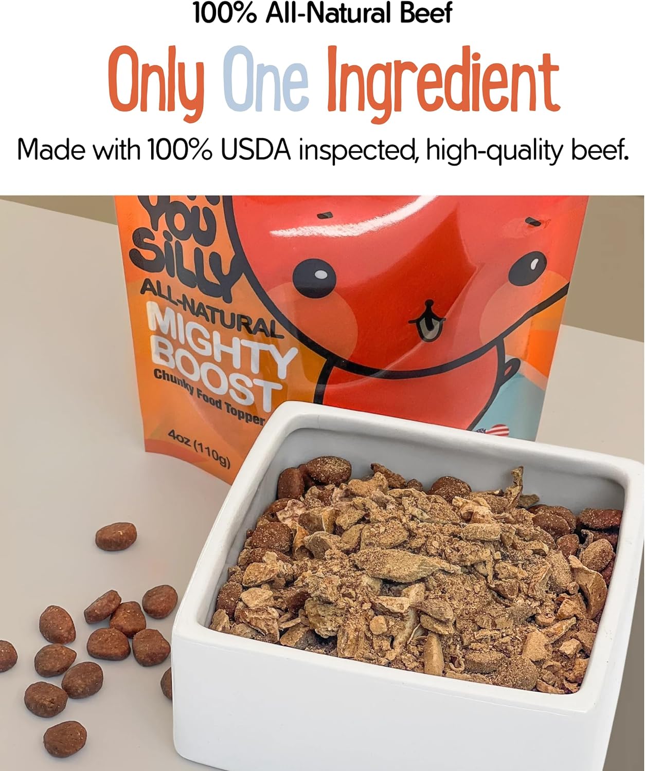 - Directions: Simply add a dash of our freeze-dried raw topper to coat their kibble to and add a little water to create a delicious gravy. Watch as our yummy treats expand into mighty chunks of beef, making mealtime more enjoyable for your furry friend.