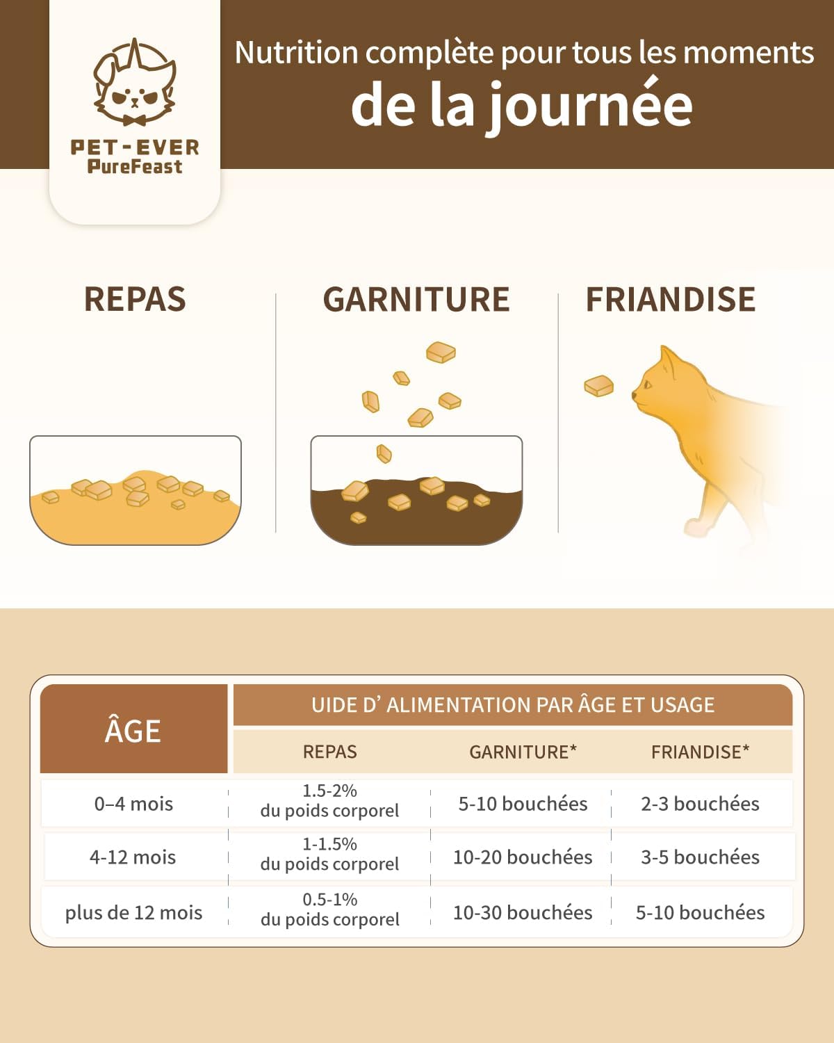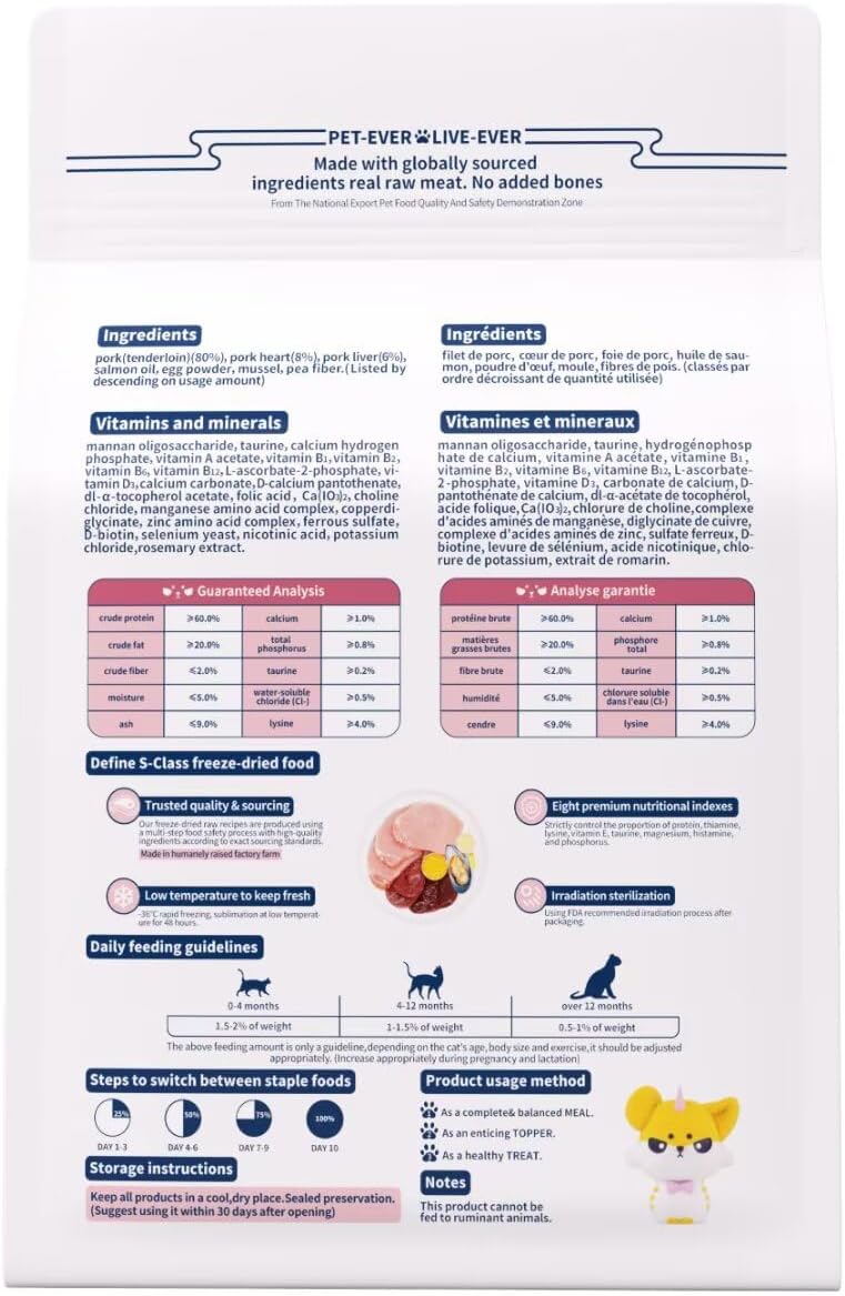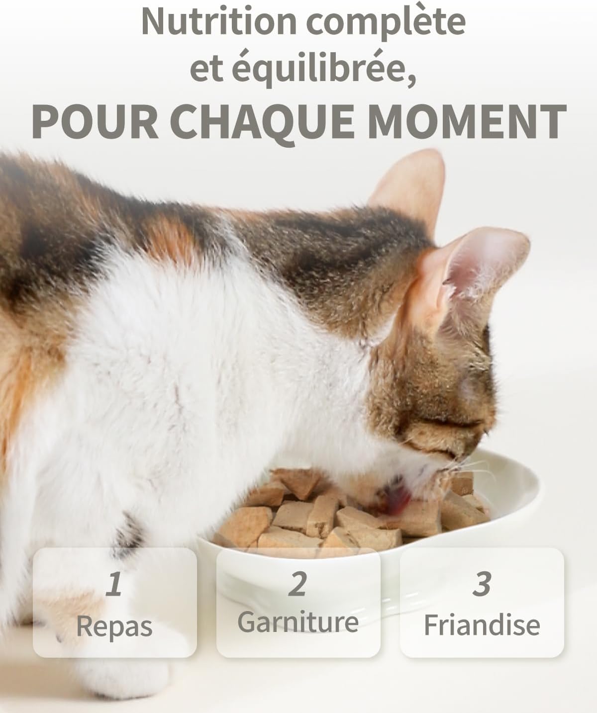 About this item 【97% animal ingredients – pure and simple】 We source high-quality animal origin to mirror what cats naturally crave. It’s real food, no compromises, giving your pet energy and strength to enjoy their daily adventures. 【Grain-free, easy-to-digest formula】 Cats thrive without grains, which is why we skip fillers and artificial extras. This means fewer digestive issues and a focus on clean, simple nutrition that works. 【Preserving raw nutrition the right way】 Freeze-dried to lock in nutrients without heat processing, our food gives the benefits of raw feeding with the convenience of shelf storage—no refrigeration required. 【Essential nutrients for total health】 Taurine for the heart, vitamins for skin and coat, and low magnesium for urinary care. It’s a complete, balanced diet made with transparency, so you know exactly what your cat is eating. 【Serve as a meal or a treat】 Use it however your cat likes: a full meal, a snack, or a topper. Flexible feeding means more ways to keep them happy, healthy, and engaged at mealtime. › See more product details