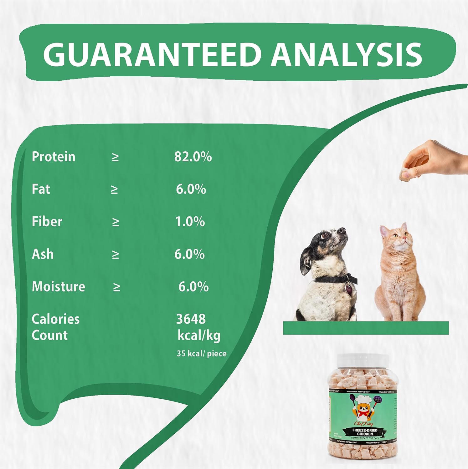 About this item 100% Human-Grade Chicken: Only premium, additive-free chicken – worthy of your own dinner plate. Our freeze dried chicken for pets uses nothing but fresh high-quality, additive-free meat that's easy to digest. Why Freeze Dried Chicken Treats? - Like people, animals crave natural sources of protein. Our freeze-drying process ensures each of our freeze dried treats for cats and dogs keeps the robust flavor and vital nutrients of fresh meat. Our treats are single Ingredient, No Additives: Healthy, all-natural treat for cats and dogs – no hormones, preservatives, or fillers. High-Protein & Nutrient-Rich: Freeze-drying locks in essential proteins and nutrients, supporting your pet’s health. Whether you use our freeze dried treats as a tempting topper or serve it as a standalone meal, your cat will love each bite. Cats and Dogs of all ages from the most playful kitten to the most serene senior can enjoy our freeze dried food Ethical Eats for Eco-Friendly Pets - Our promise is to make each treat free of added antibiotics and growth hormones. That's why we only use 100% free-range, grass-fed meats, and the freshest wild-caught seafood. Sustainable treats freeze dried have never tasted so good Simple Serving Suggestions - Serve our chicken treats straight from the pack with their usual meals for an added burst of flavor and nutrients. For pets who prefer a softer texture, our freeze dried treats can be easily rehydrated with warm water › See more product details
