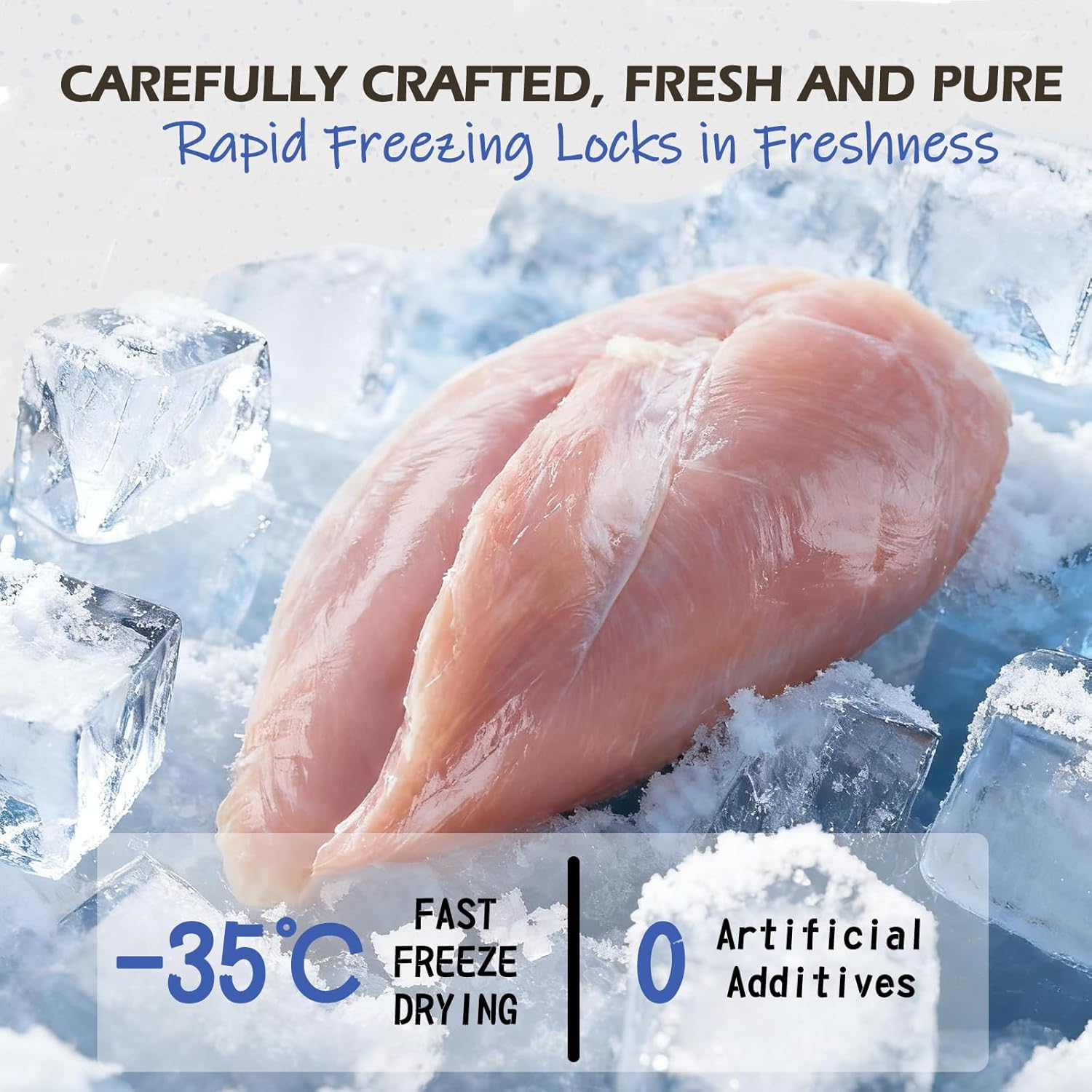 About this item OLMEXA selects premium whole chicken cuts for its Freeze Dried Raw Dog Food, centering on a high-quality chicken formula—this embodies the core of our freeze dried raw dog food. It restores pets' natural predatory diet, awakening their innate carnivorous instincts. Using low-temperature freeze-drying technology, our freeze-dried dog food perfectly locks in the original nutrition and flavor of raw meat. Rich in 40% high protein with concentrated nutrients, this freeze dried raw dog food serves as an efficient dog treat or dog food topper—each bite is a pure source of energy. With a crispy texture and quick rehydration, our freeze-dried dog food releases a natural meat aroma that stimulates appetite. As a versatile dog food topper, its high palatability easily wins over even the pickiest pets. Our freeze-dried dog food and dog food topper contain no colors, attractants, or preservatives. Olmexa believes that a truly reliable freeze dried raw dog food (and all our pet products) should start with a pure formula and end with a reassuring choice. Each container holds 3.88oz, making it easy to store. Olmexa’s premium chicken-formula freeze-dried dog food works as a staple garnish, or a training reward. › See more product details