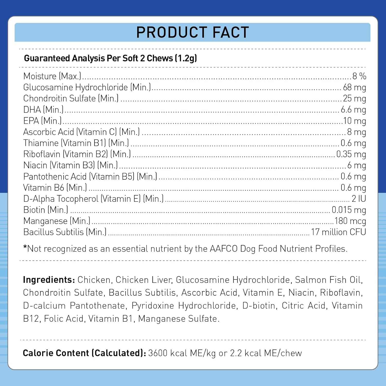 - Active Ingredients: Glucosamine Hydrochloride, Omega-3, Chondroitin Sulfate, Ascorbic Acid, Thiamine, Riboflavin, Niacin, Pantothenic Acid, D-Alpha Tocopherol, Biotin, Manganese, Bacillus SubtilisSee more