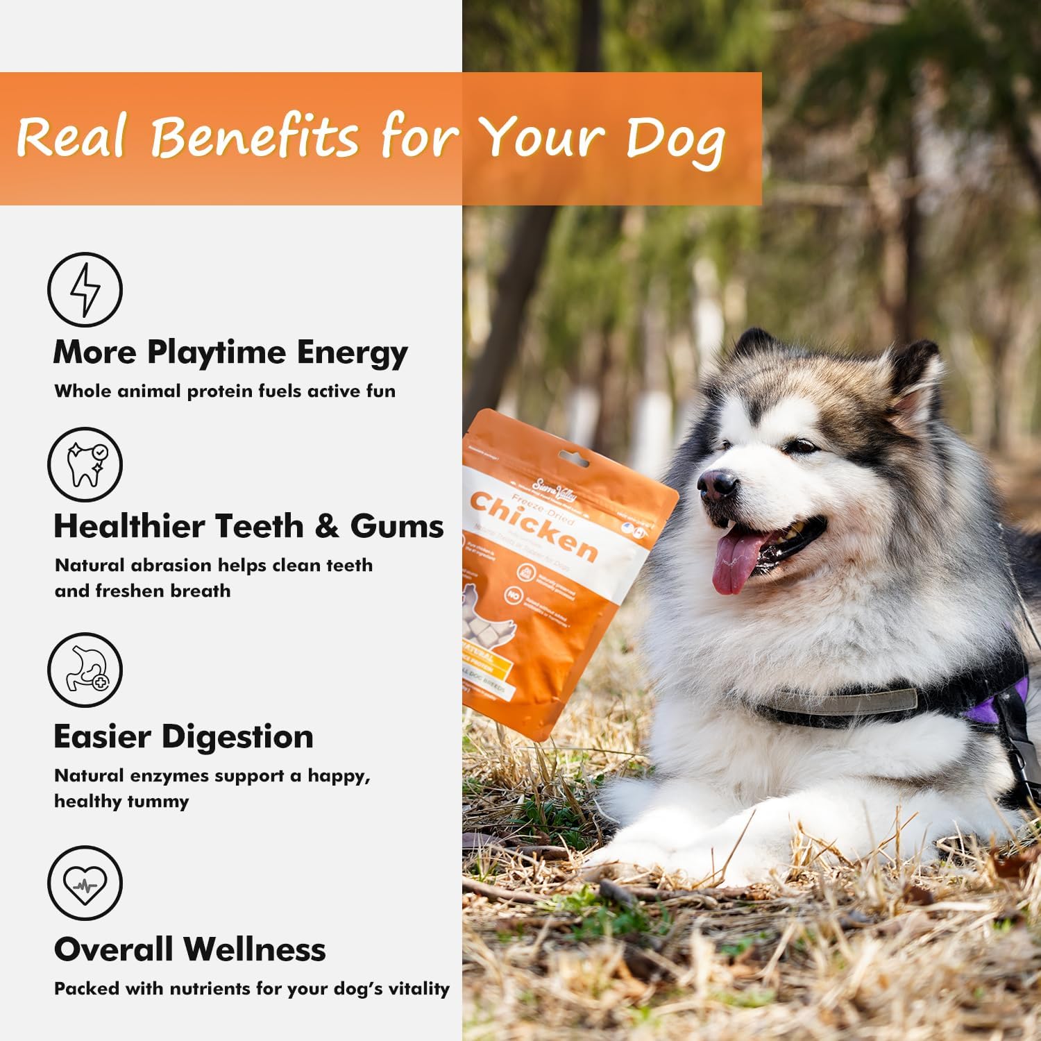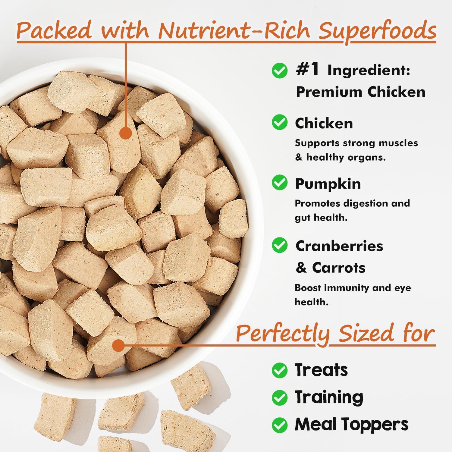 About this item 100% Pure Single Ingredient Dog Treat: Organic dog food dry is made with ONLY 100% freeze dried chicken breast/beef liver dog treats/salmon dog treats (varies by flavor) – no fillers, grain free, preservatives, or artificial additives. Gentle on allergy-prone dogs seeking hypoallergenic dog snacks Nutrient-Locked Freeze-Dried High Protein: Natural dog treats are slow-frozen at -40°F to preserve 98% nutrients and flavor. Lab-tested freeze dried raw dog food for purity – perfect as science diet dog food or maintaining lean weight in active dogs 2cm Perfect Cube Design: This uniform cubes freeze dried dog food for small breed dogs, medium (20-50 lbs) and puppy, can promotes healthy chewing habits, and works as ideal dog training treats or as a freeze dried dog food topper Skin and Coat Dog Food: Chicken: "Low-fat lean protein (98% protein content) supports weight management and muscle development."; Beef: "Rich in iron & zinc for energy-boosting and immune system health."; Salmon: "Infused with natural Omega-3 fatty acids for shiny coat and healthy skin." Freshness-Lock Resealable Packaging & Made in the USA: Heavy-duty resealable bag keeps treats crunchy for 18 months. Made in California with USA-sourced ingredients and recyclable materials –our dehydrated dog food trusted by 500k+ dogs nationwide › See more product details