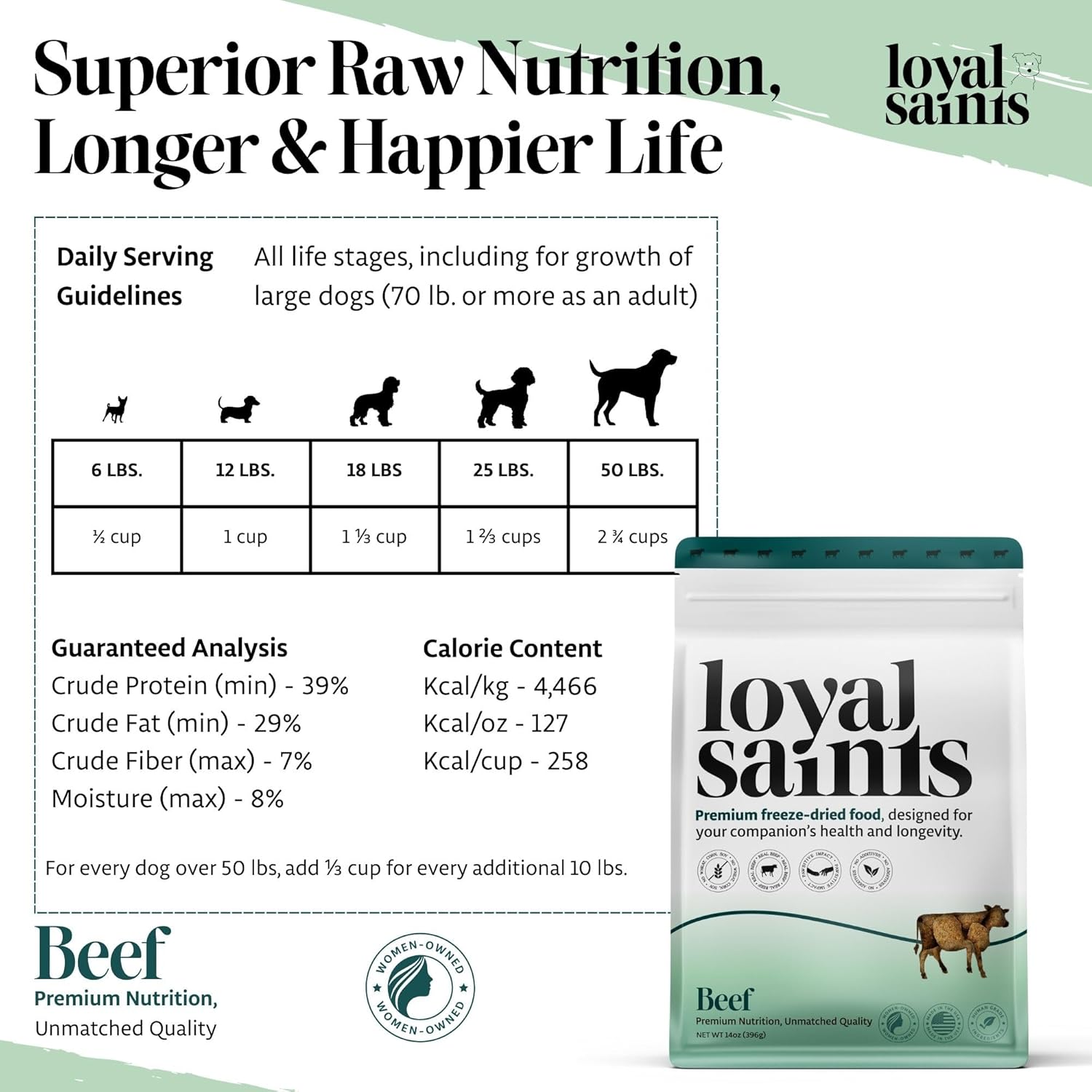 About this item PREMIUM FREEZE DRIED RAW DOG FOOD: Made with cage-free beef raised without antibiotics, steroid, or added hormones. This dog food is crafted with USDA-certified organic fruits and vegetables in a dog food grain free formula. This dried dog food is made in the USA with natural ingredients. This dog food organic contains no corn, wheat, soy, lentils, or legumes. High-protein, minimally processed option that provides superior nutrient absorption compared to traditional kibble for your dog's health. PICKY EATERS FAVORITE DOG FOOD: Dogs that have refused all other foods eagerly devour these raw beef nuggets. Watch your dog dance at mealtime, cry when the package opens, and dive face-first into their bowl. This freeze dried dog food is ideal for picky eaters who turn their nose up at everything else but will do anything for these delicious freeze dry dog food. This grain-free dry dog food is made with real beef for wholesome taste that even the most selective dogs cannot stop eating. NATURAL INGREDIENTS FOR DOGS: This organic dog food has high protein formula supports optimal weight, skin & coat health, oral & eye health, and reduced stool volume. This dog food freeze dried is made from real beef, this high protein dog food dry offer wholesome nutrition with superior nutrient absorption. Grain-free dog treats recipe is suitable for dogs with sensitivities. Minimally processed to retain natural nutrients and provide a healthier alternative from standard kibble for your dog. VERSATILE DEHYDRATED DOG FOOD OPTIONS: Suitable for daily meals, dog meal topper, dog training treats, or dog snacks between meals. Complete and balanced meal option that works for dogs of any size. This grain free dry dog food can be simply use as dog training food or crumble over existing kibble for a taste level up. These freeze dried beef treats for dogs are ideal for multiple feeding purposes whether you need a complete meal replacement or just want to level up your dog's food routine. CONVENIENT FREEZE DRY DOG FOOD STORAGE: This freeze dried beef dog food can be simply crumble over kibble for instant taste level up or rehydrate with warm water for complete dog meal. Ideal for travel, backpacking, and on-the-go feeding with no refrigeration needed. This healthy dog treats is the hassle-free alternative to homemade raw diets without sacrificing quality. Just store, serve, and watch your dog enjoy. Easy preparation makes feeding simple whether at home or away from home. › See more product details