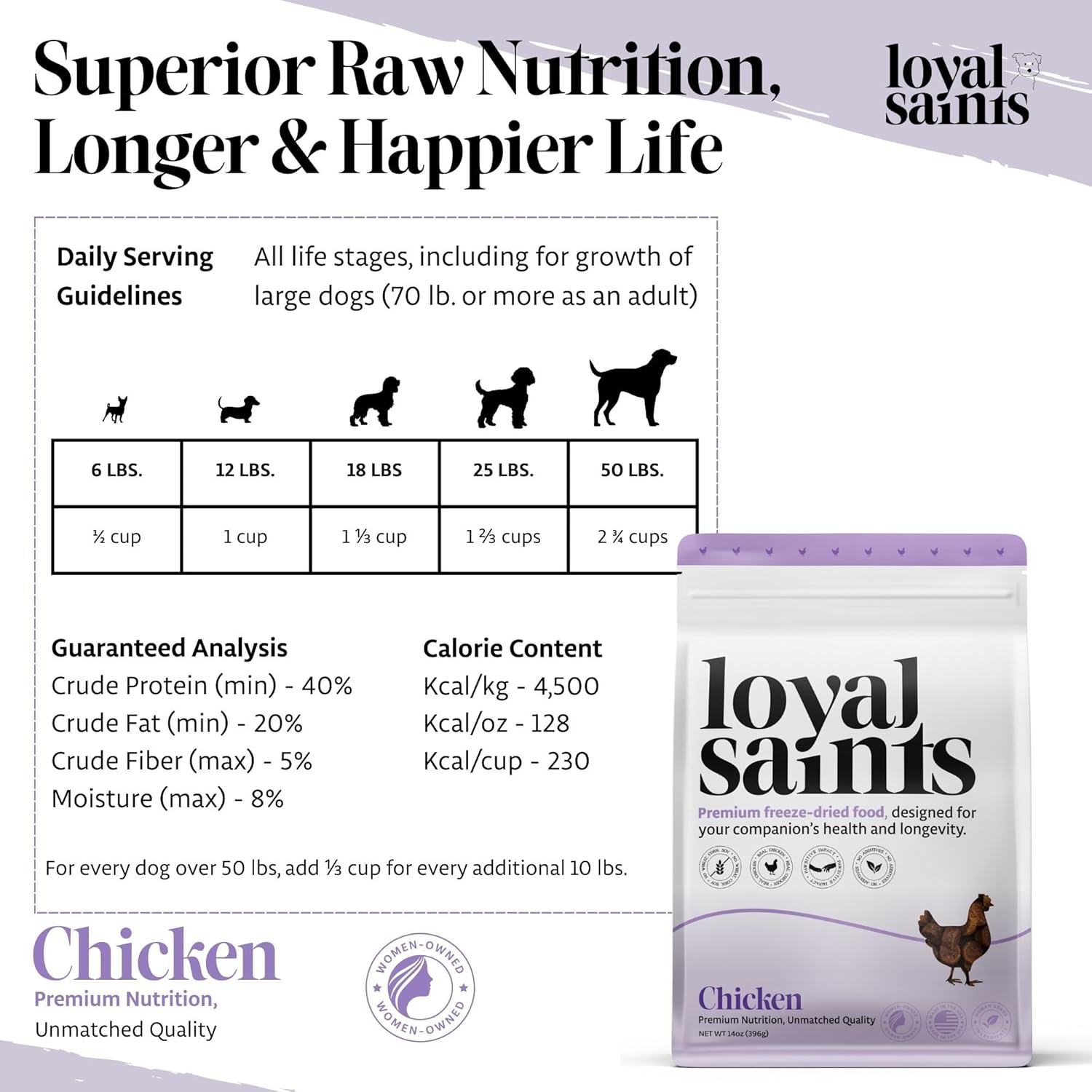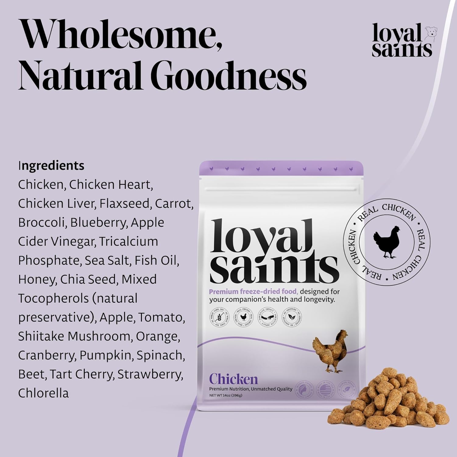 About this item PREMIUM FREEZE-DRIED DOG FOOD: Made with cage-free chickens raised without antibiotics, steroid, or added hormones. This dog food is crafted with USDA-certified organic fruits and vegetables in a grain free dog food formula. This dog food premium freeze dried chicken flavor is made in USA with natural ingredients. This dog food organic contains no corn, wheat, soy, lentils, or legumes. This high protein dog food and minimally processed option for superior nutrient absorption and greater health. PICKY EATERS FAVORITE DOG FOOD: Dogs that have refused all other foods eagerly devour these raw chicken nuggets. Watch your dog dance at mealtime, cry when the package opens, and dive face-first into their bowl. This freeze dried raw dog food is ideal for picky eaters who turn their nose up at everything else but will do anything for these delicious freeze dried chicken for dogs. This dog food grain free is made with real chicken for a wholesome taste that even the pickiest dogs can’t avoid. MADE FROM CHICKEN BREAST: This organic dog food dry has high protein formula supports optimal weight, skin & coat health, oral & eye health, and reduced stool volume. This dog food freeze dried is made from real chicken, this high protein dog food dry offer wholesome nutrition with superior nutrient absorption. Grain-free dog treats recipe is great for dogs with sensitivities. Minimally processed to retain natural nutrients and provide a healthier alternative from standard kibble for your dog. VERSATILE DEHYDRATED DOG FOOD OPTIONS: Suitable for daily freeze dried meals, dog meal topper, dog training treats, or dog snacks. Complete and balanced meal option that works for dogs of any size. This grain free dry dog food can be simply use as dog training food or crumble over existing kibble for a taste level up. These freeze dried chicken treats for dogs are ideal for multiple feeding purposes whether you need a complete meal replacement or just want to level up your dog food routine. CONVENIENT DOG FREEZE DRIED FOOD STORAGE: This freeze dried dog food made from chicken breast can be simply crumble over kibble for instant taste level up or rehydrate with warm water. Ideal for travel, backpacking, and on-the-go feeding with no refrigeration needed. This healthy dog treats is the hassle-free alternative to homemade raw diets without sacrificing quality. Just store, serve, and watch your dog enjoy. Easy preparation makes this dog food simple whether at home or away from home. › See more product details
