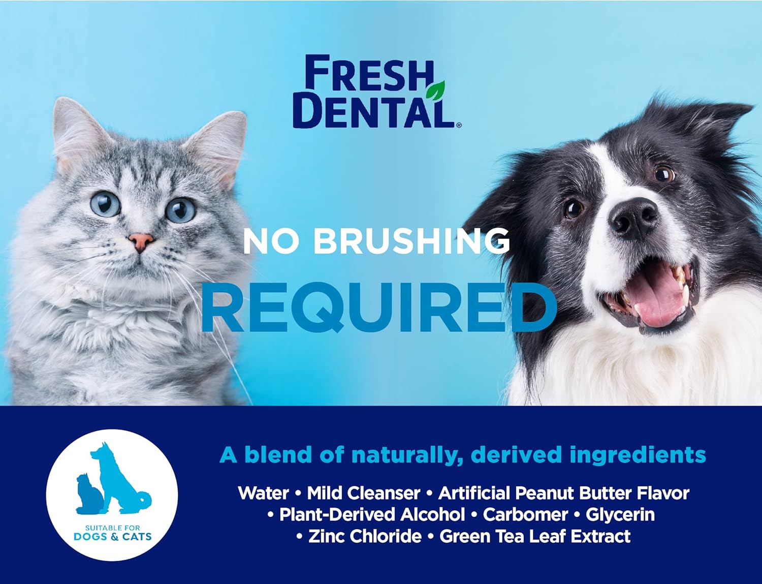 About this item EFFECTIVE PET ORAL CARE - this specially formulated pet dental gel helps fight bad dog breath, cat breath, and provide protection against the formation of plaque and tartar buildup. See cleaner teeth in 30 days or less, with daily use as directed. Available in both fresh mint and peanut butter flavor. (sold separately) INGREDIENTS YOU CAN TRUST - a proprietary blend of naturally derived ingredients to produce a healthy oral environment. This Fresh Dental Gel includes: Water, Mild Cleanser, Artificial Peanut Butter Flavor, Plant-Derived Alcohol, Carbomer, Green Tea Leaf Extract, Glycerin, Zinc Chloride ALL IN ONE CARE - support your pet’s dental hygiene with Naturél Promise pet dental care products; Made in the USA with quality product safety standards, eco-friendly packaging, and plant-based ingredients. Add it to your dog dental kit or cat dental care kit SAFE TO USE FOR DOGS & CATS - both your furry friends can benefit with this teeth cleaning gel for dogs or cats. Provides fresh breath for dogs, an effective plaque remover, and great to use for dog teeth cleaning, cat teeth cleaning, gingivitis treatment, Periodontal disease HELPS FRESHEN BREATH, NO BRUSHING REQUIRED - since a lot of pets don’t enjoy having their teeth brushed, dental gel for pets can be the perfect substitute. Safely remove plaque and tarter by applying 2 drops to each side of the mouth once daily. No enzymes, added sweeteners, sorbitol, or dyes › See more product details