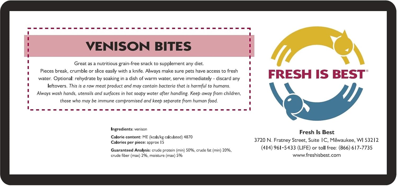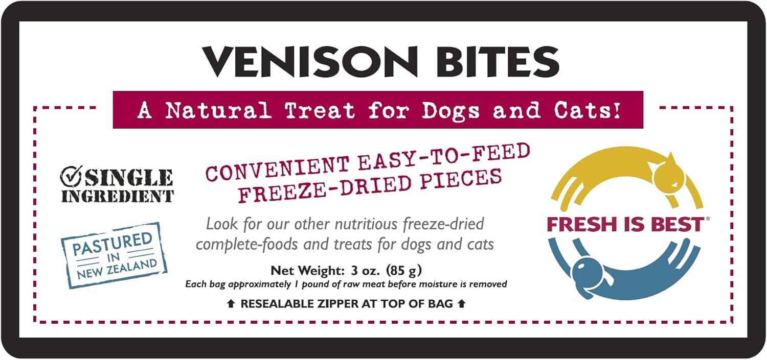 Give your pets the best with Fresh Is Best Venison Bites small batch freeze dried dog food for dogs and cats. Made with just premium venison meat, these dog food freeze dried treats are perfect for those seeking to provide their pets with nutritious, minimally processed snacks. These all-natural dehydrated dog treats are perfect for pets of all ages and sizes. Whether you're rewarding your pet during training, providing a healthy snack, or using them as a meal supplement while traveling or boarding, these dog treats freeze dried support your pet's overall well-being. Our 100% USDA venison meat is freeze-dried to preserve every bit of flavor and nutrients, providing your dog or cat with a venison jerky treat that’s not only delicious but also nourishing. Because they are made from premium meat, these dog training treats small dogs help maintain a healthy diet and fit perfectly into the grain-free or raw diet lifestyle. You can feel confident knowing these dog toppers for dry food provide your pets with the purest, most wholesome nutrition available. Unlike traditional treats that can be filled with artificial flavors and preservatives, each piece is carefully freeze-dried in small batches to lock in the nutrients, making it a healthy, nutrient-dense treat your pet will love. The unique vacuum-sealed packaging ensures every bag maintains its freshness, and our high-oxygen barrier prevents spoilage, meaning no more stale treats. Whether you’re feeding a playful puppy, a senior dog, a curious kitten, or a finicky adult cat, our freeze dried cat treats are designed to suit the needs of all life stages. These one ingredient dog treats can be served as-is for a quick, crunchy bite or rehydrated with water for a softer treat. The versatility makes it ideal for pet training, keeping your furry friend focused and motivated with a delicious reward.