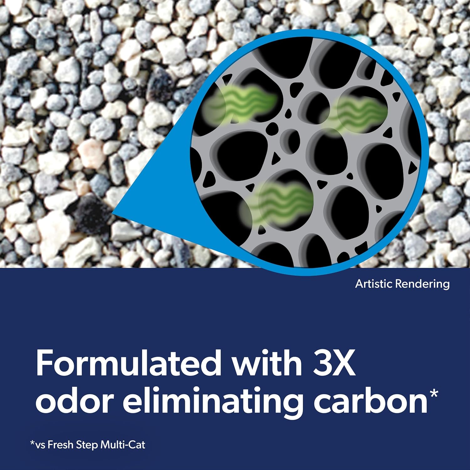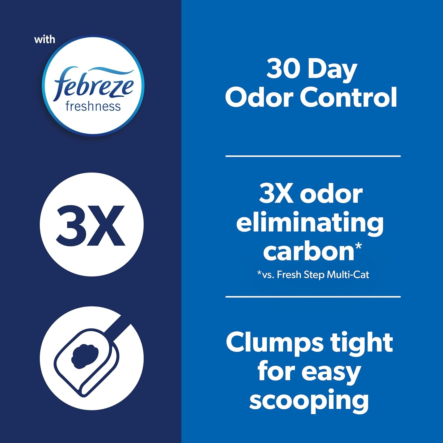 Keep your home fresh and your cat happy with Fresh Step Advanced Heavy Duty Clumping Litter. Powered by Febreze and black carbon odor shield granules, this clumping cat litter has 3X odor-eliminating carbon (1) and neutralizes odors as soon as they occur, keeping litter boxes fresh and clean. Enjoy 30 days of guaranteed odor control (2) with this Fresh Step litter—Fresh Step's longest odor-fighting formula yet (3). This Fresh Step Heavy Duty Cat Litter also has naturally-strong clay plus built in odor defense and ClumpLock technology that forms tight, easy-to-scoop clumps around liquid and cat urine. This makes cleaning the litter box a simple, hassle-free process. Plus, the low-dust formula helps keep your floors and kitty litter box area cleaner. Enjoy more catnaps and cuddle time with your kitty when you choose Fresh Step cat litter. (1) vs. Fresh Step Multi-Cat (2) See package for more information on terms and conditions (3) Among Fresh Step clumping litters
