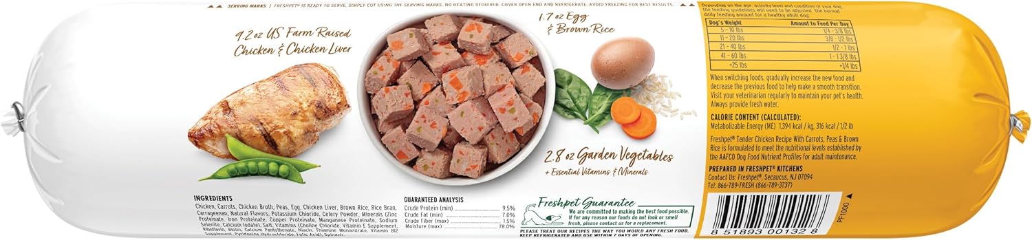 At Freshpet, we believe pets deserve real, nourishing meals made from fresh, wholesome ingredients-just like the food we enjoy. Fresh from the fridge our Tender Chicken Recipe Slice & Serve Roll is crafted with premium ingredients to nourish your dog. Featuring US farm-raised chicken, this recipe is gently steam-cooked to preserve essential nutrients. Enriched with vitamin-packed peas and carrots and high-fiber brown rice, this recipe provides key minerals and energy to promote healthy digestion and support eye health, contributing to your dog’s overall well-being. Conveniently packaged in a slice-and-serve roll, this is the next best thing to a homemade meal that is healthy for your dog. Pets, People, and the Planet are central to everything we do at Freshpet. Our mission is to bring fresh, real food to pets, helping them live their longest, happiest, and healthiest lives. We use simple, healthy ingredients, gently steaming each meal to retain its natural goodness and provide essential nutrients the essential nutrients dogs and cats need to lead their happiest, most tail-wagging lives.
