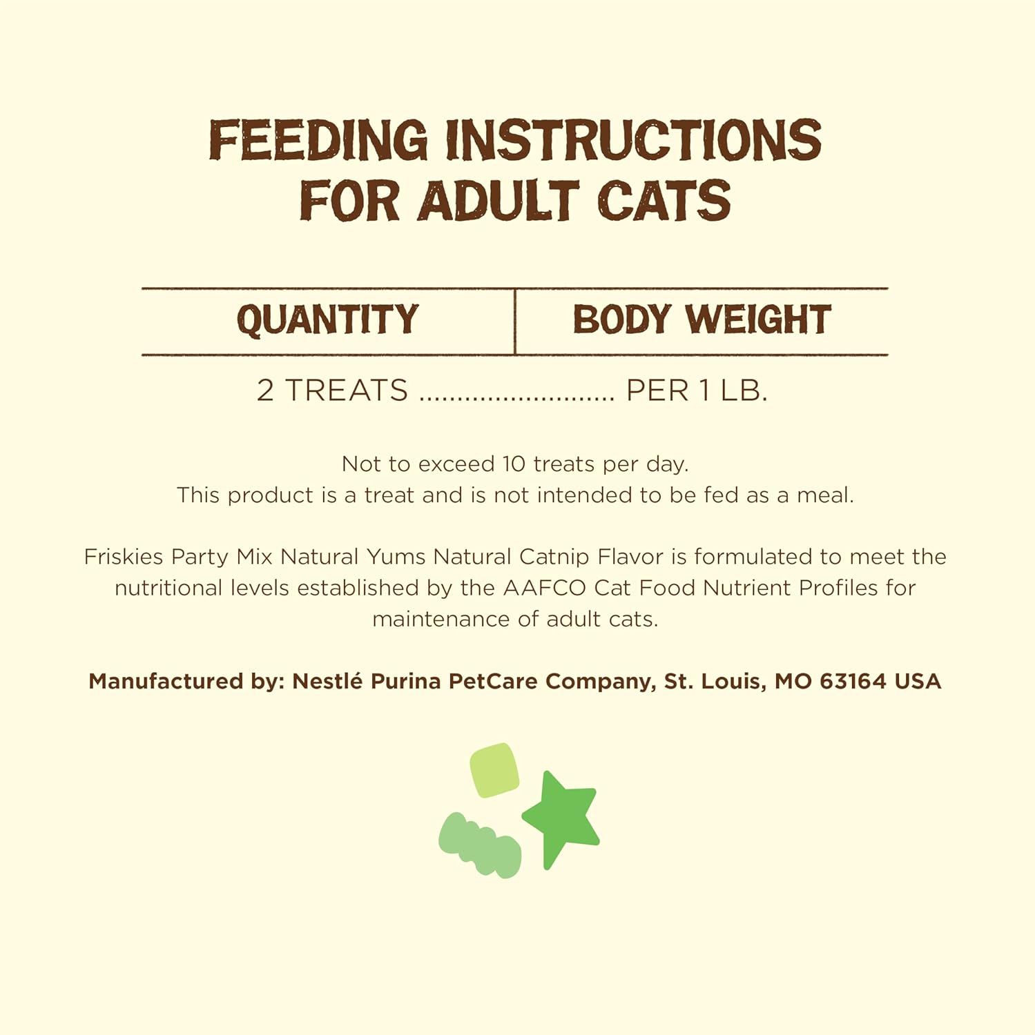 - Directions: Feed as a treat to your adult cat. This product is a treat and is not intended to be fed as a meal. Feed 2 treats for each 1 pound of body weight, not to exceed 10 treats per day. The caloric intake from treats should not exceed 10% of a cat's total daily caloric requirement. If treats are given, the amount of food should be reduced accordingly. Provide adequate fresh water in a clean container daily. For your pet's health, see your veterinarian regularly.