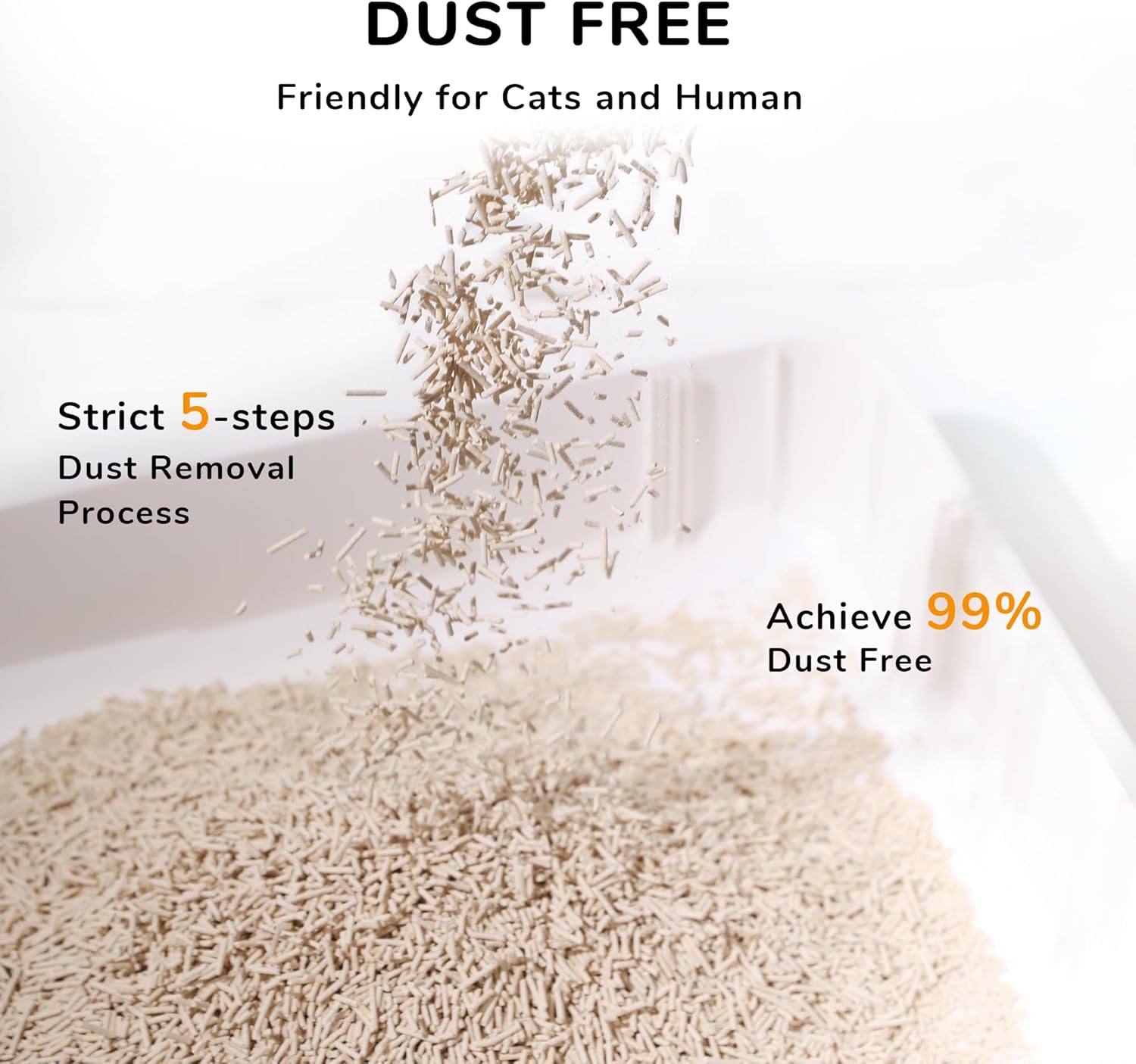 • Dust Free Cat Litter FUKUMARU cat litter is ideal for cats and owners who suffer from allergies with dust-free and hypoallergenic litter formulation. Through five refined dust-removal processes, the dust content of our cat litter is less than 0.5%, effectively protects the cats from respiratory and liver problems, effectively reduces respiratory irritation for both humans and pets.