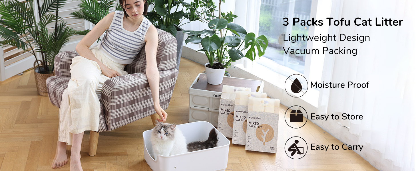 About this item NATURAL INGREDIENTS Cat Litter: 80% tofu litter and 20% natural deodorized apple wood, unscented cat litter without pigments or fragrances, making it ideal for sensitive cats and owners with fragrance sensitivities. Pure plant raw materials make this cat litter safe and environmentally friendly for pets, people and plants. DUST FREE & LOW TRACKING: FUKUMARU cat litter is ideal for cats and owners who suffer from allergies with 99.9% dust-free and hypoallergenic litter formulation. Effectively protects the cats from respiratory and liver problems. A combination of 100% premium texture tofu litter and natural apple wood litter pellets for maximum clumping creates just the right size, helps kitty paws & floors stay clean. QUICK CLUMPING & FLUSHABLE: 2-seconds absorption & 3-seconds cat litter clumping. It forms tightly, clumps quickly, scoop easily because of its anti-stick feature. The FUKUMARU kitty litter is biodegradable. The cat tofu litter can be flushed away in the toilet, saving your time. (Reminder: Please do not flush too much litter once a time.) 24/7 ODOR CONTROL: We add apple wood pellet which is the natural cat litter deodorizer, ensuring the litter box remains fresh and odor-free for longer periods. Mixed 80% soy cat litter and deodorant particles, the tofu cat litter can absorb the urine quickly and reduce unpleasant smell. Keep your home smelling fresh. EASY TO STORE: The lightweight tofu cat litter is easier to carry. No need to worry about moisture caused by long-term exposure after unpacking, storage is no longer a problem. Suitable for most kinds of pets and cats litter boxes. › See more product details