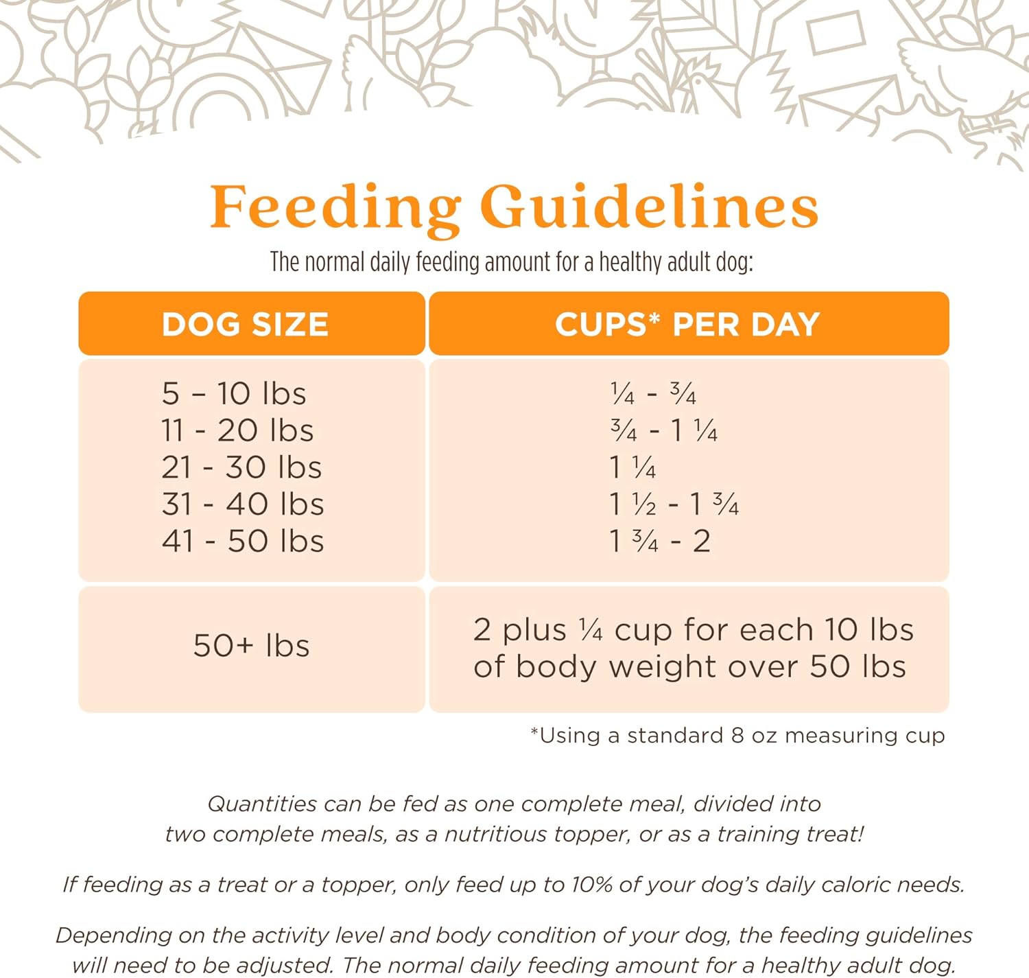 - Directions: Cups per Day by Dog Weight 5-10lbs 1/4 - 3/4 cups; 11-20lbs 3/4 - 1 1/4 cups; 21-30lbs 1 1/4 cups; 31-40lbs 1 1/2 - 1 3/4 cups; 41-50lbs 1 3/4 - 2 cups; 50+lbs 2 cups plus 1/4 cup for each 10lbs of body weight over 50lbs