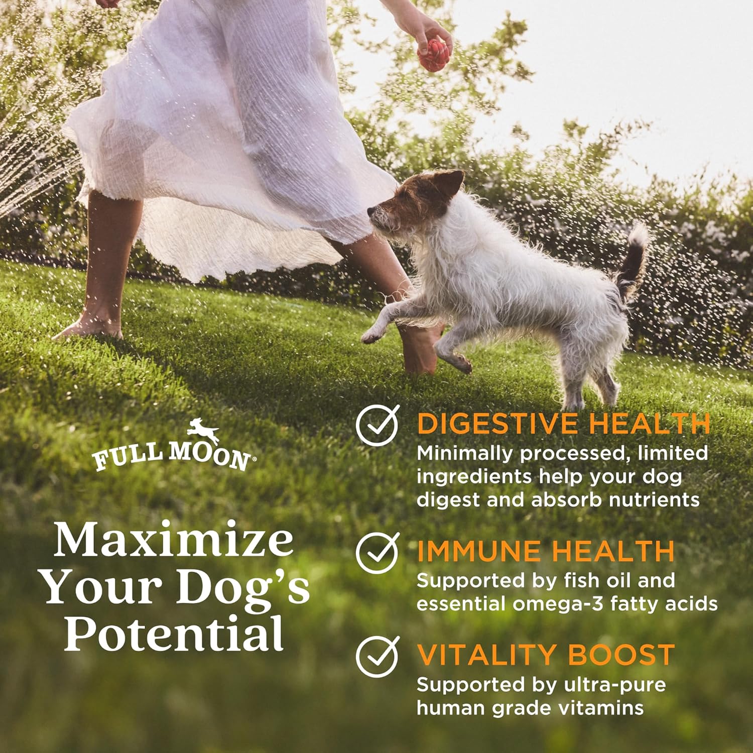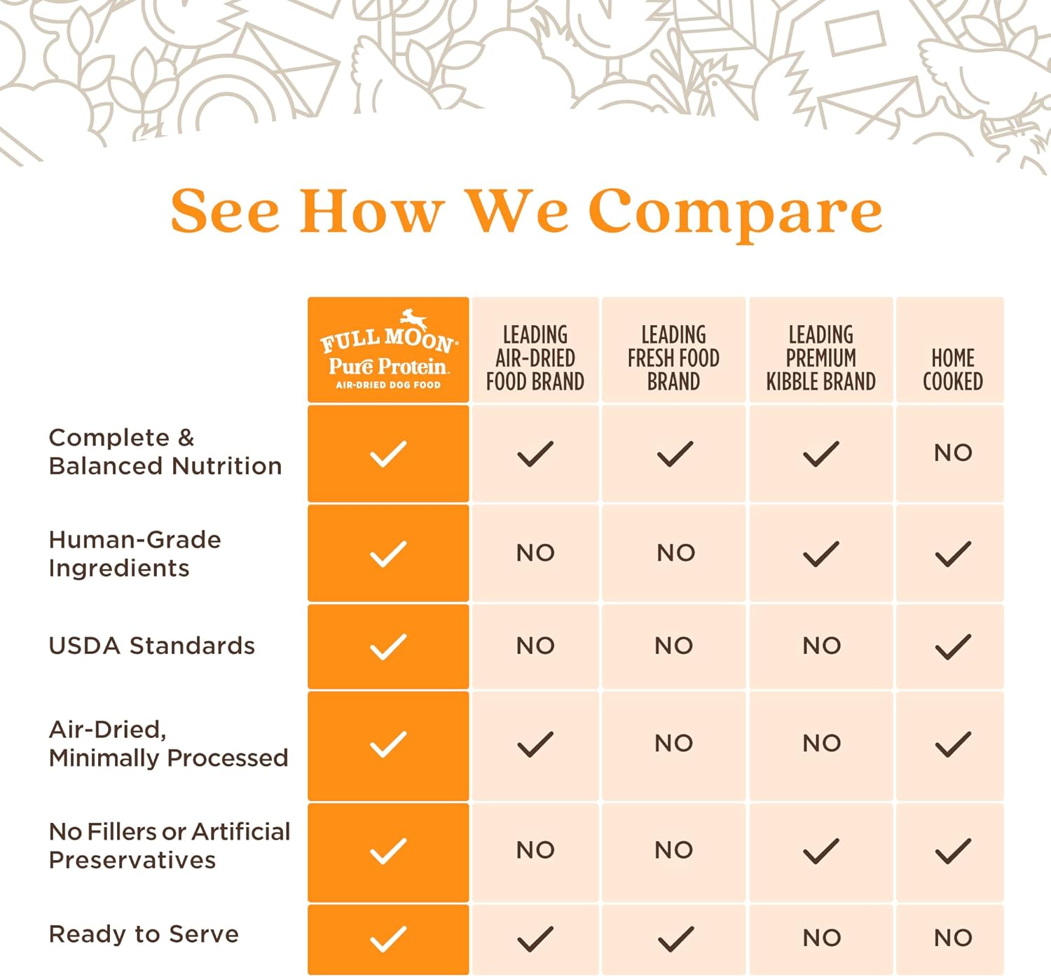 FULL MOON started with a mission to feed your dog the same nourishing ingredients youíd feed yourself. We believe if it isnít good enough for us, it isnít good enough for our pets. Thatís why we begin at the source with humanely raised protein from Perdue Family Farms and make our food with 100% Human Grade ingredients, following quality standards made for people food. What makes our food special? Nutrient-rich & digestible: Air drying naturally retains more vitamins and minerals due to its minimal processing, helping your dog to digest. More nutrient absorption, less waste (to pick up!). As easy and convenient as kibble: Experience the benefits of fresh dog food with the convenience of dry. Easy to store, scoop, and serve without handling raw food. Our Air Dried is like kibble, but better! Protein from free range chicken: chicken makes up 90% of our recipe- no rendered meals or pea proteins ñ so your dogs get the essential amino acids they need from high quality pieces of meat you can see. The flavor dogs love: Our air-dried process locks delicious flavor into tender-jerky style bites without the use of fillers or artificial preservatives. Let your dog taste the difference.